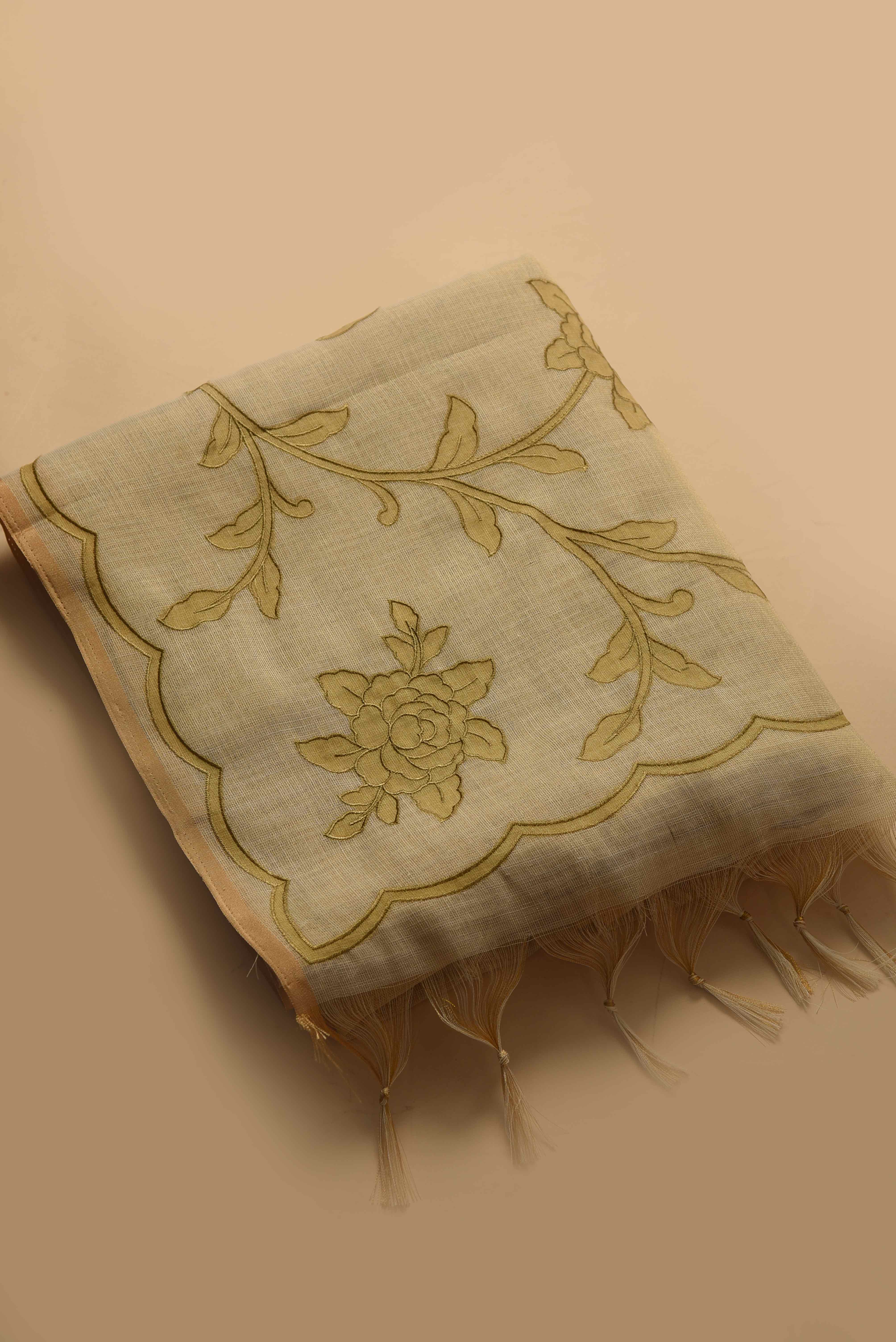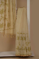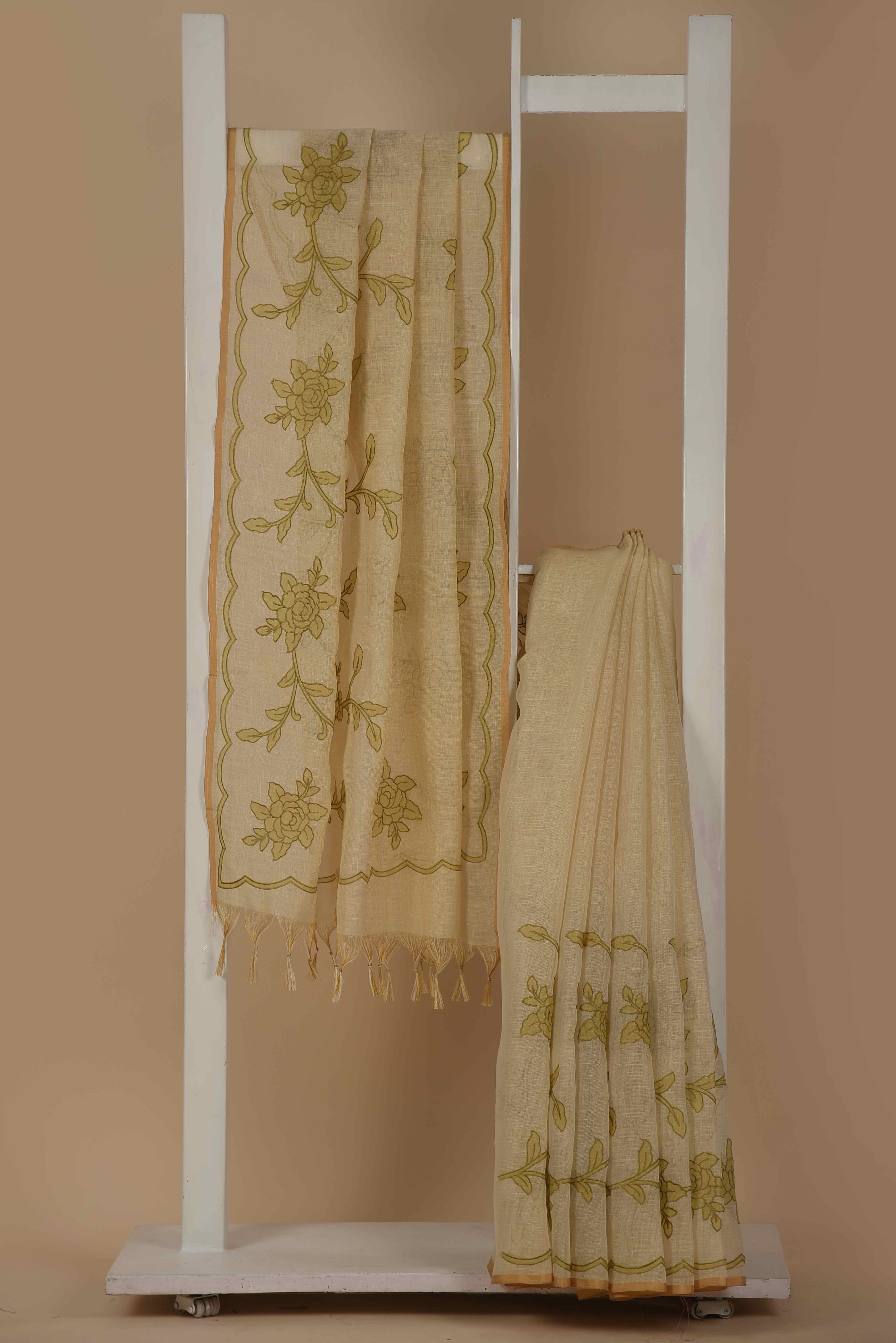 Beige With Green Linen Blend Embroidered Saree with Linen Embroidered Blouse