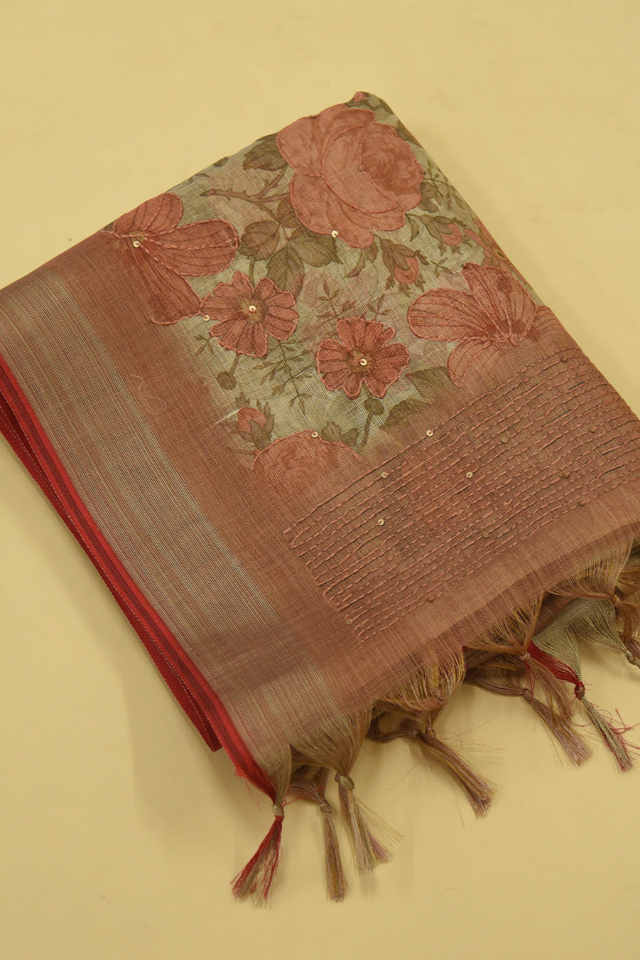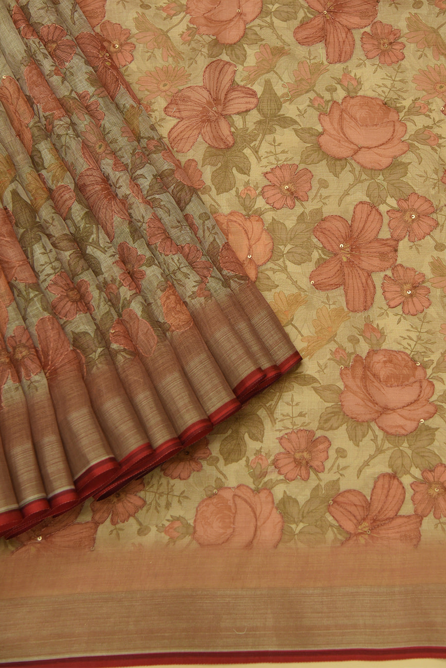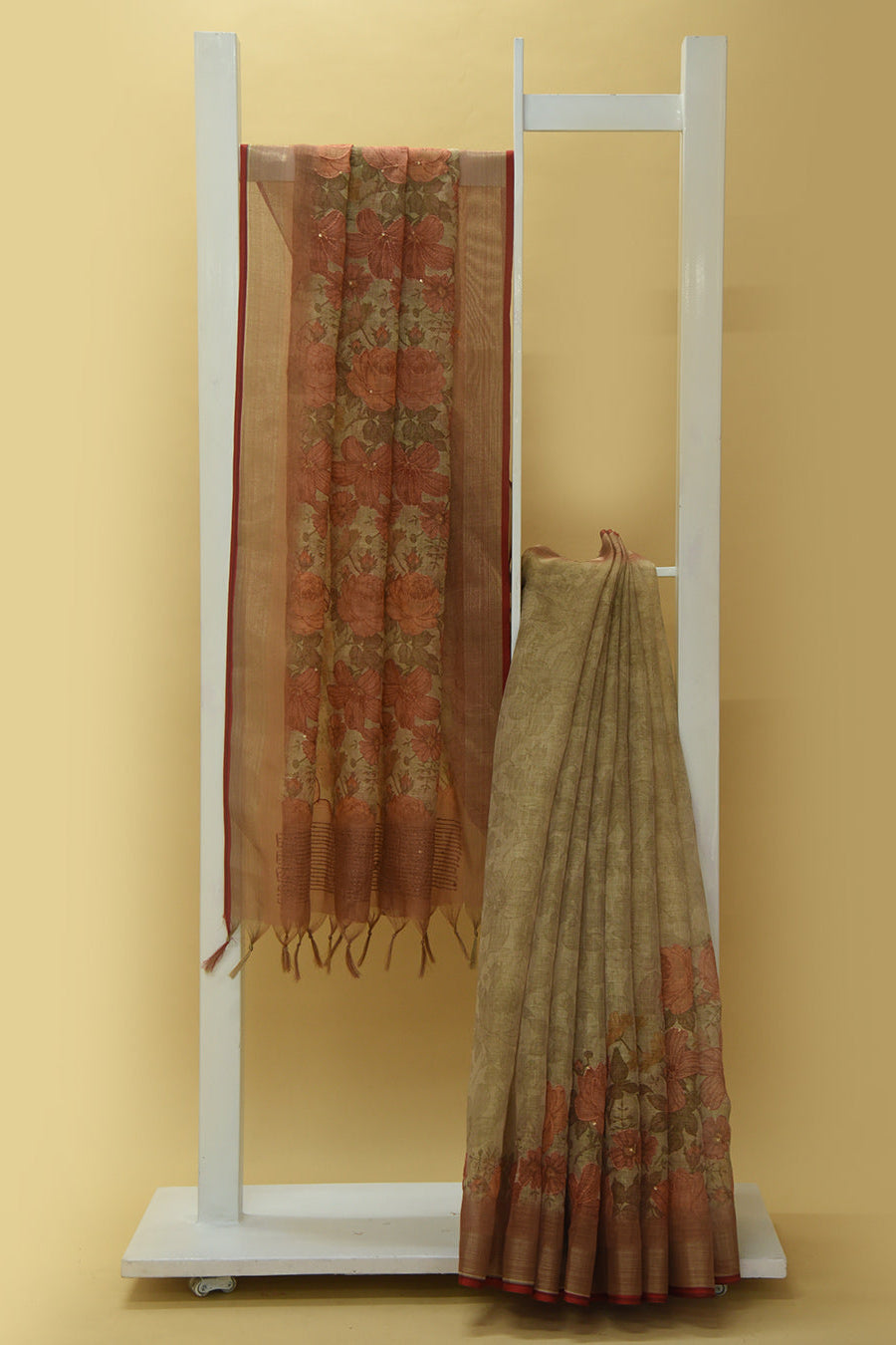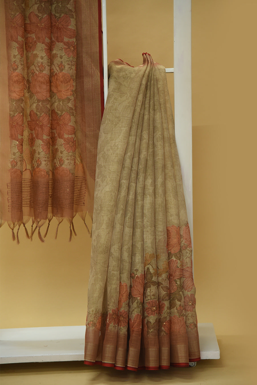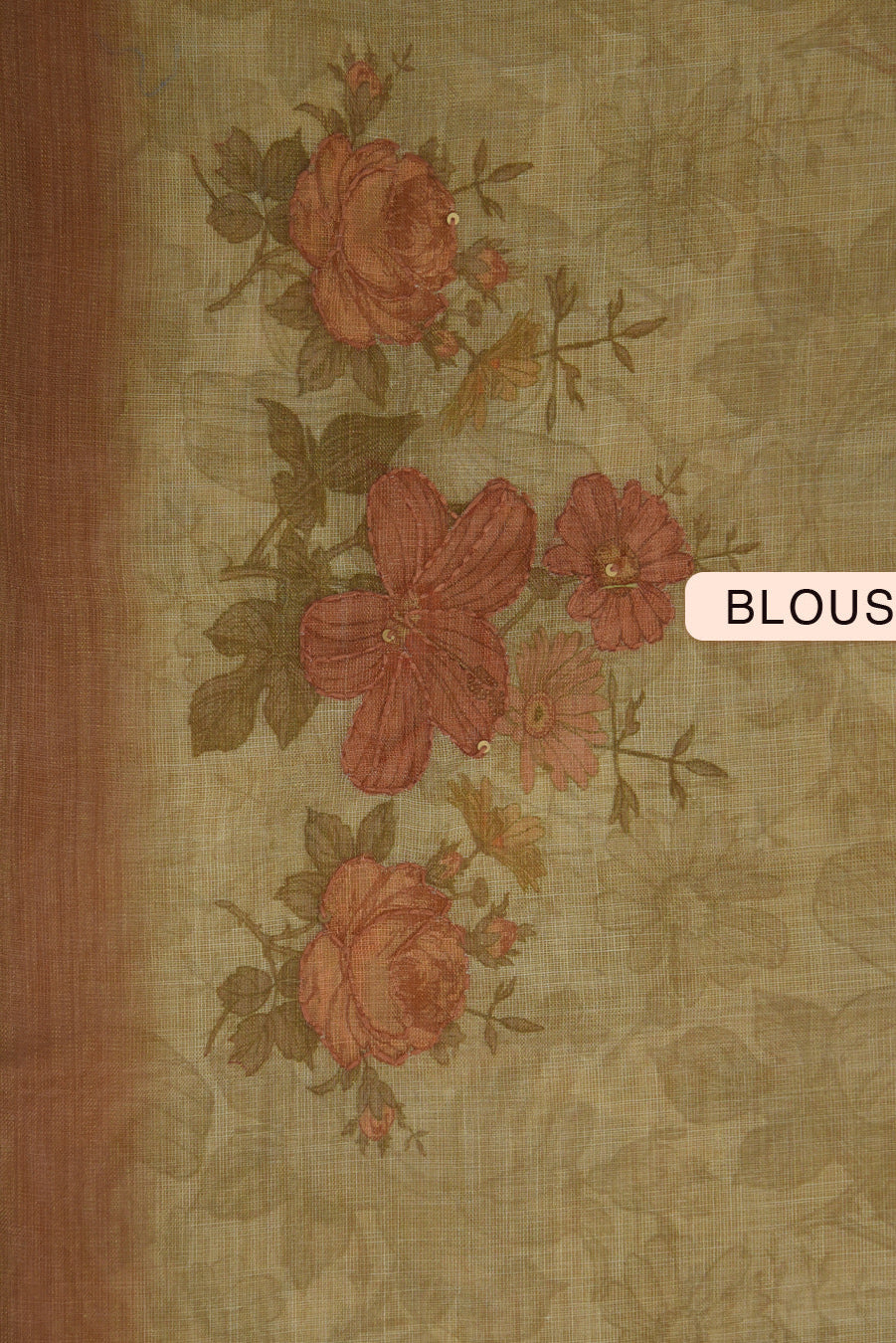 Beige Linen Blend Printed WIth Embroidery Saree With Linen Blend Blouse