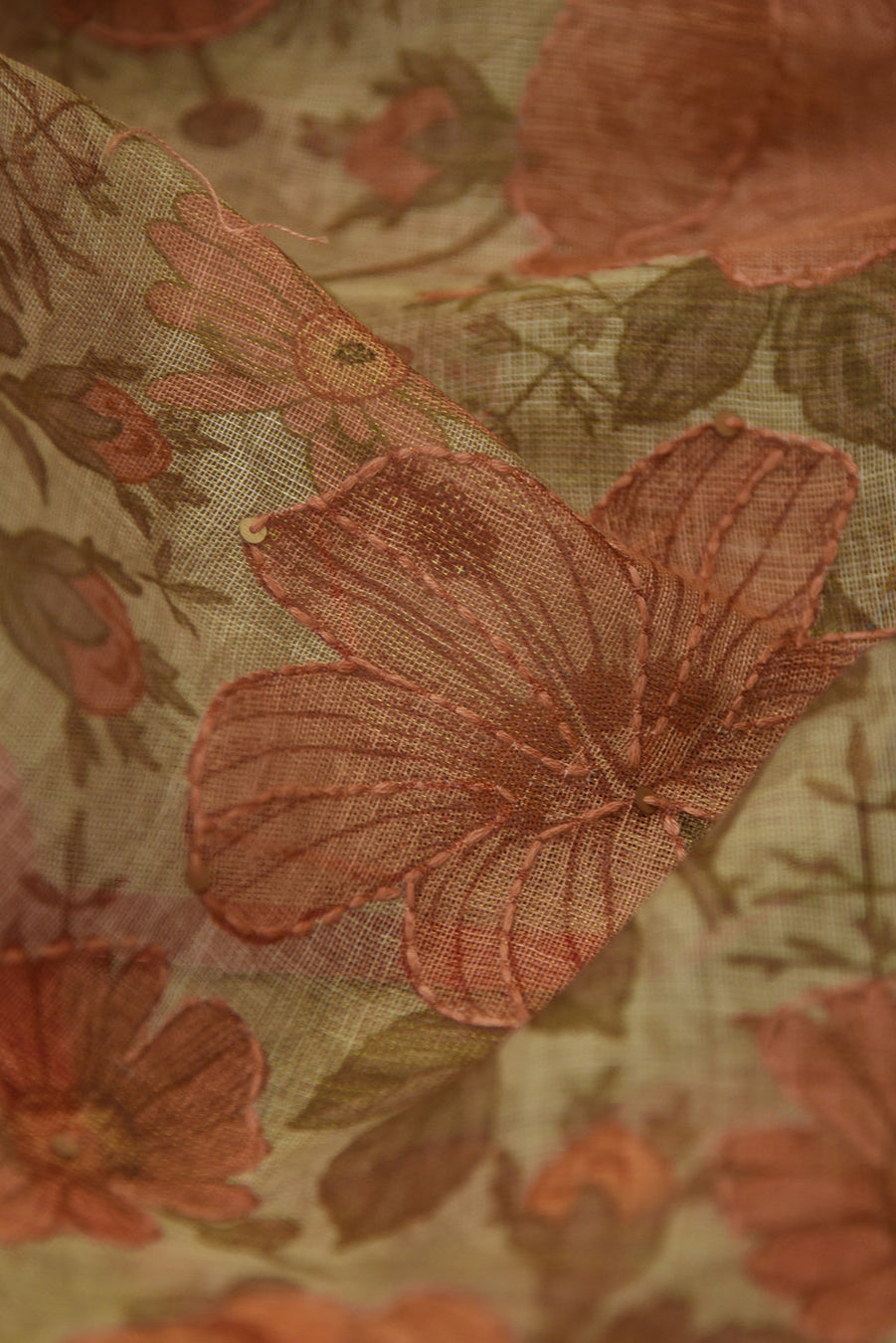 The soft linen blend fabric gives a classy and elegant touch, while the gorgeous digital prints are highlighted with thread embroidery.