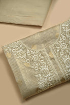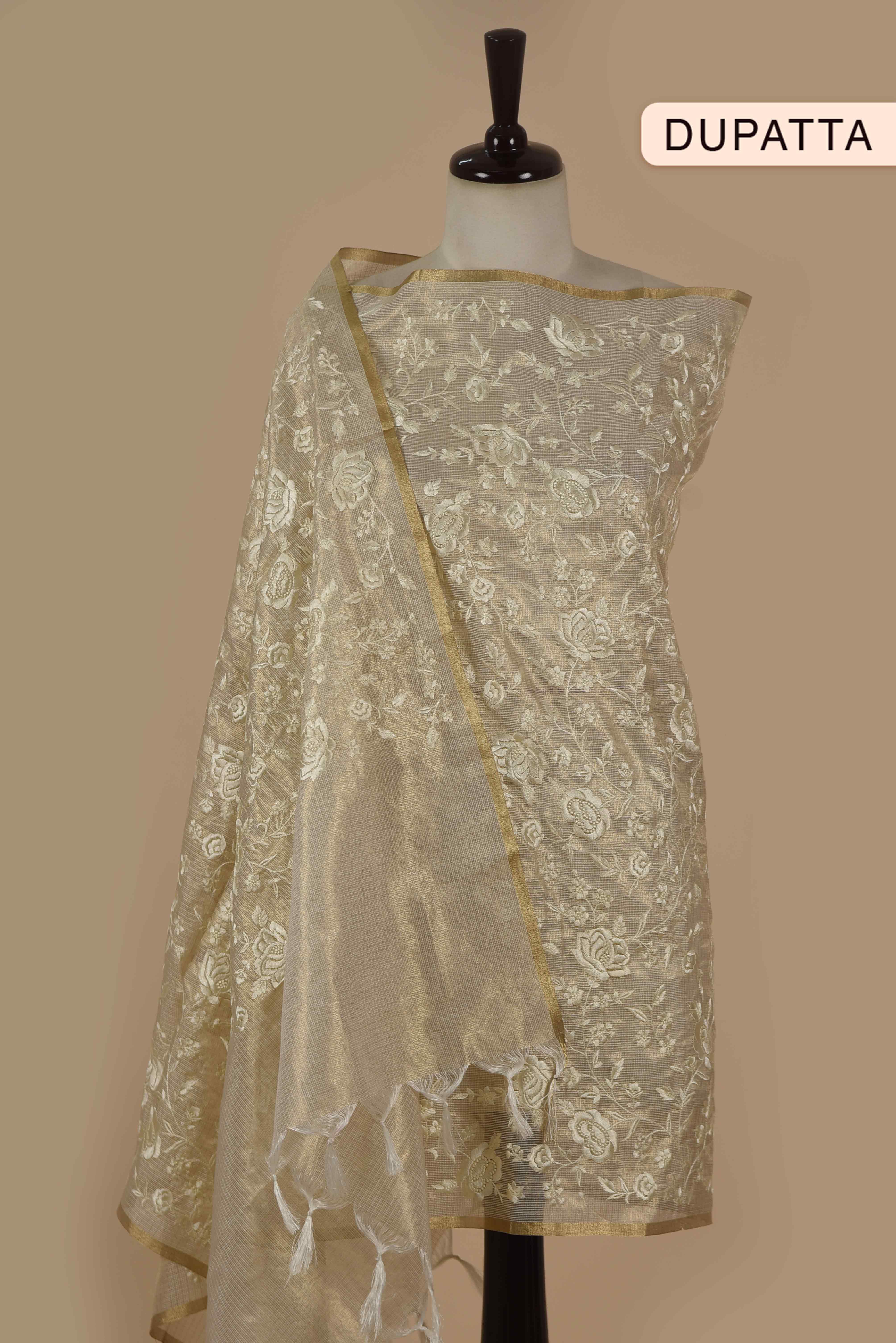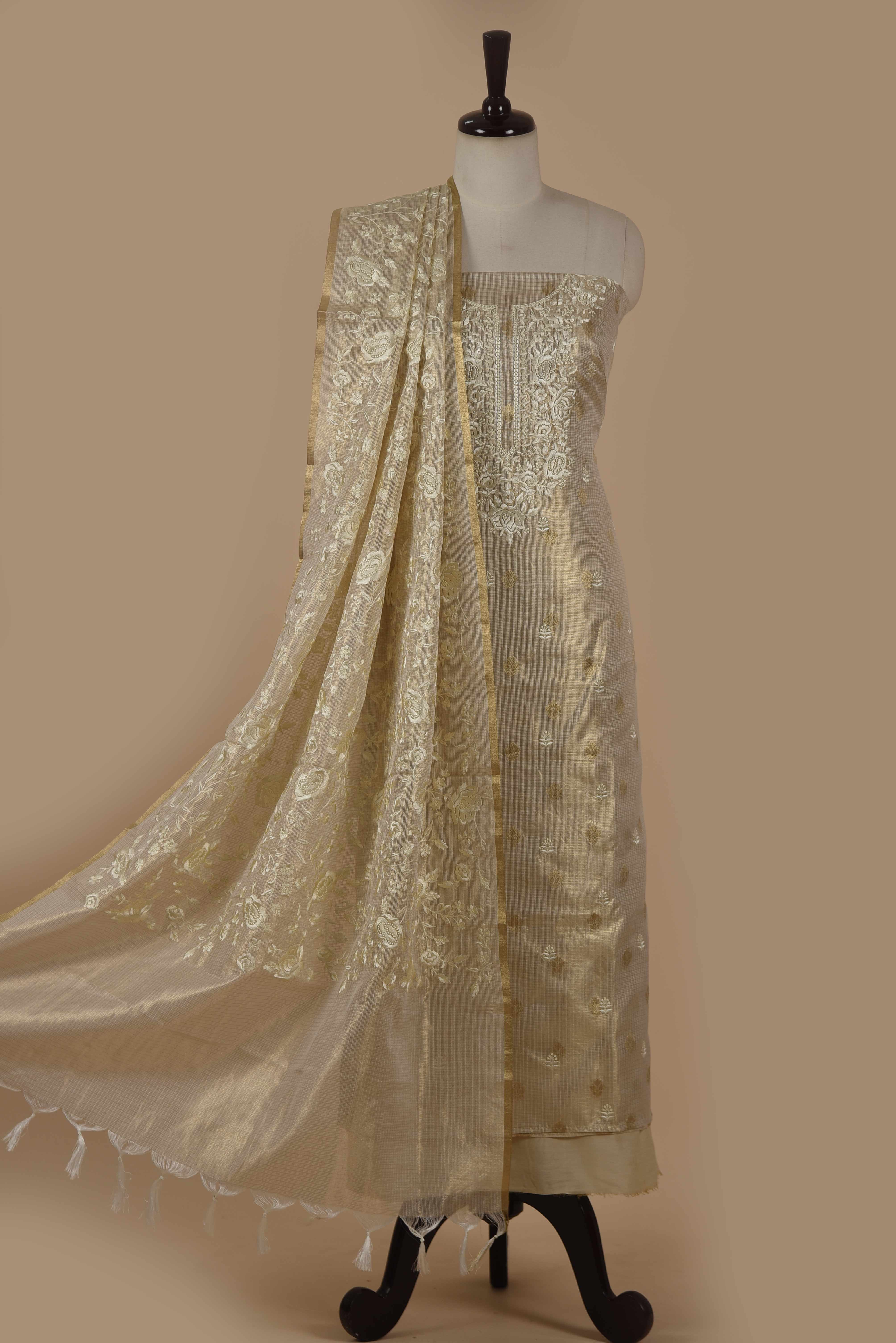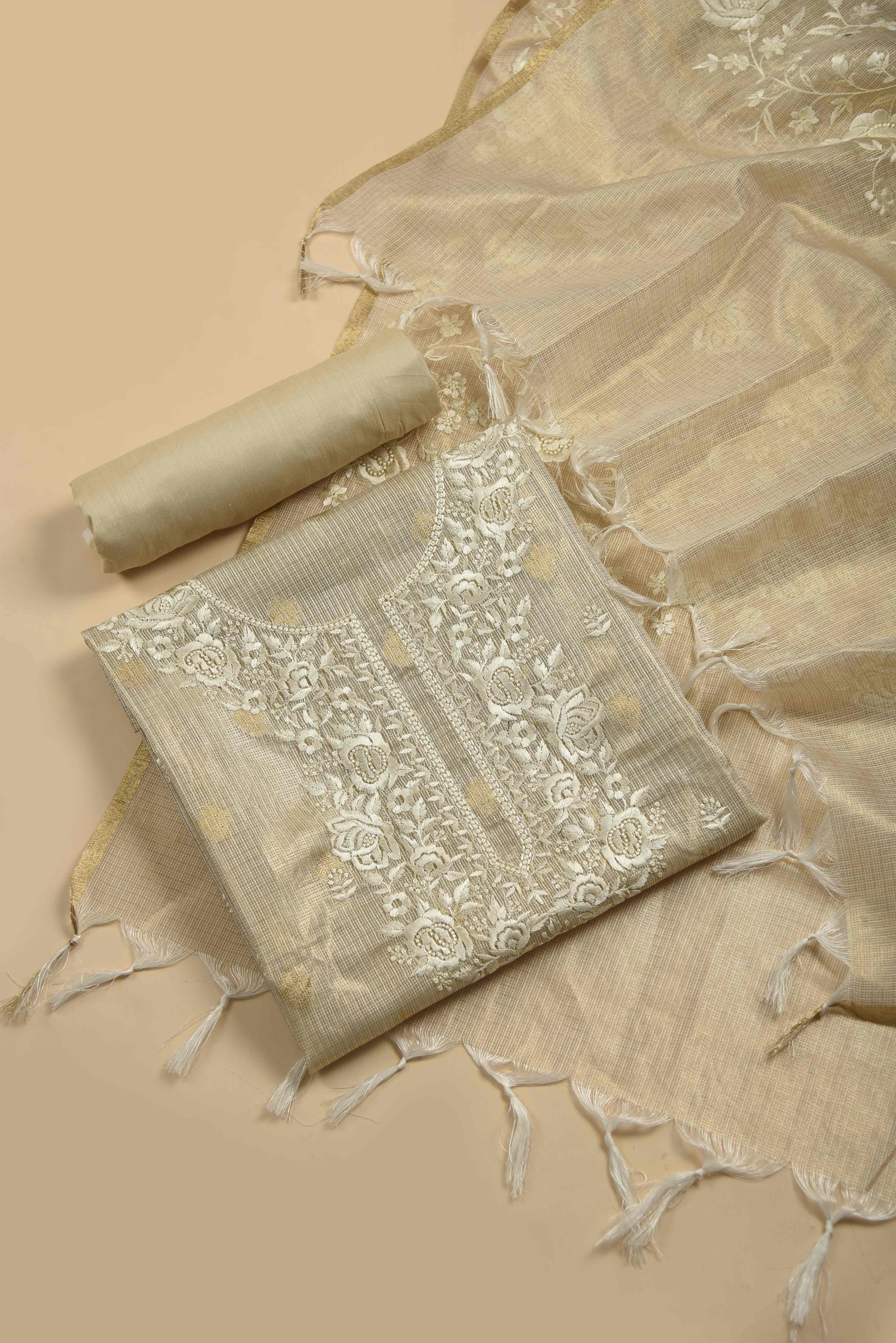 Beige Tissue Kota Woven With Embroidered Unstitched Suit Fabric Set With Tissue Kota Dupatta
