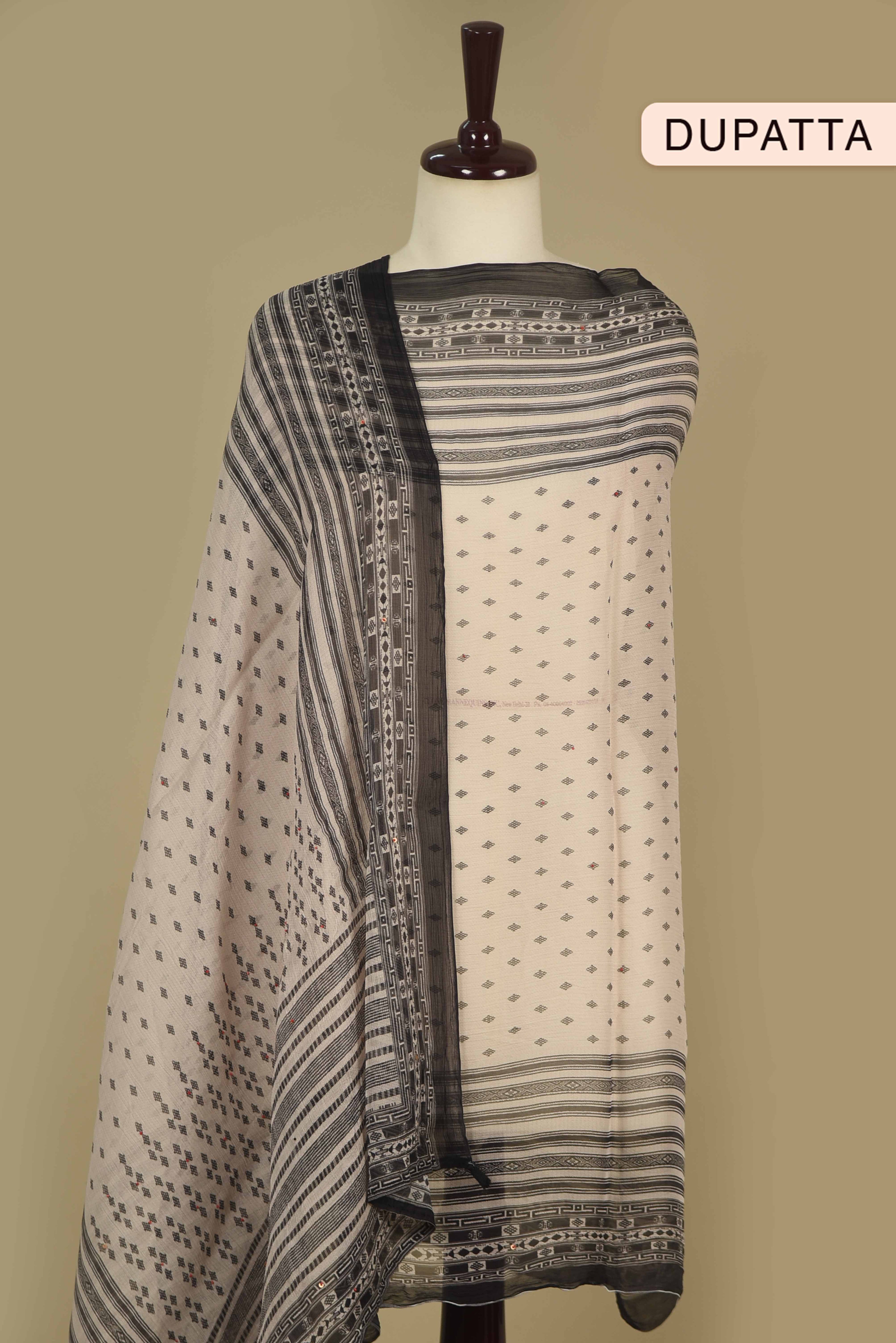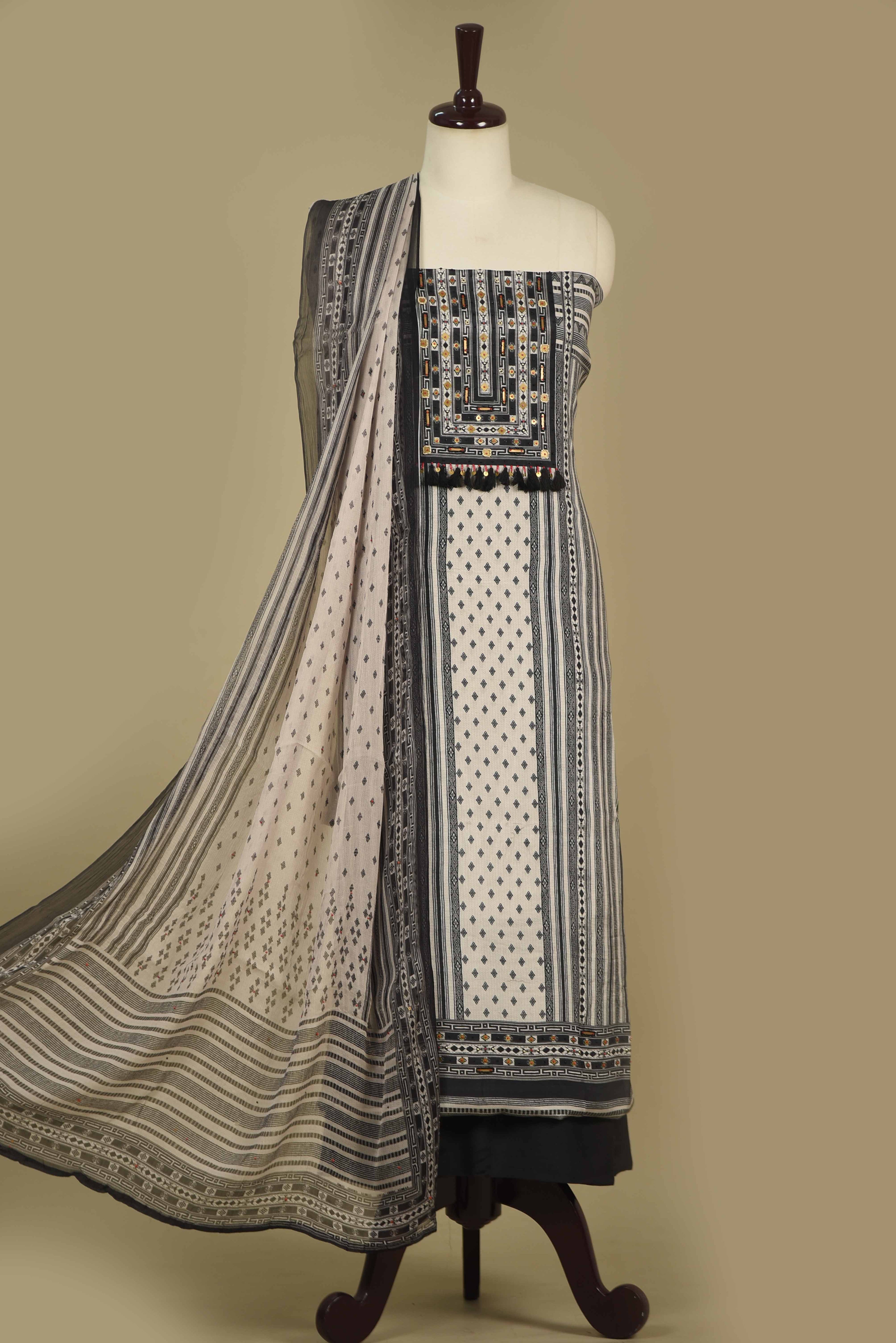 Beige With Black Muslin Blend Printed Unstitched Suit Fabric Set With Chinon Printed Dupatta