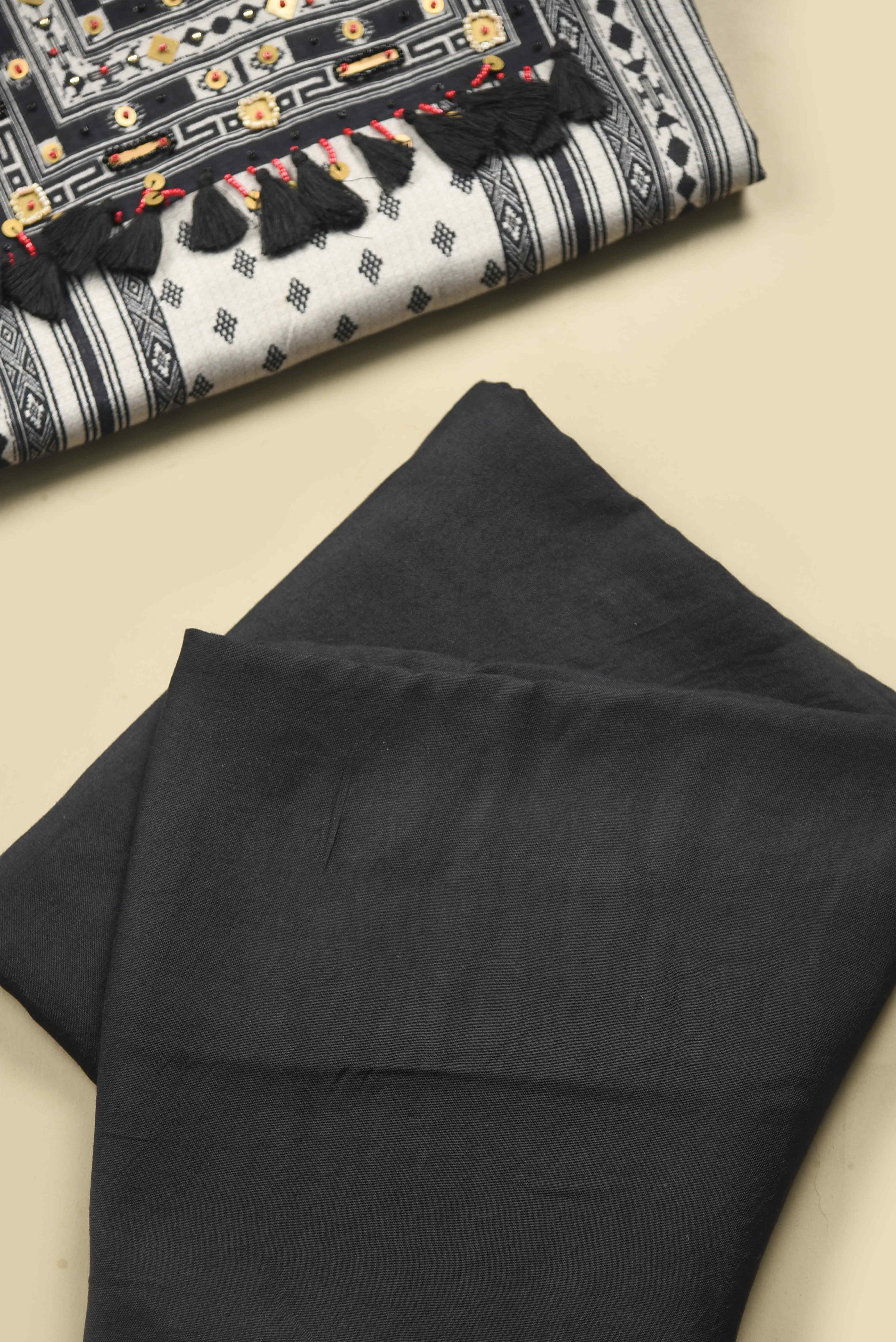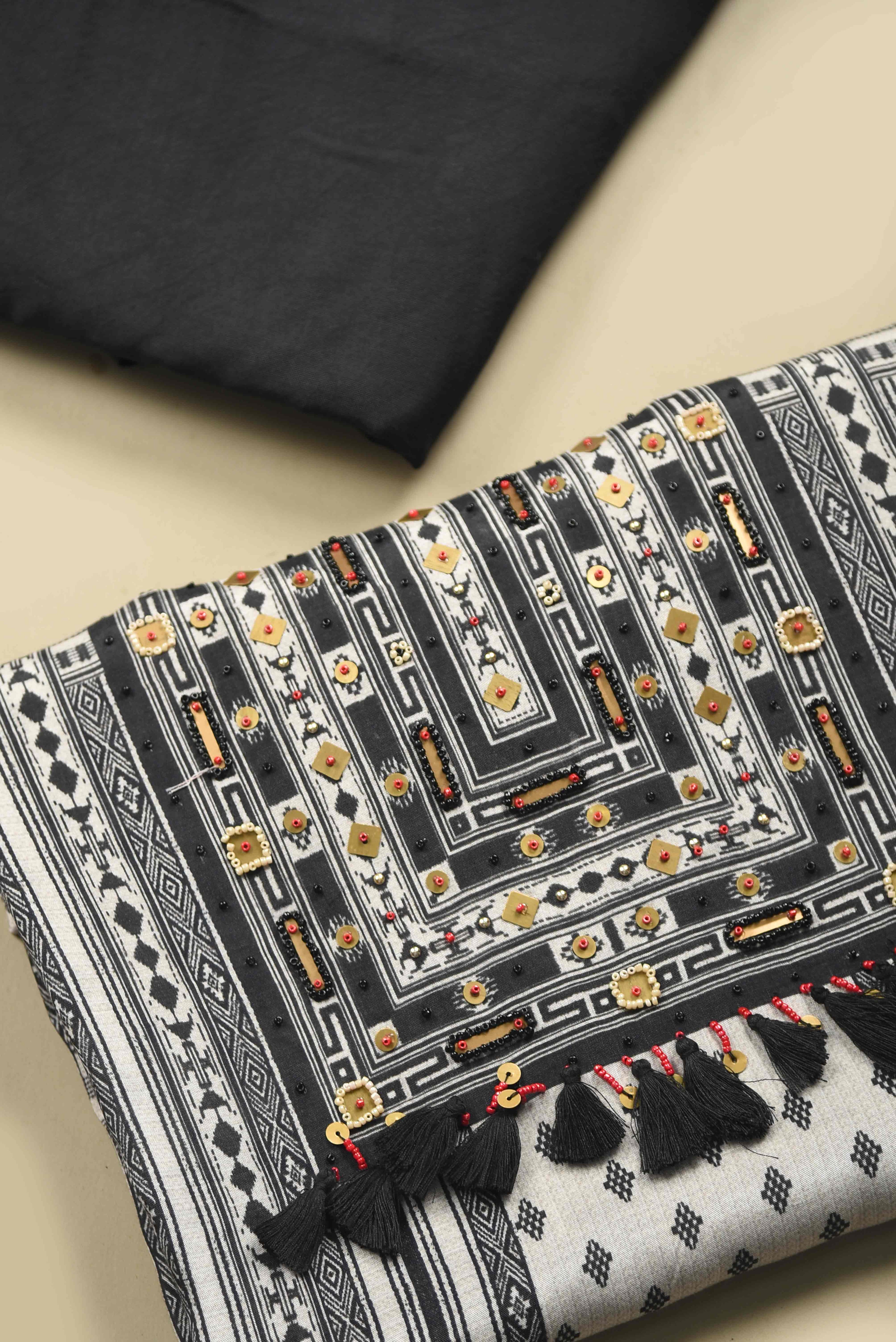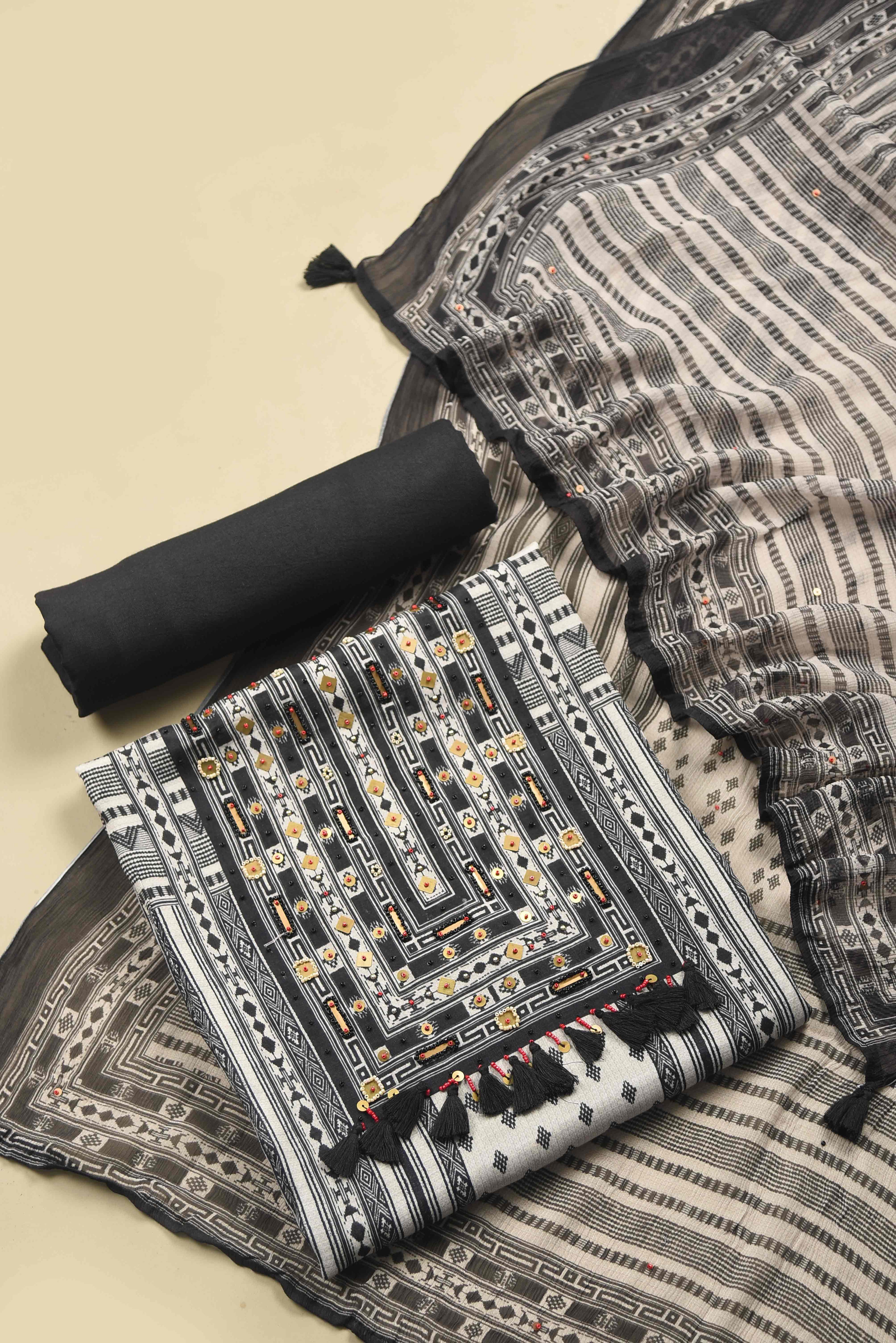 - Beige with Black Printed Muslin Unstitched Suit Fabric Set Crafted from soft, breathable muslin fabric, this elegant unstitched suit set features a graceful beige base adorned with black floral prints.