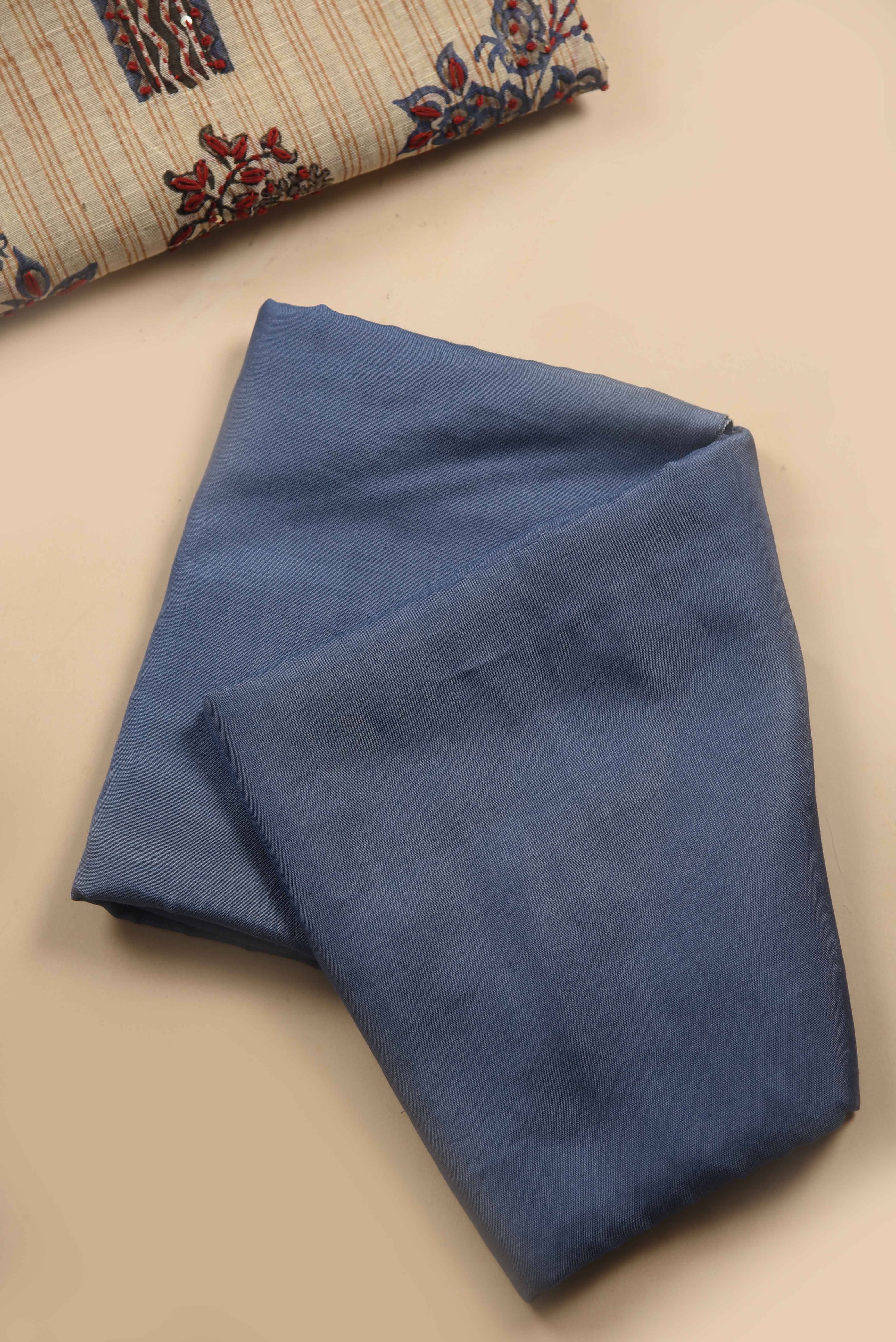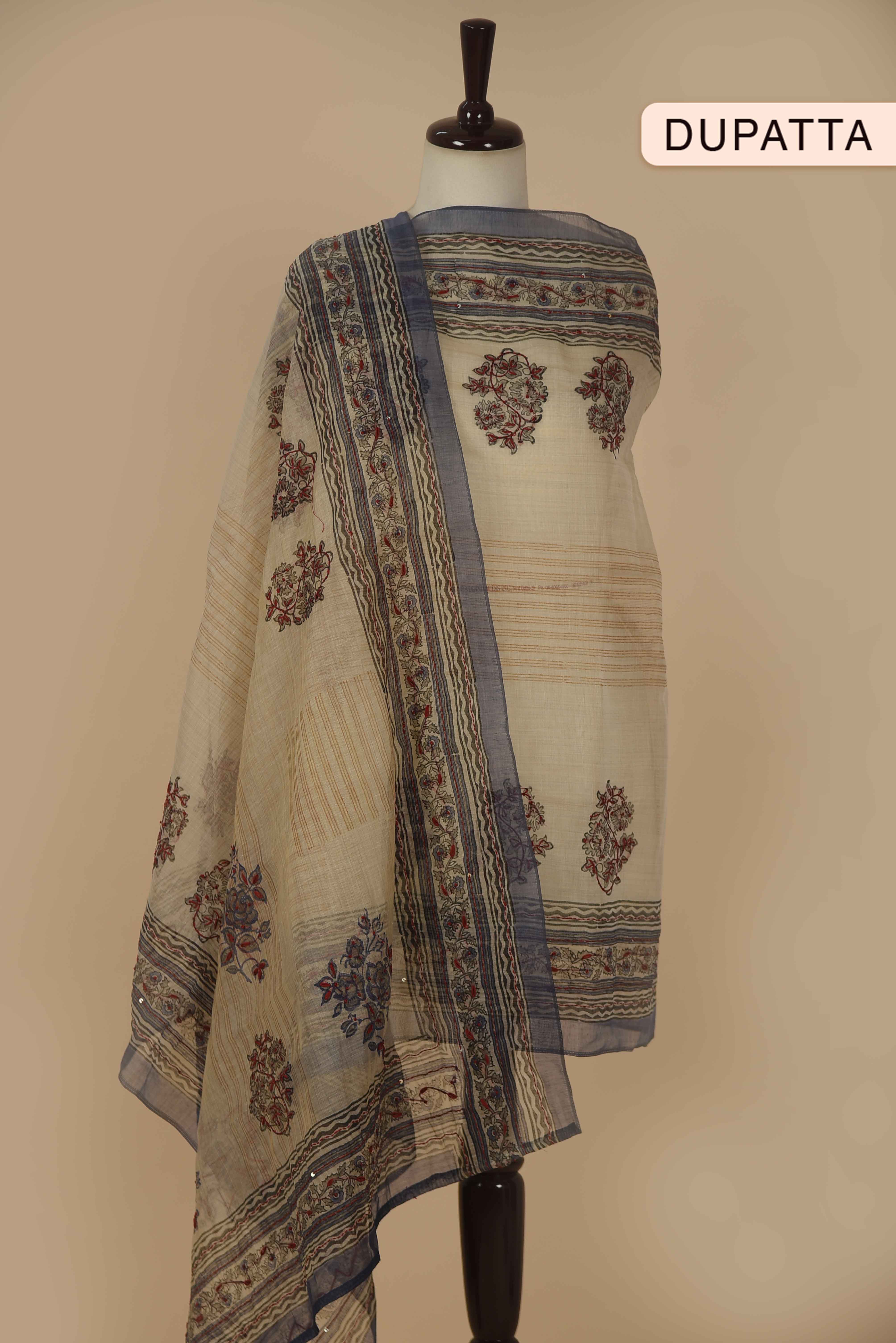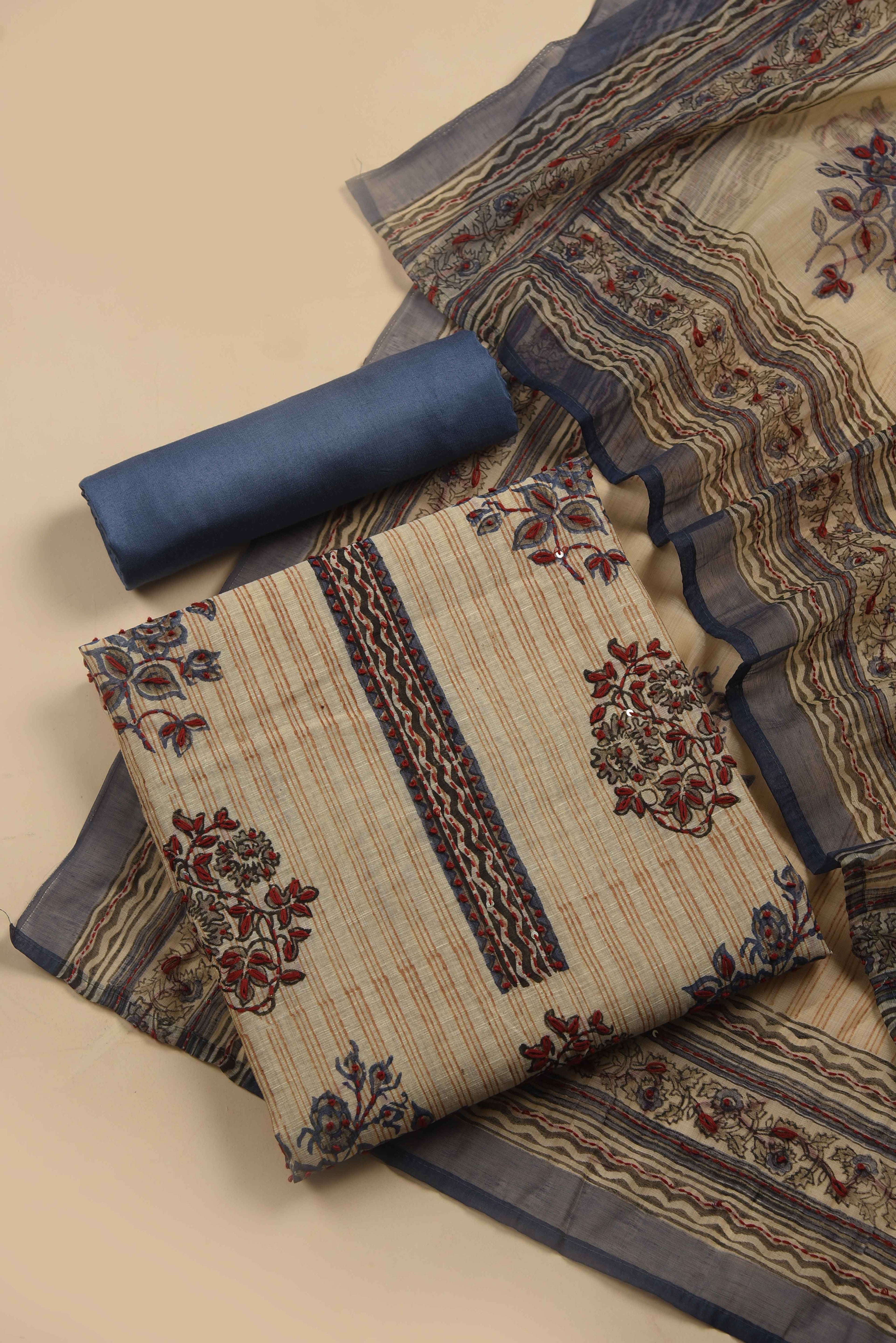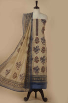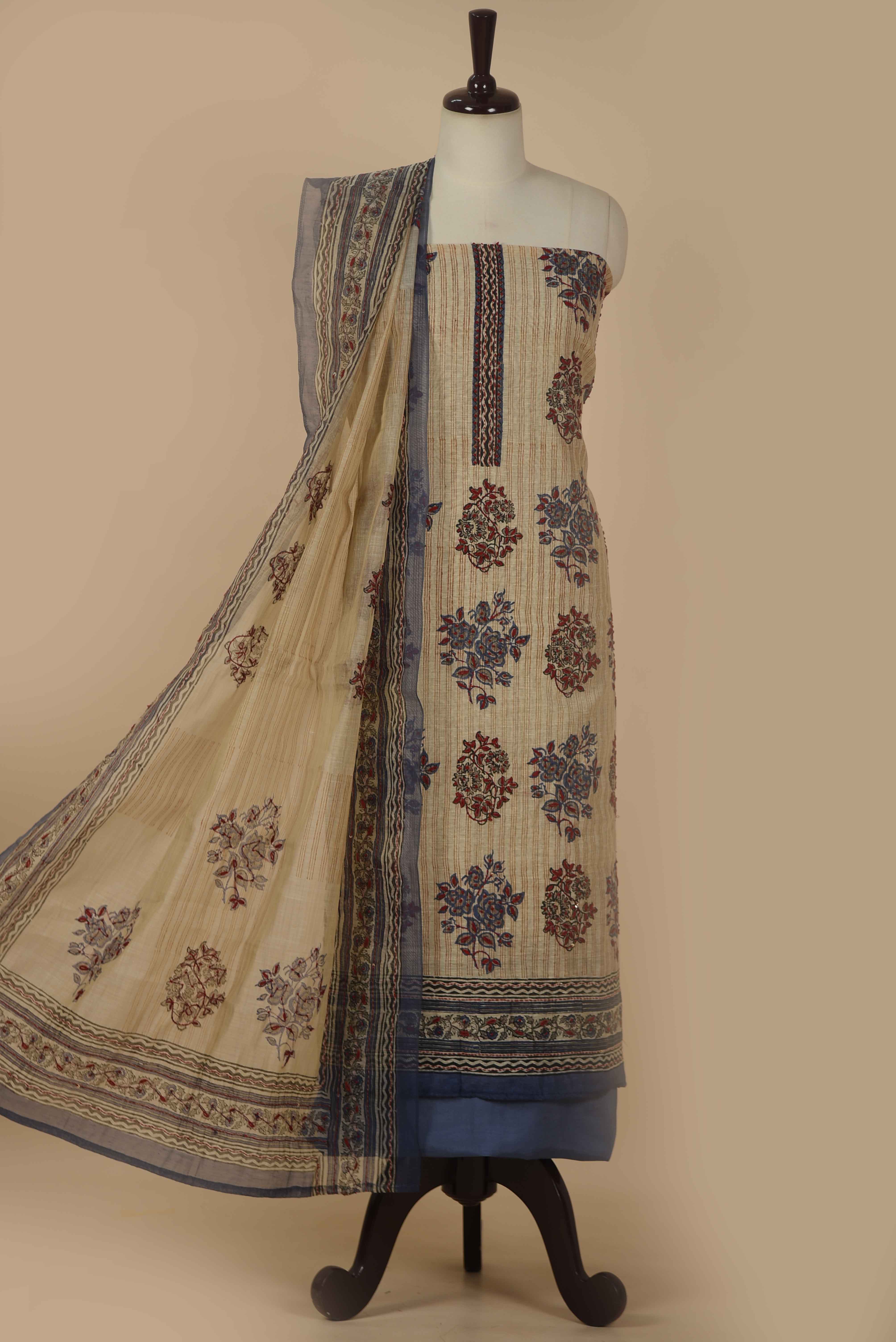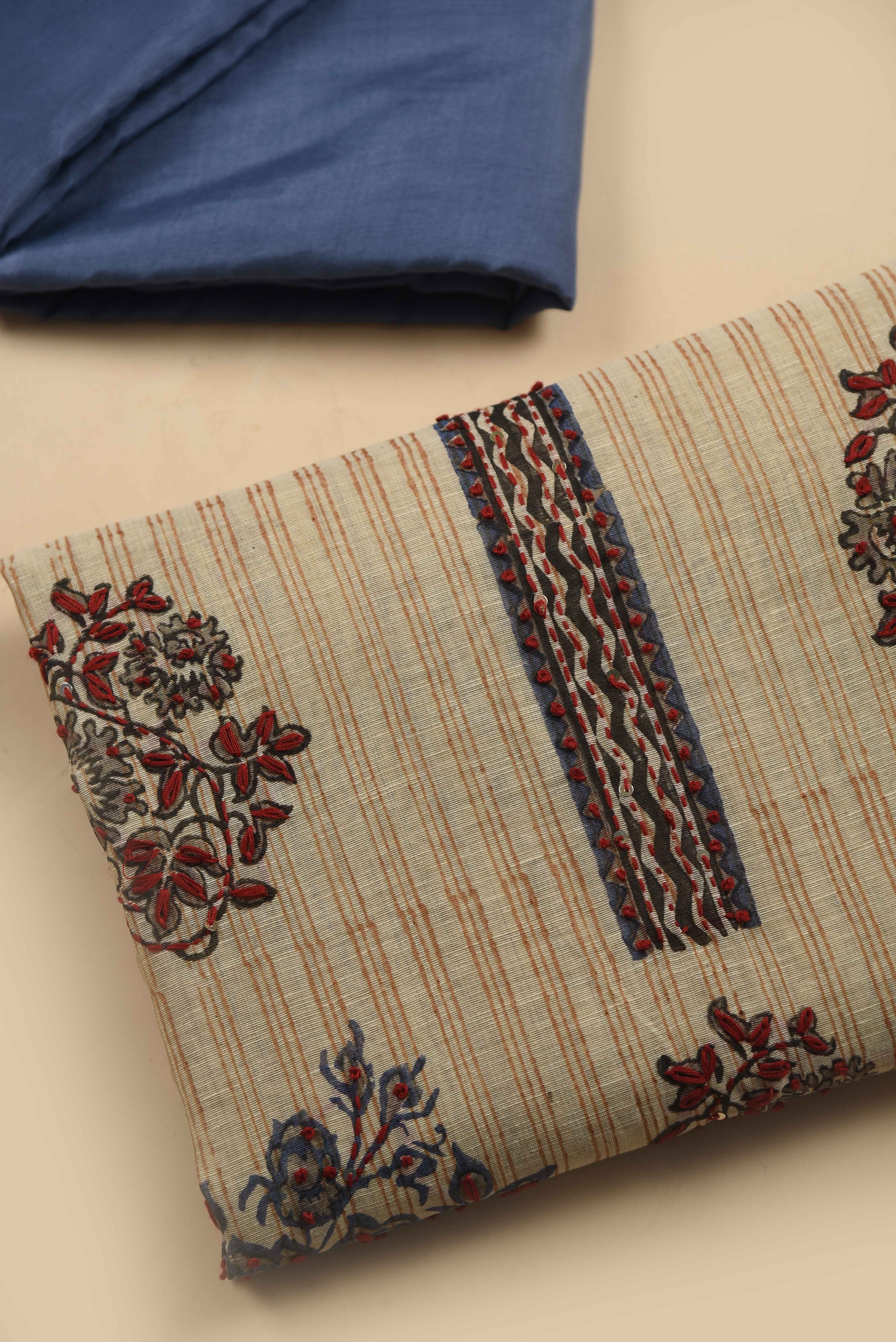 Beige With Blue Chanderi Printed With Embroidered Unstitched Suit Fabric Set with Chanderi Embroidered Dupatta