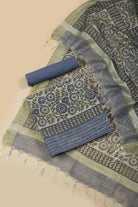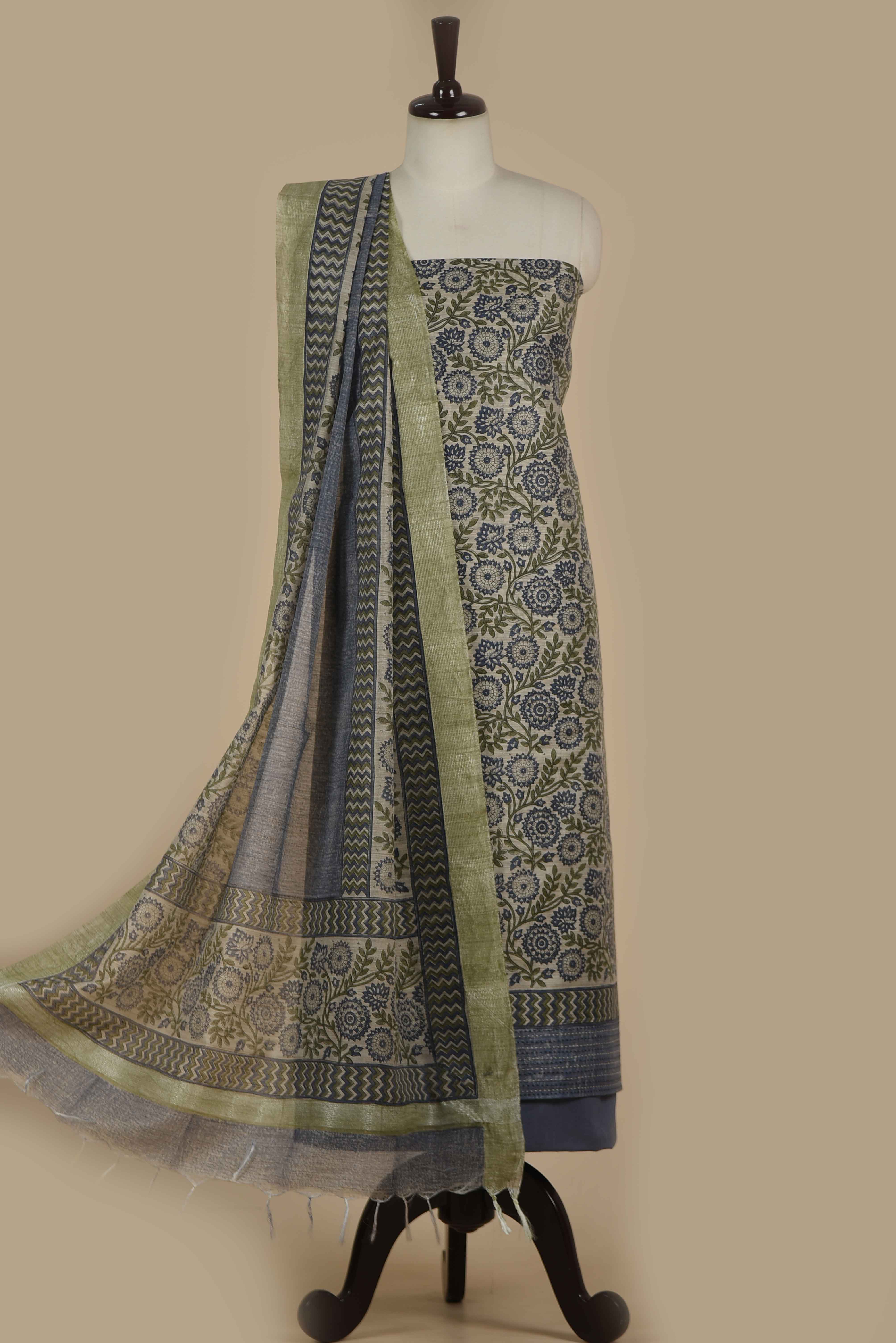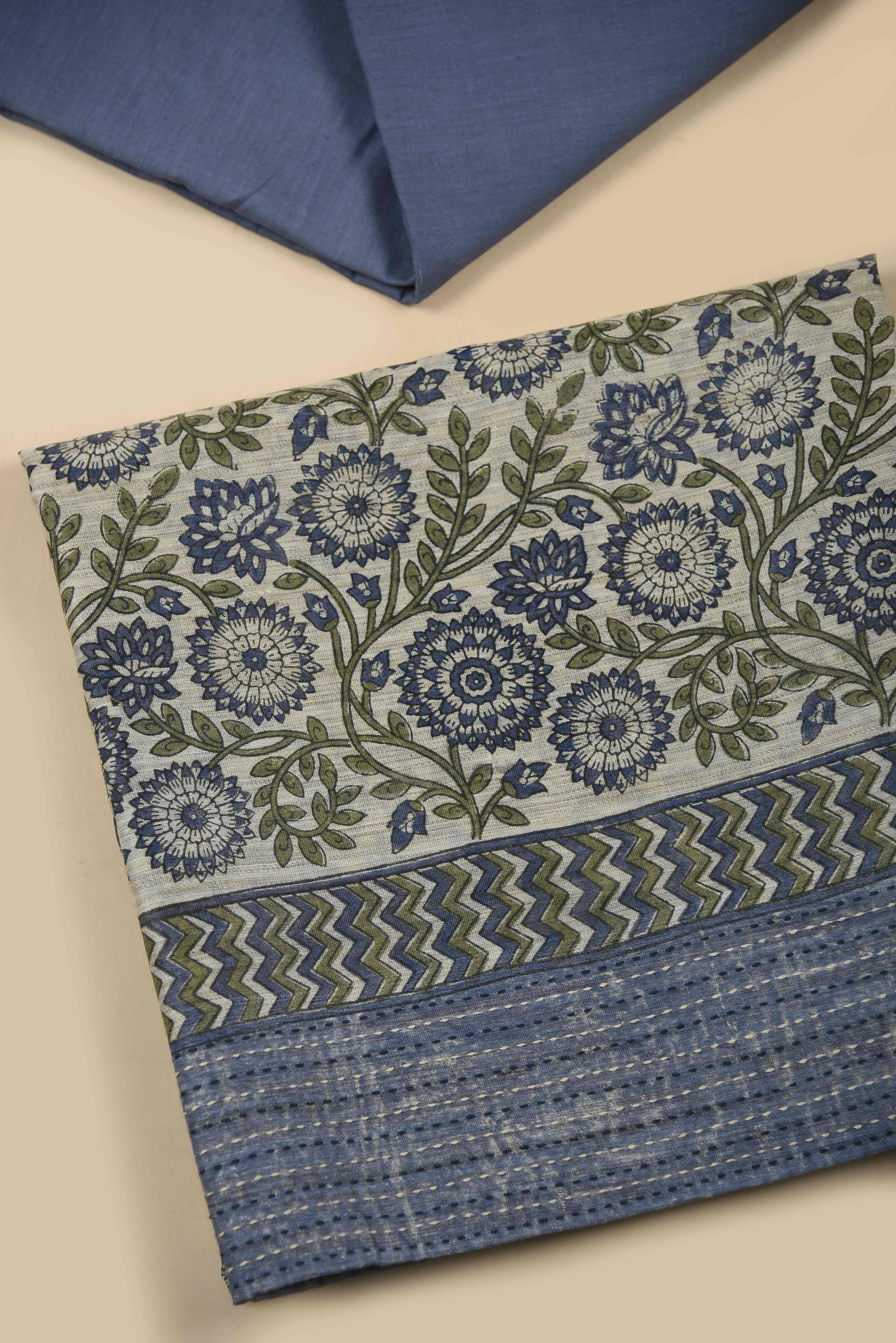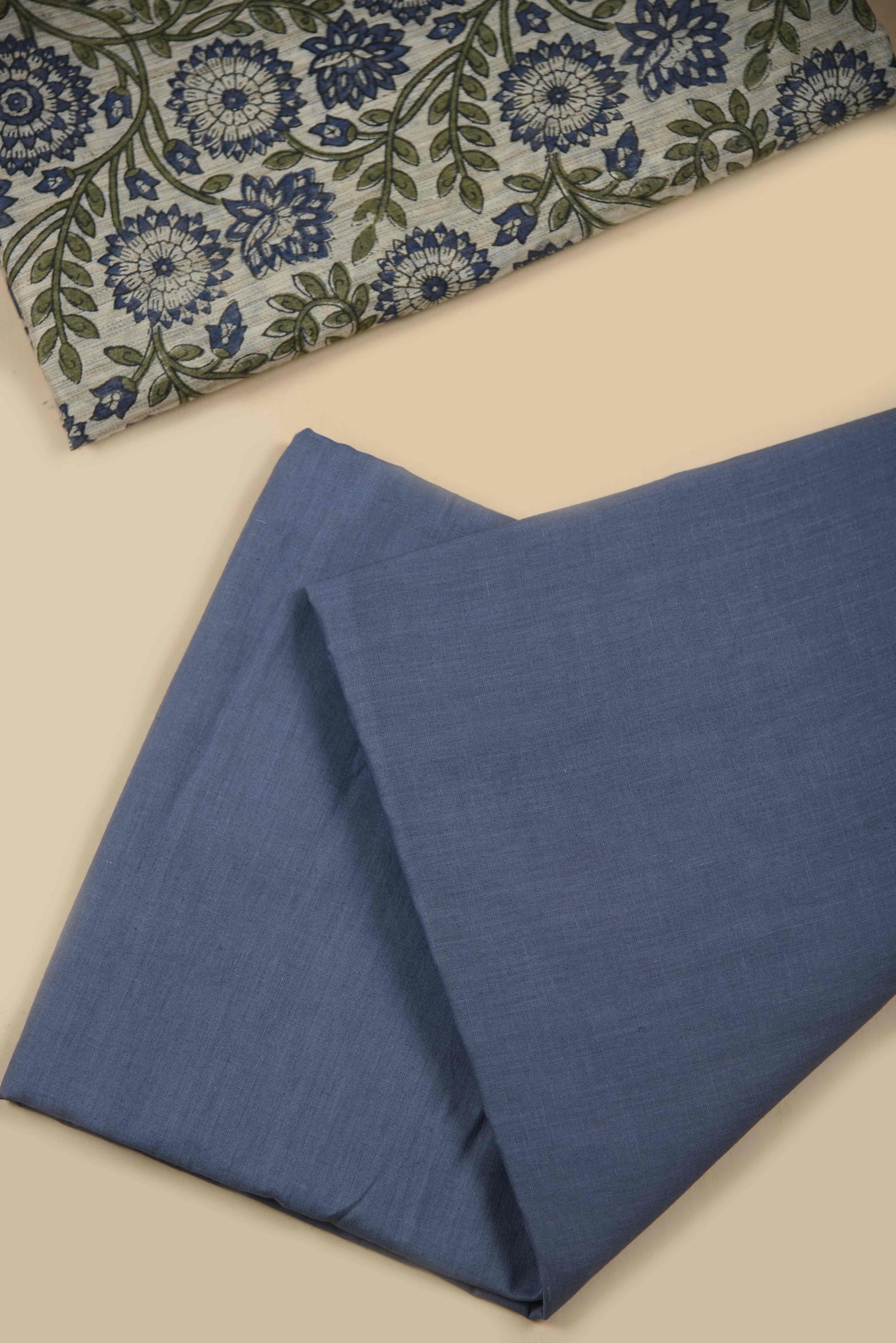 Beige With Blue Chanderi Printed With Embroidery Unstitched Suit Fabric Set With Chanderi Printed Dupatta