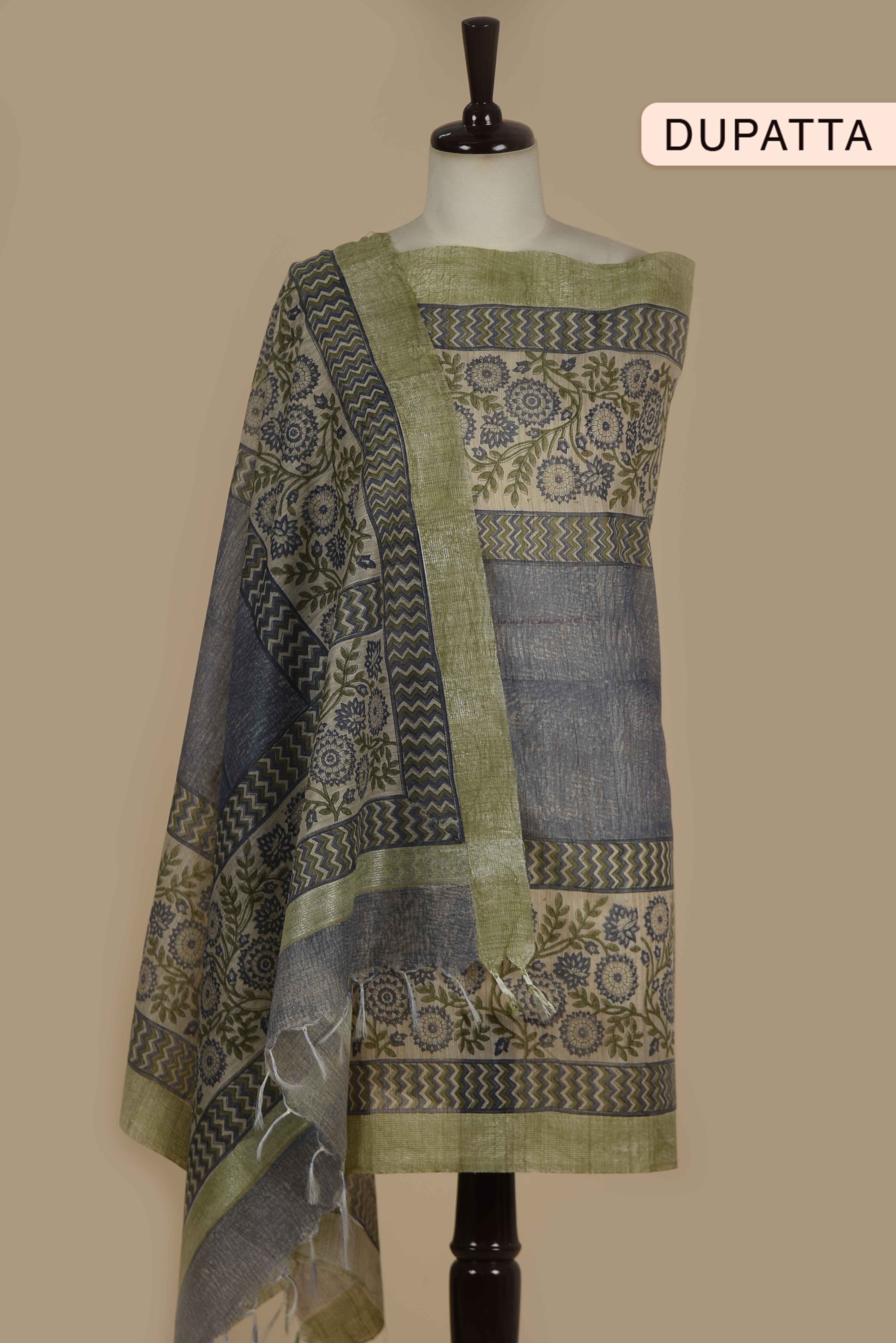 The unstitched ensemble includes premium Chanderi fabric paired with a coordinating printed dupatta, perfect for creating a custom-fit garment tailored to your preferences.