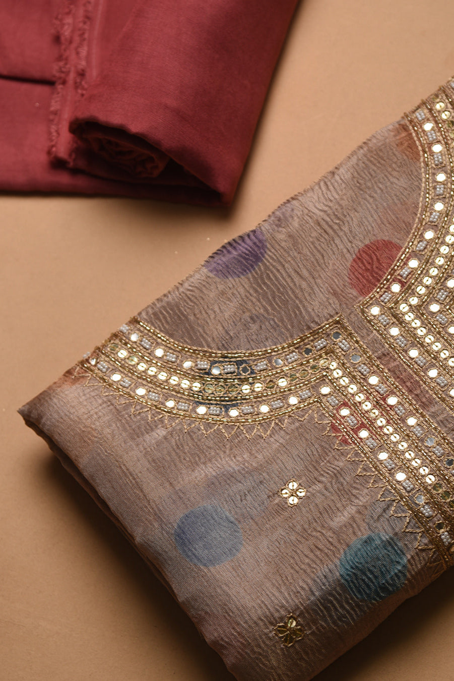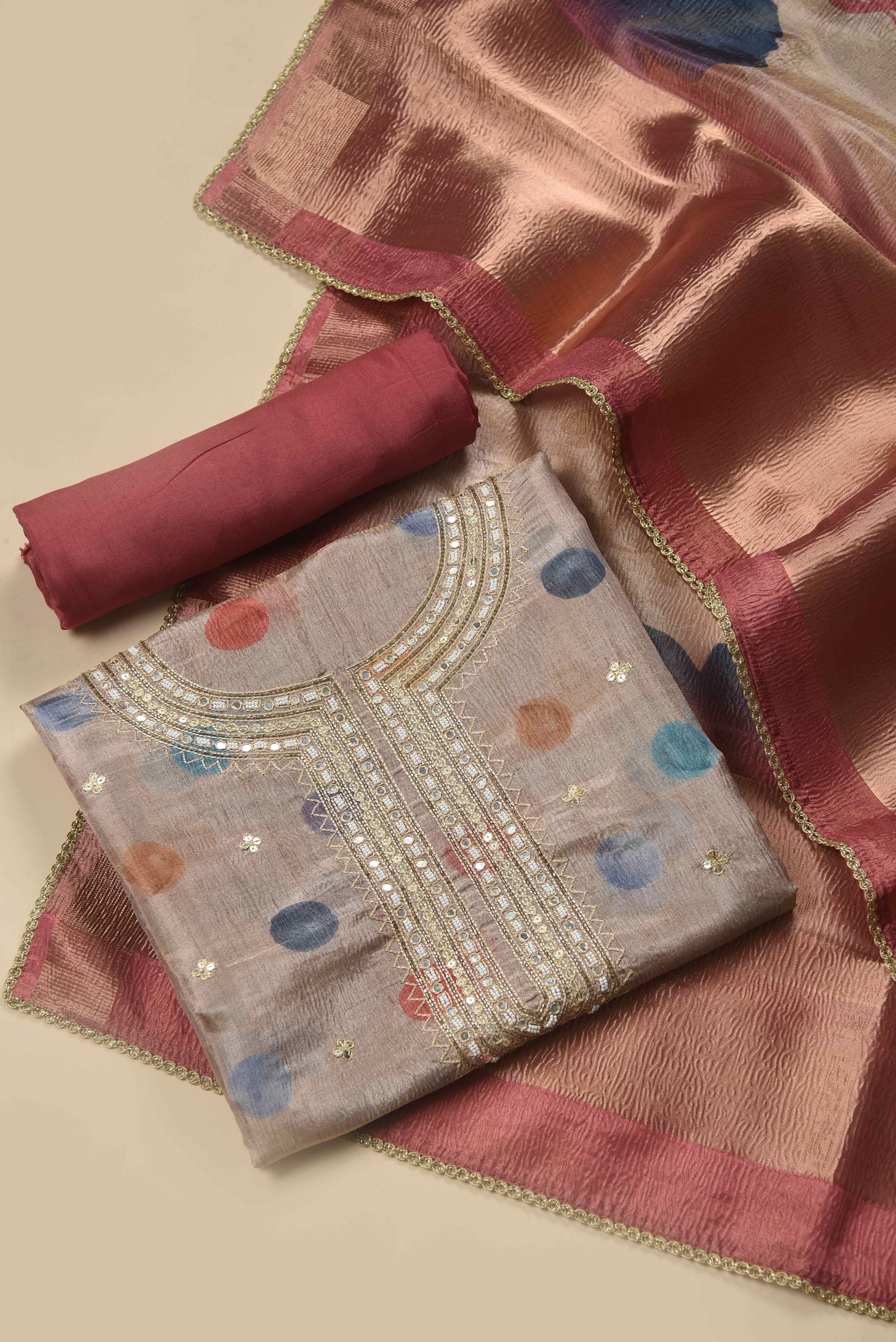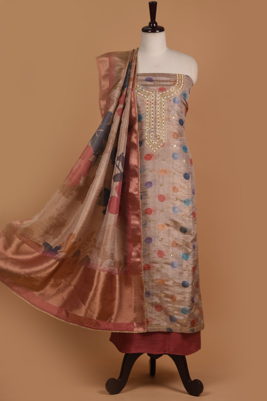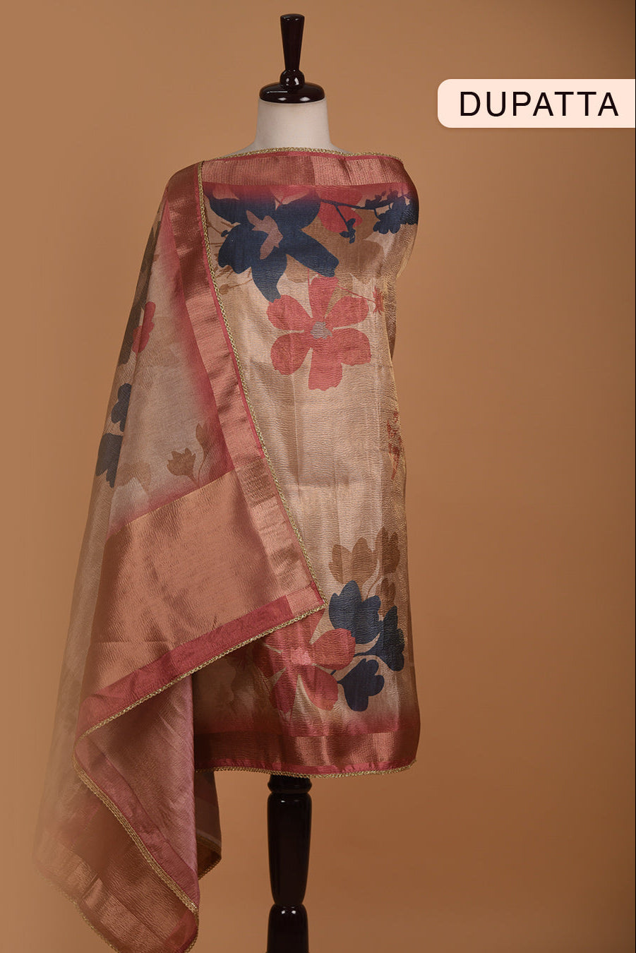 Beige With Carrot Pink Silk Tissue Blend Printed With Hand Embroidery Unstitched Suit Fabric Set With Silk Tissue Blend Printed Dupatta