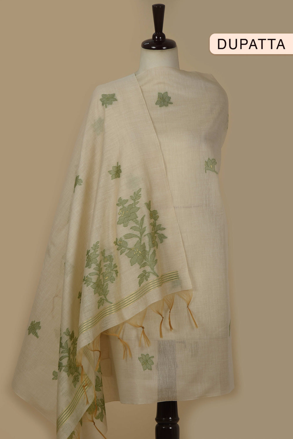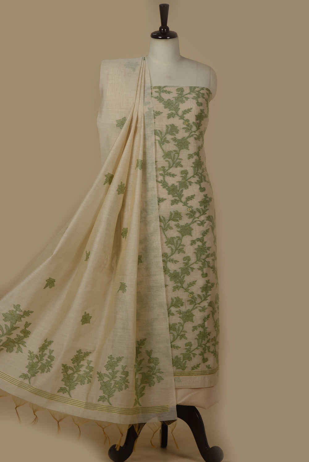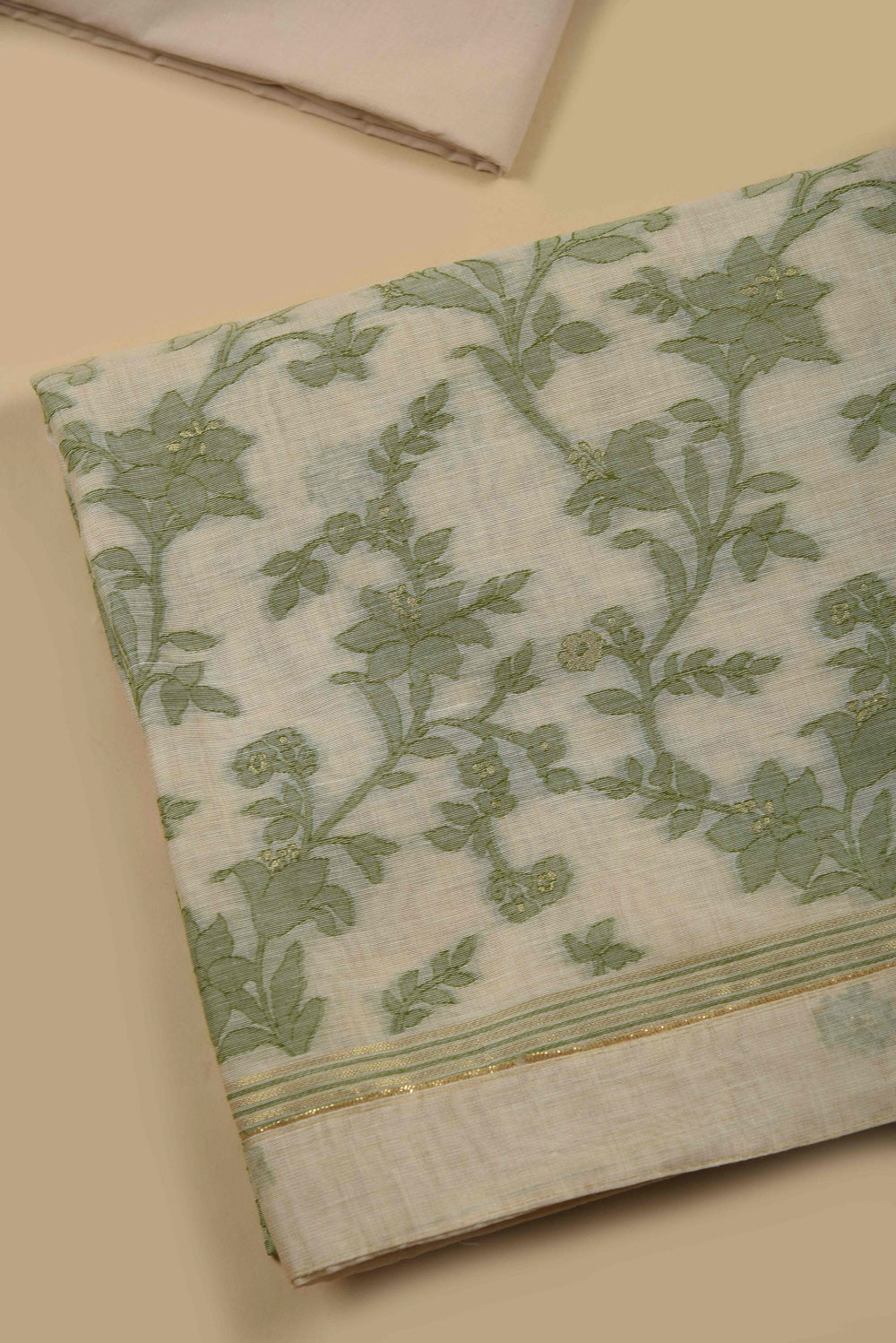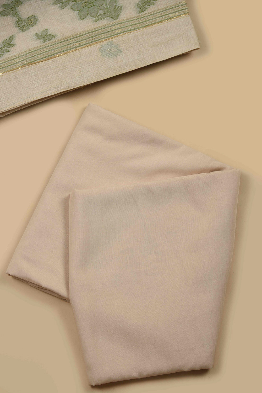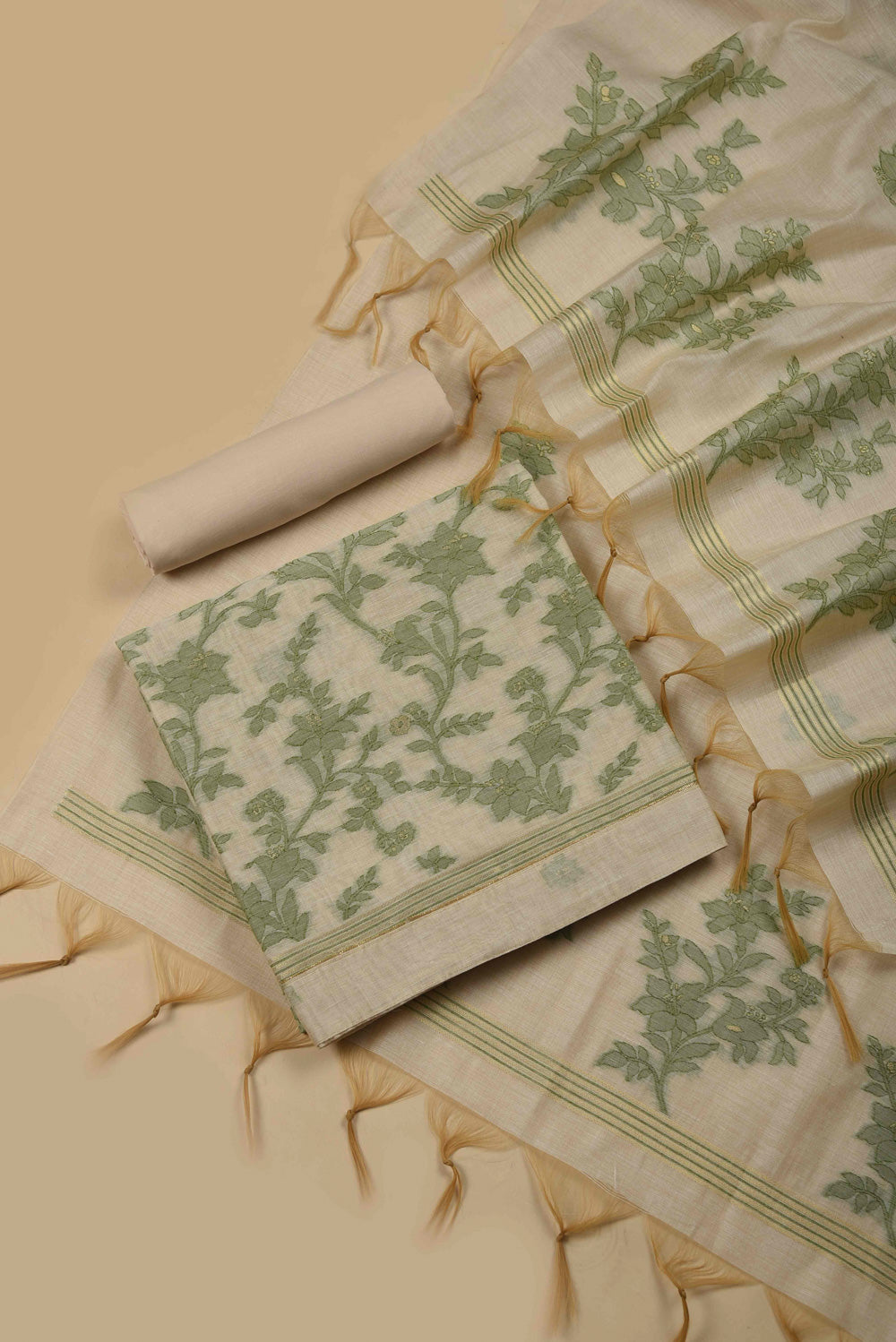Beige With Green Chanderi Woven Jamdani Unstitched Suit Fabric Set With Chanderi Woven Jamdani Dupatta