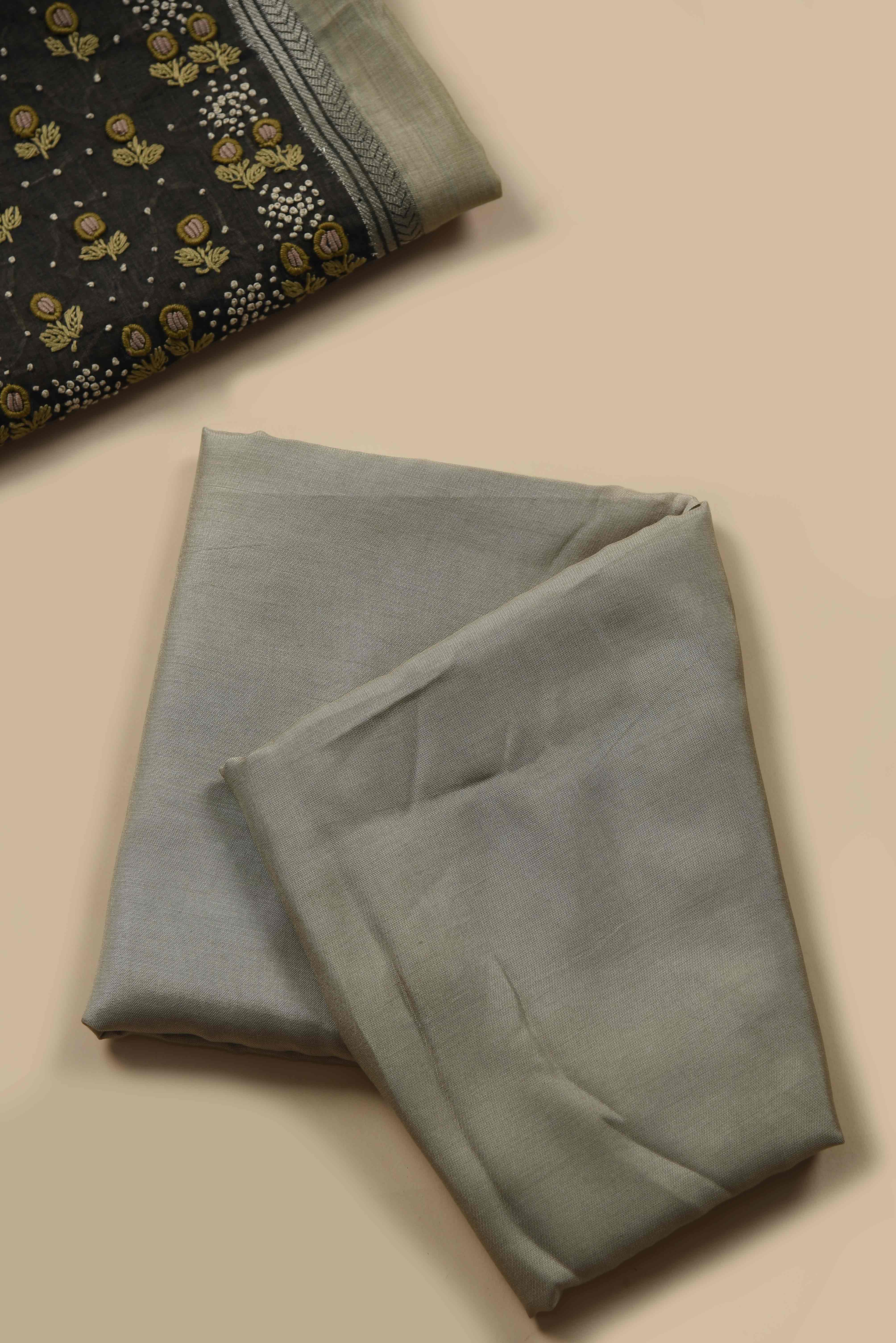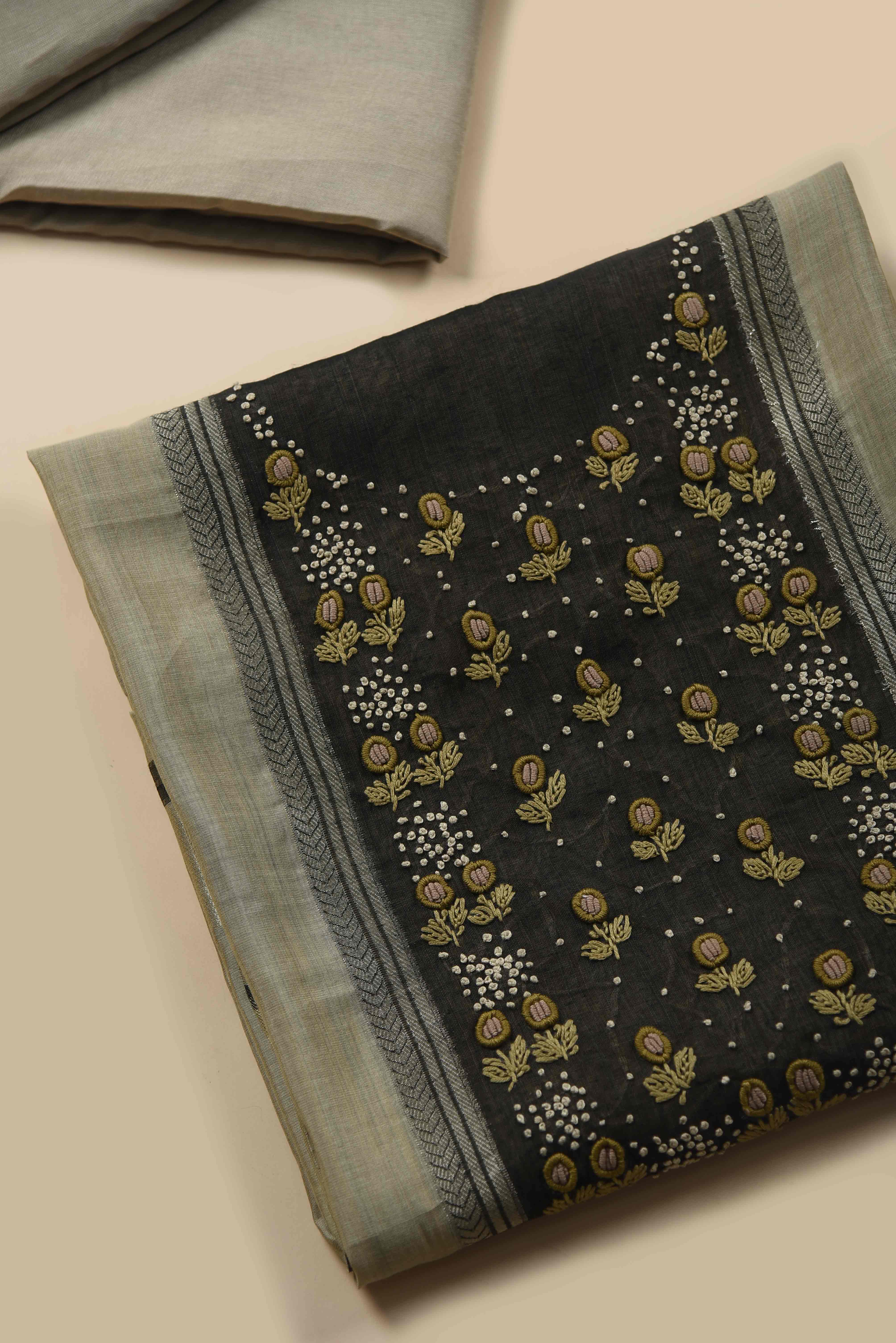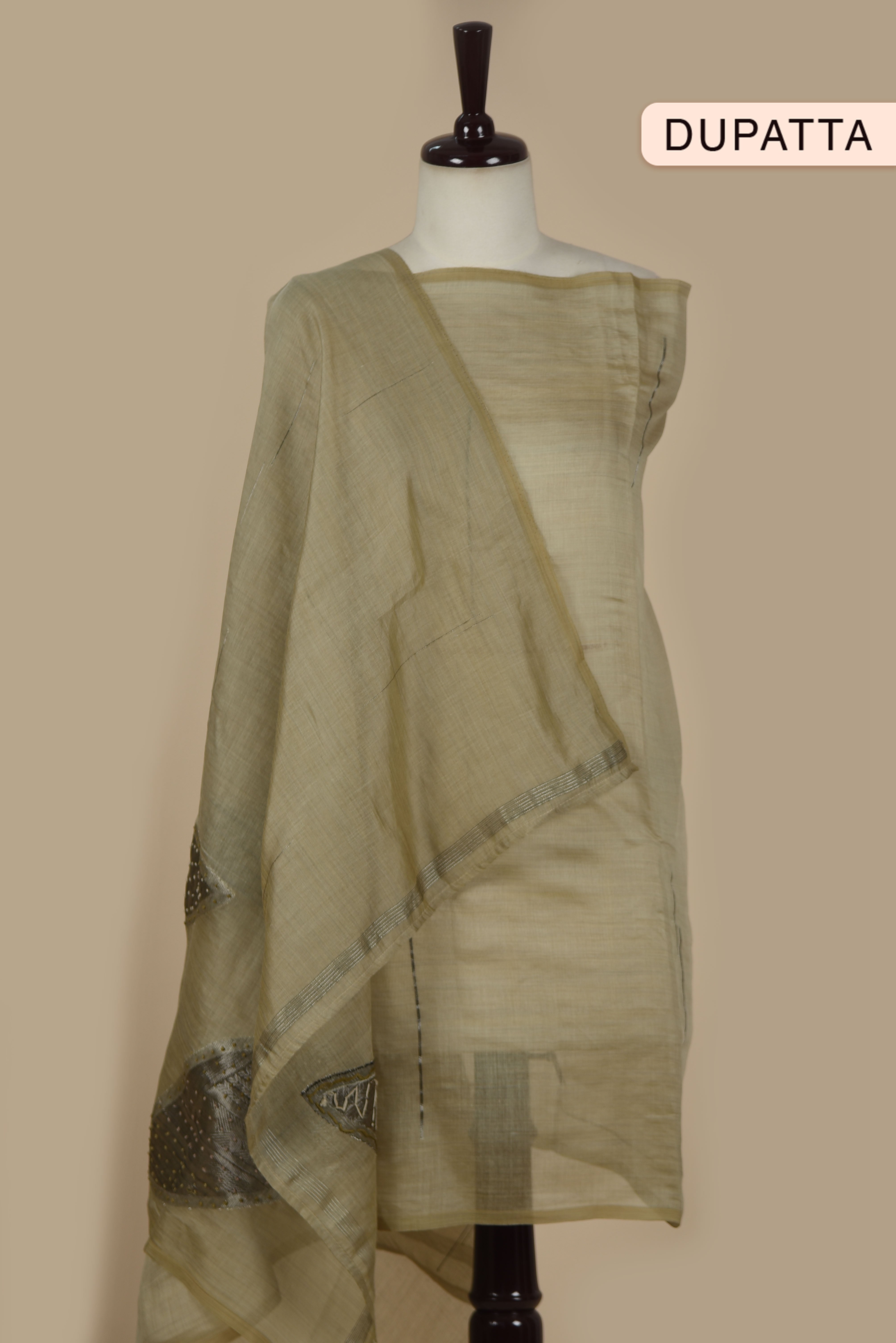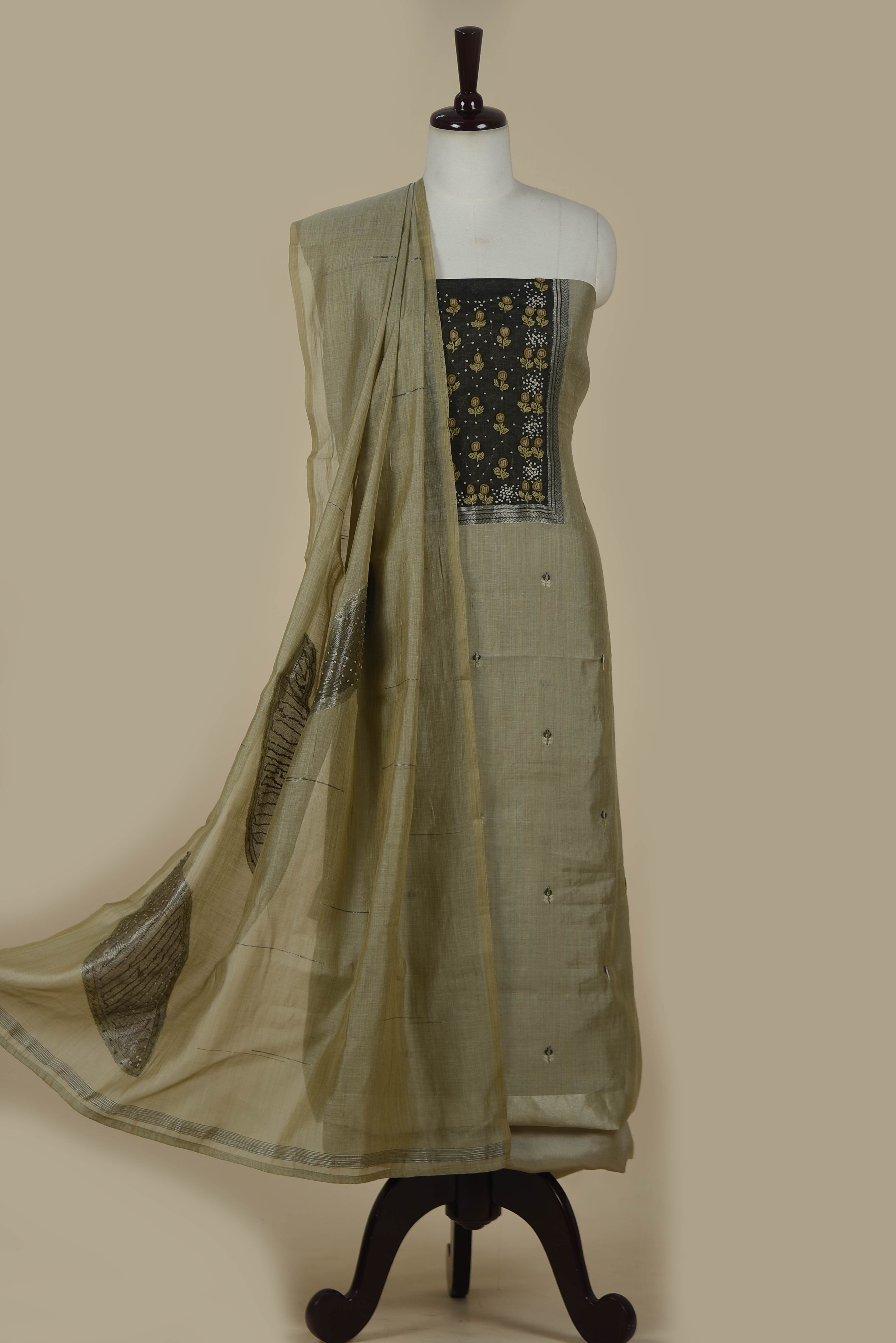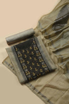 Beige With Grey Fine Chanderi Woven Embroidered Unstitched Suit Fabric Set With Fine Chanderi Embroidered Dupatta