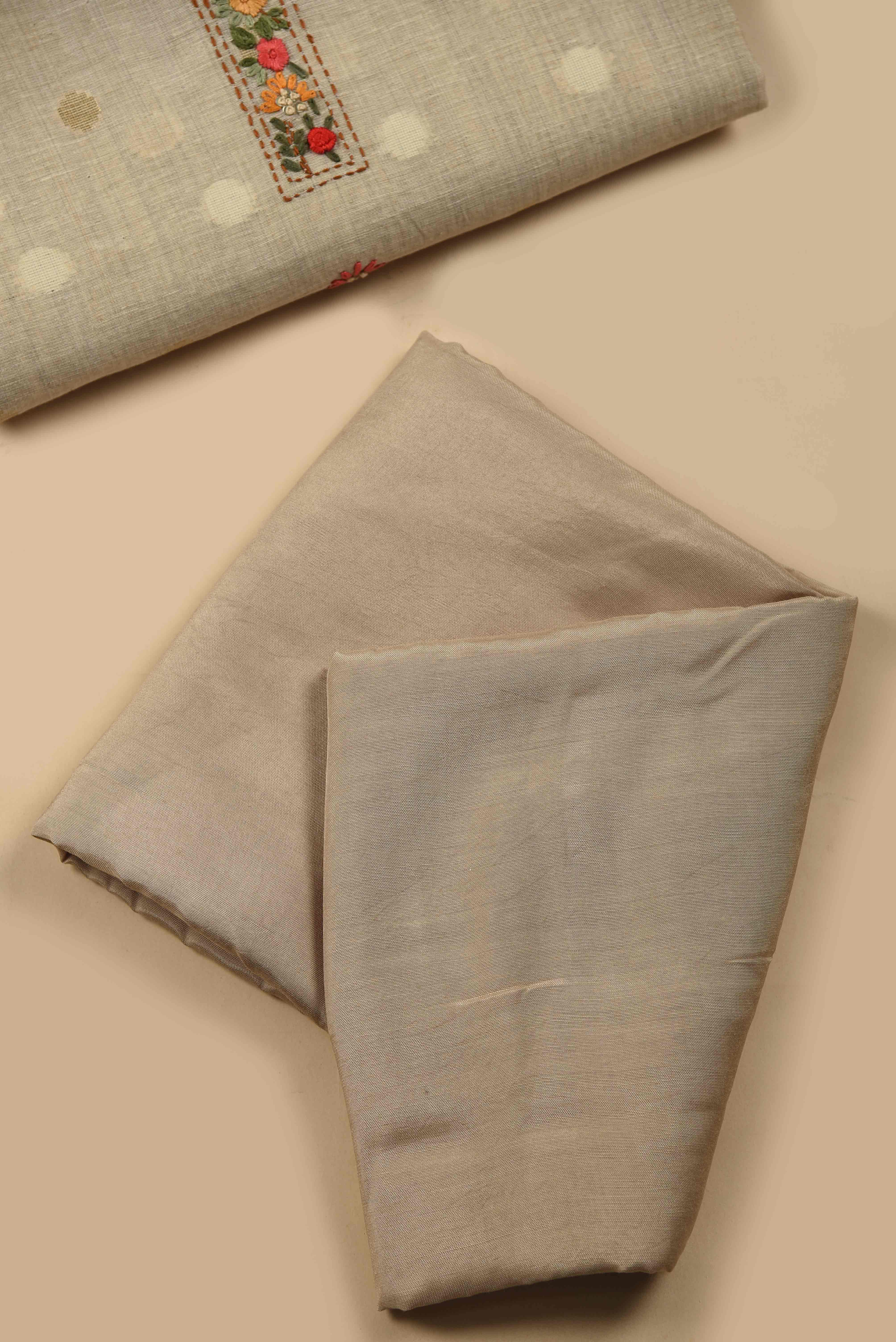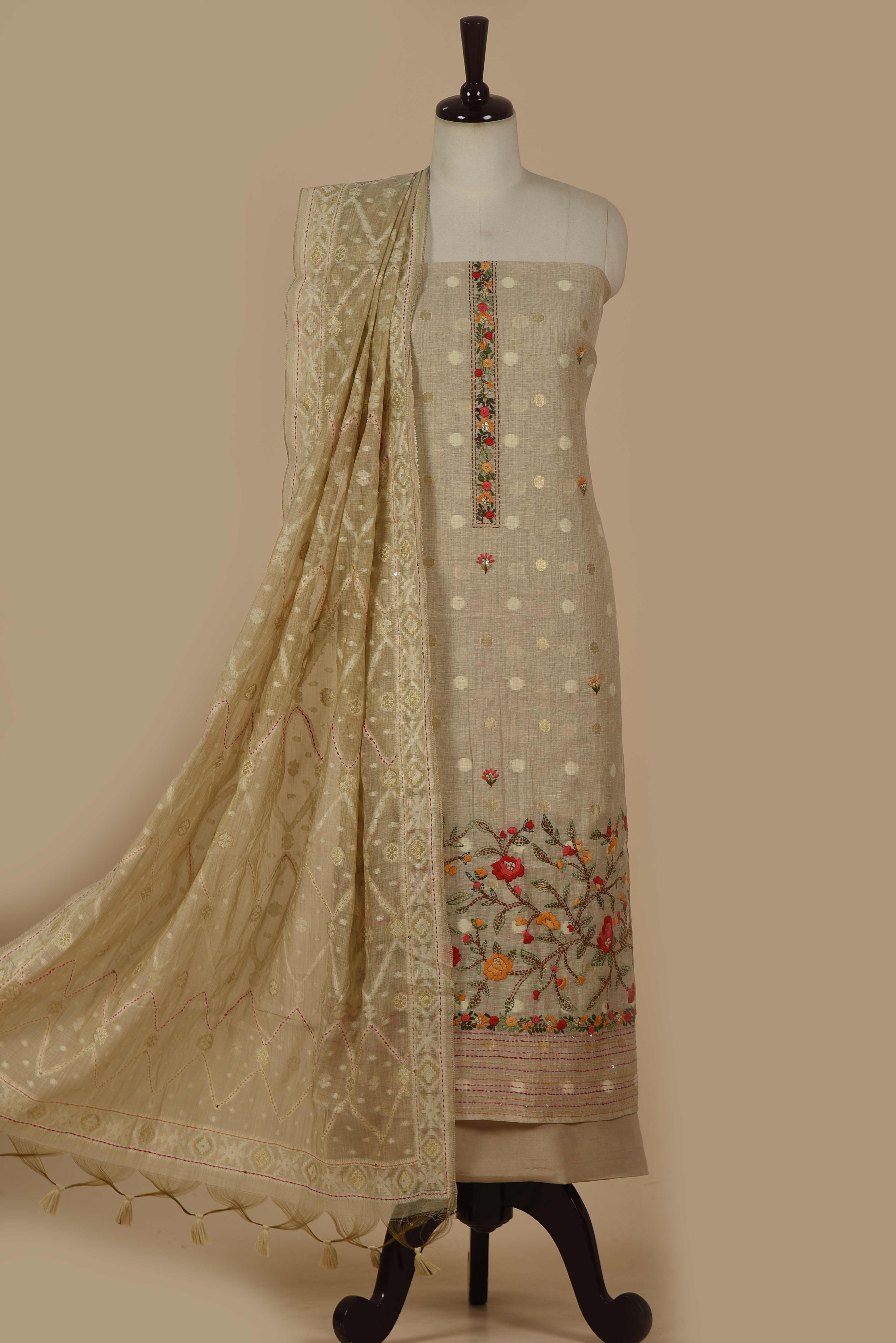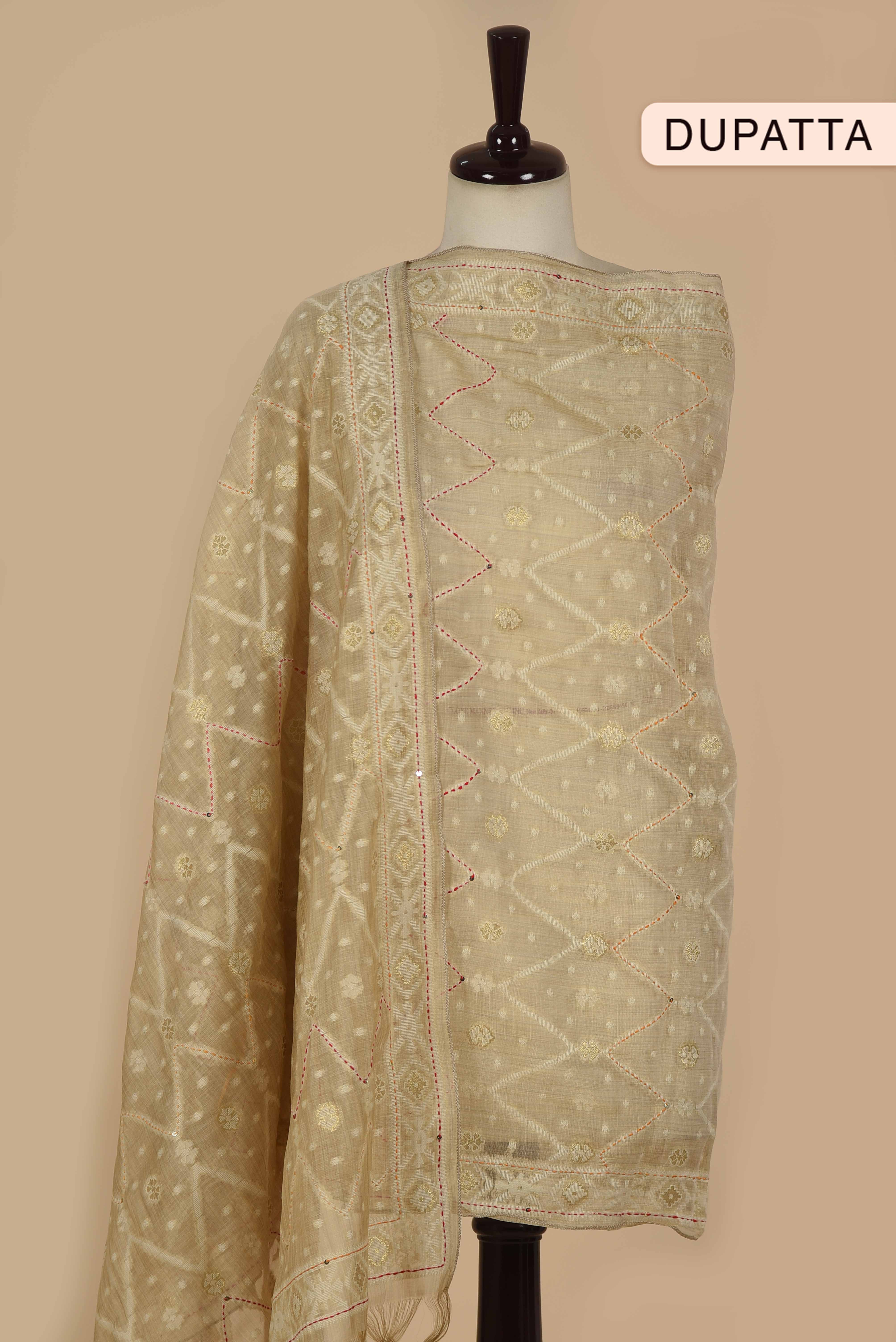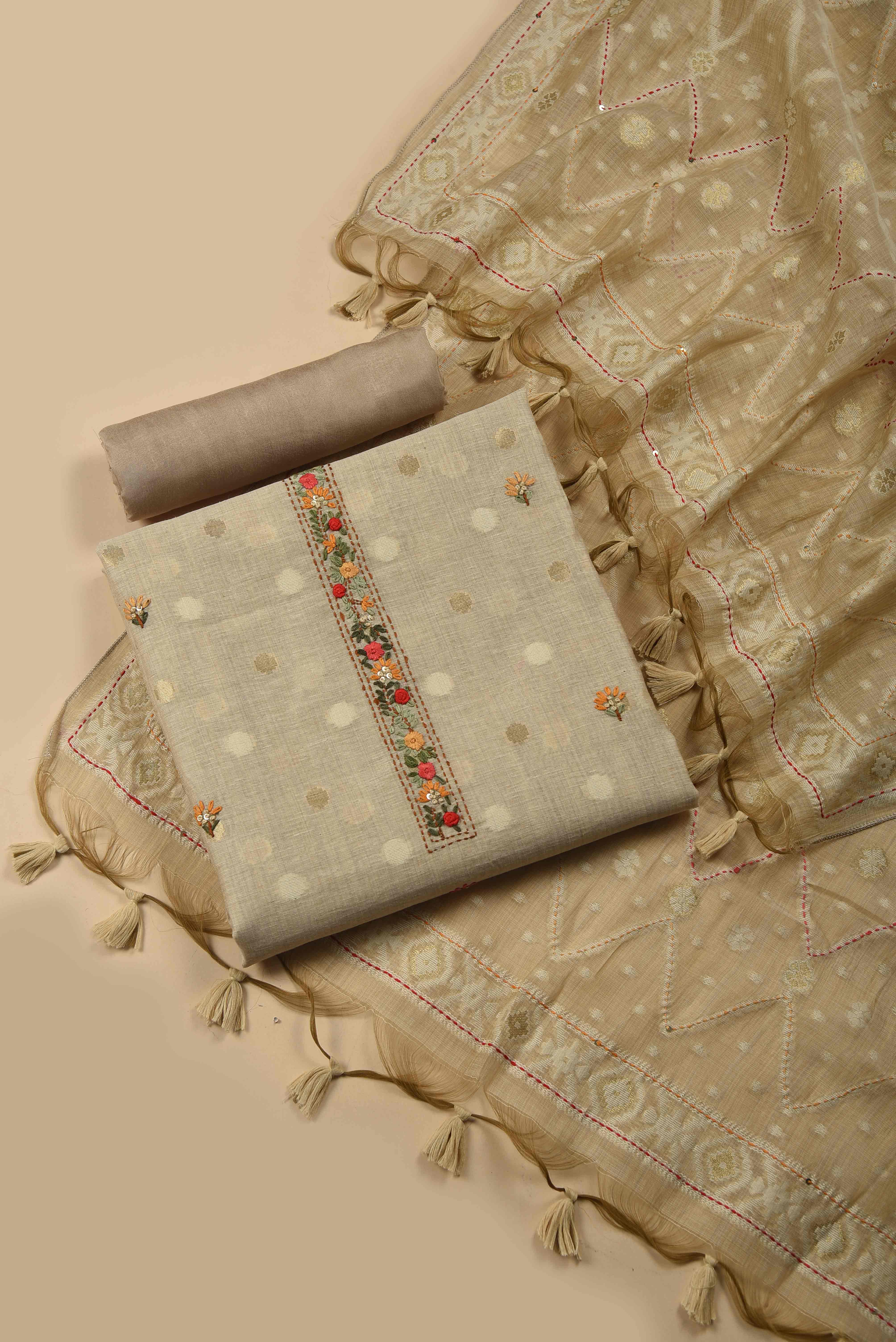 Beige With Mustard Chanderi Woven With Embroidered Unstitched Suit Fabric Set with Chanderi Embroidered Dupatta