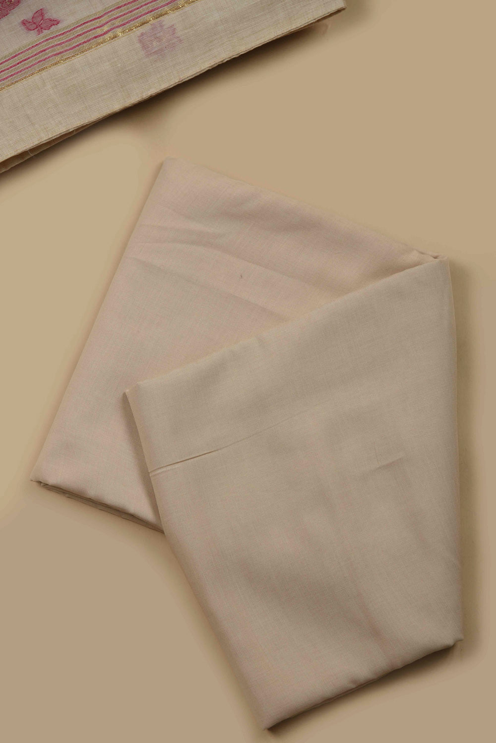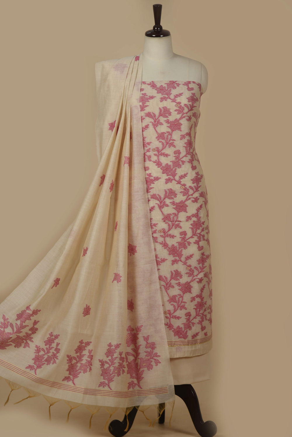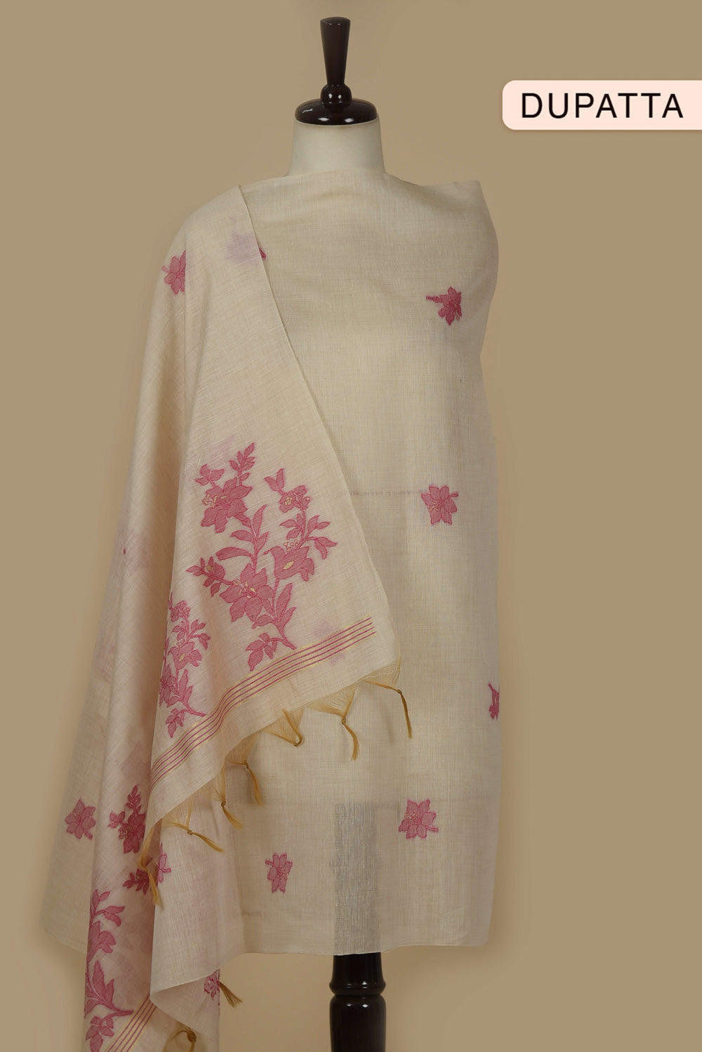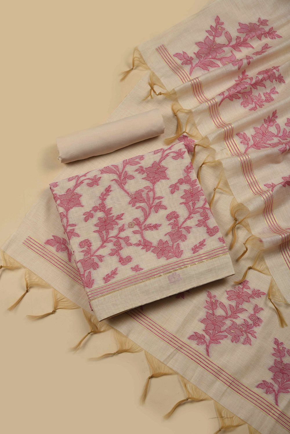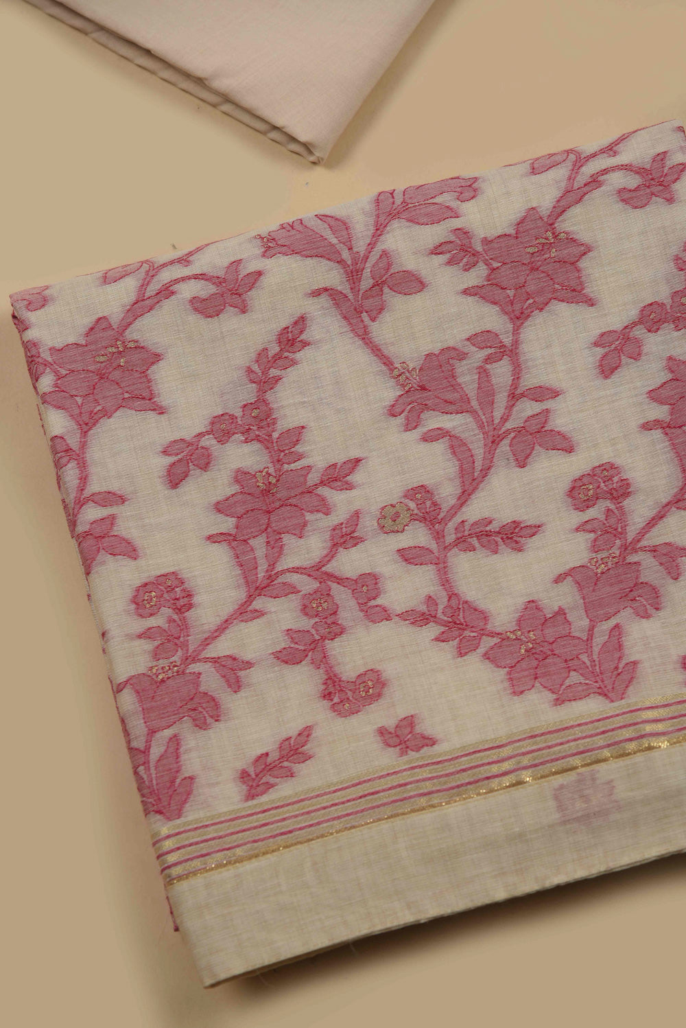 Beige With Pink Chanderi Woven Jamdani Unstitched Suit Fabric Set With Chanderi Woven Jamdani Dupatta