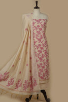 - Elevate your wardrobe with this exquisite Chanderi Woven Jamdani unstitched suit fabric set, featuring a sophisticated Beige base complemented by striking Pink accents.