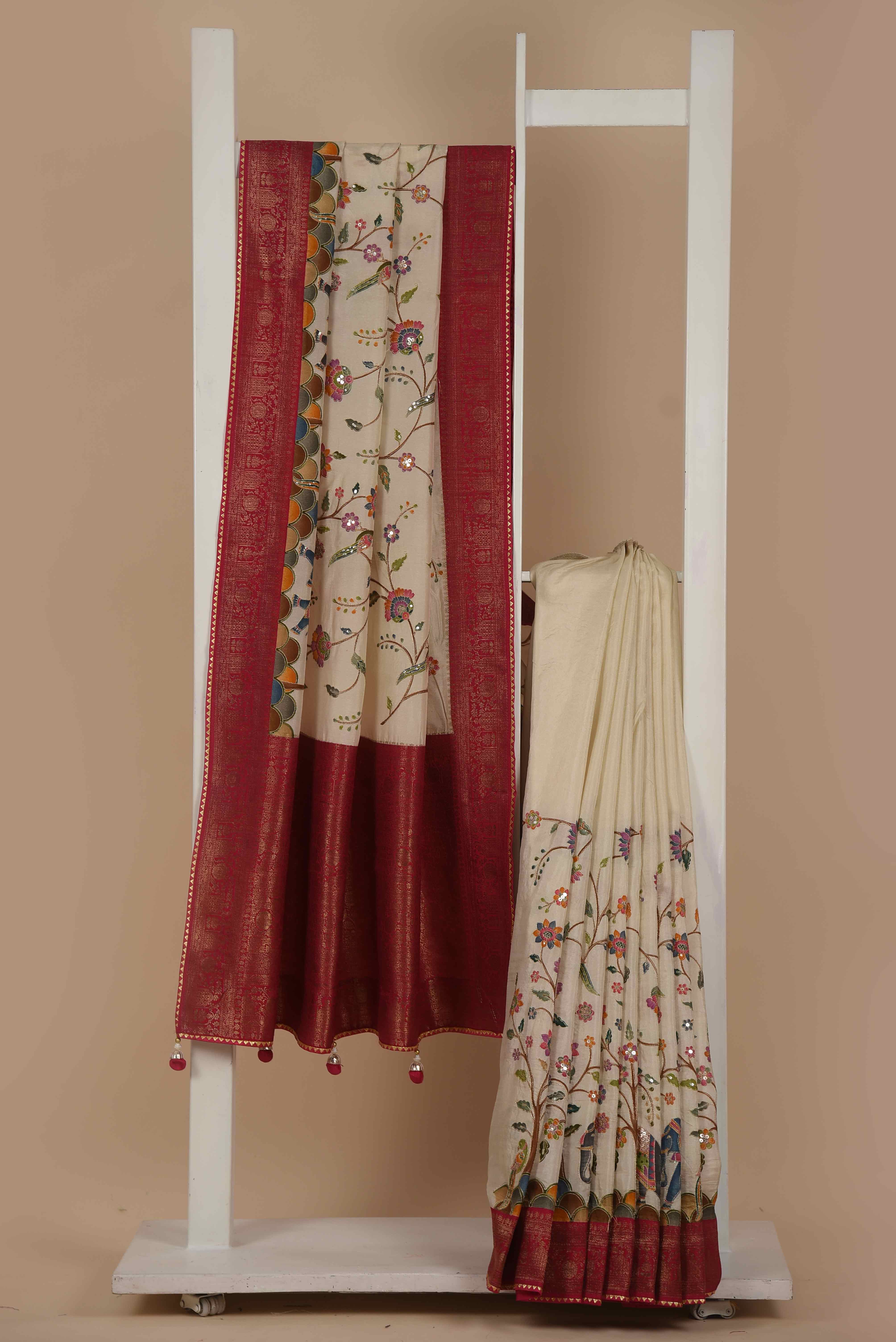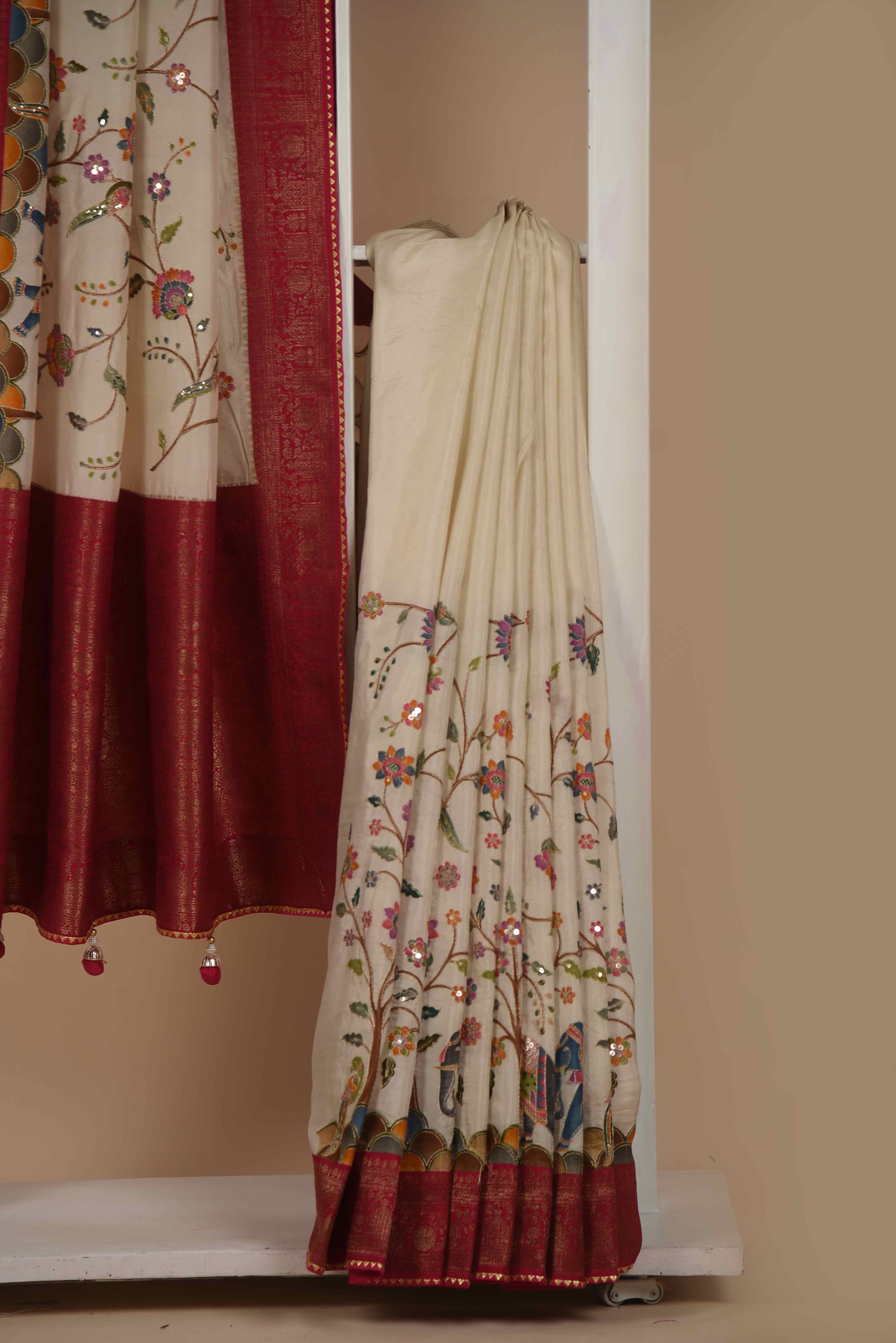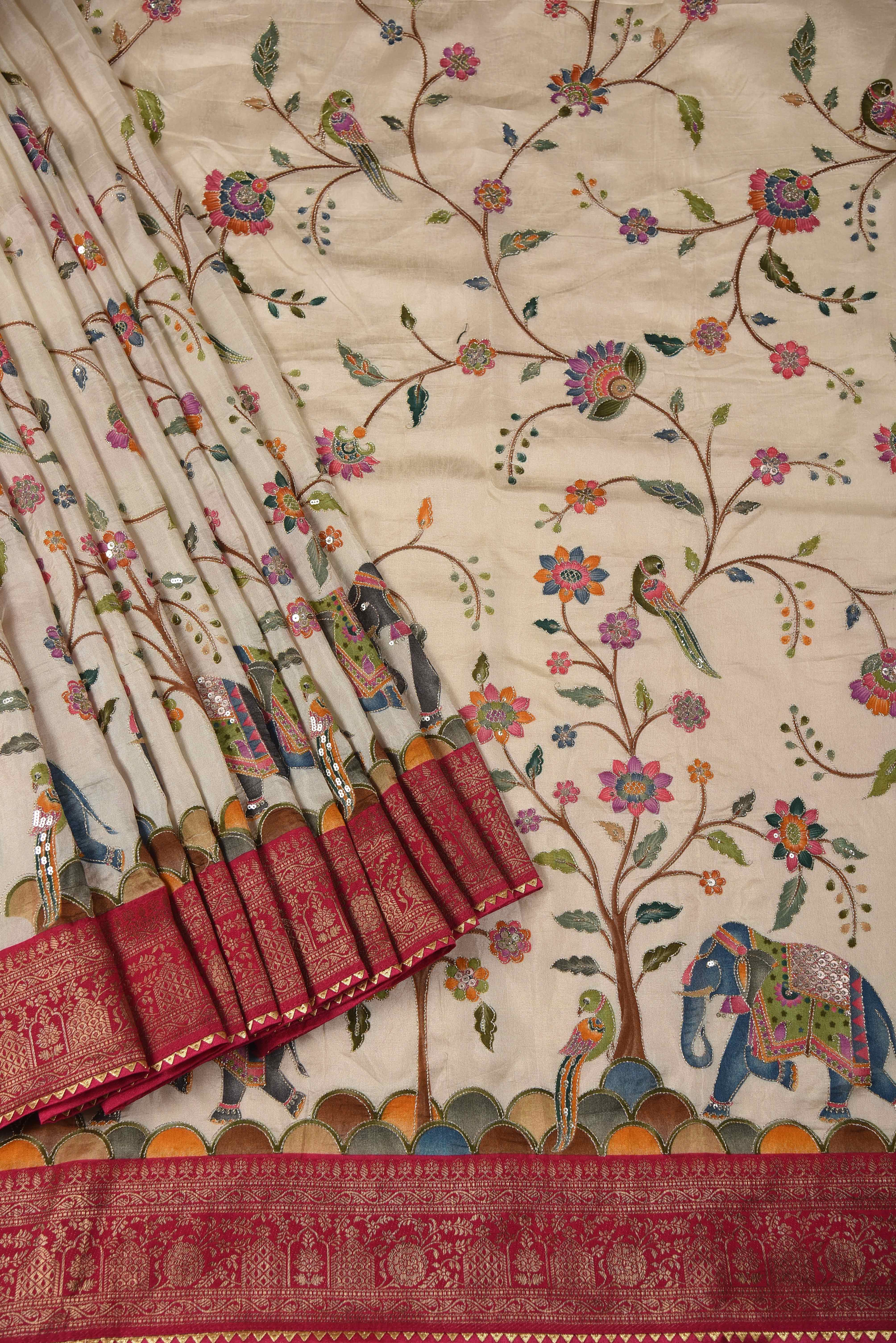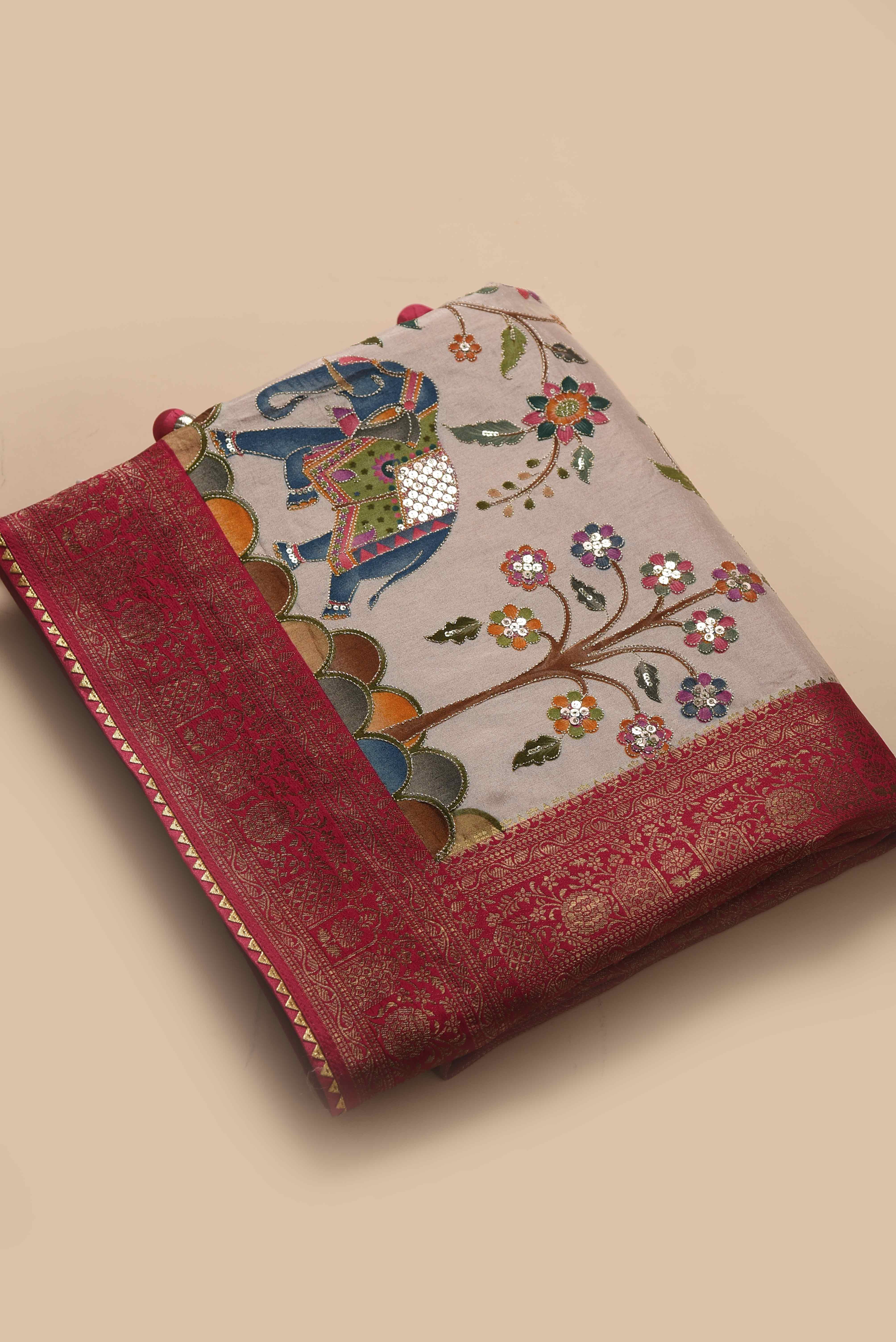 Beige With Pink Silk Woven With Embellished Saree with Silk Blouse