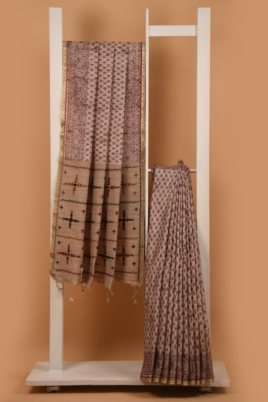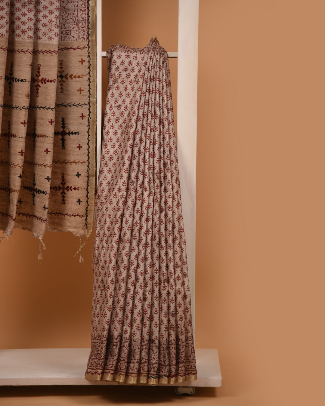 Expertly crafted with soft chanderi silk, this beige saree features beautiful hand block prints on the body.