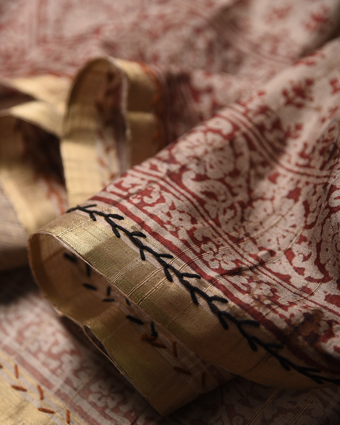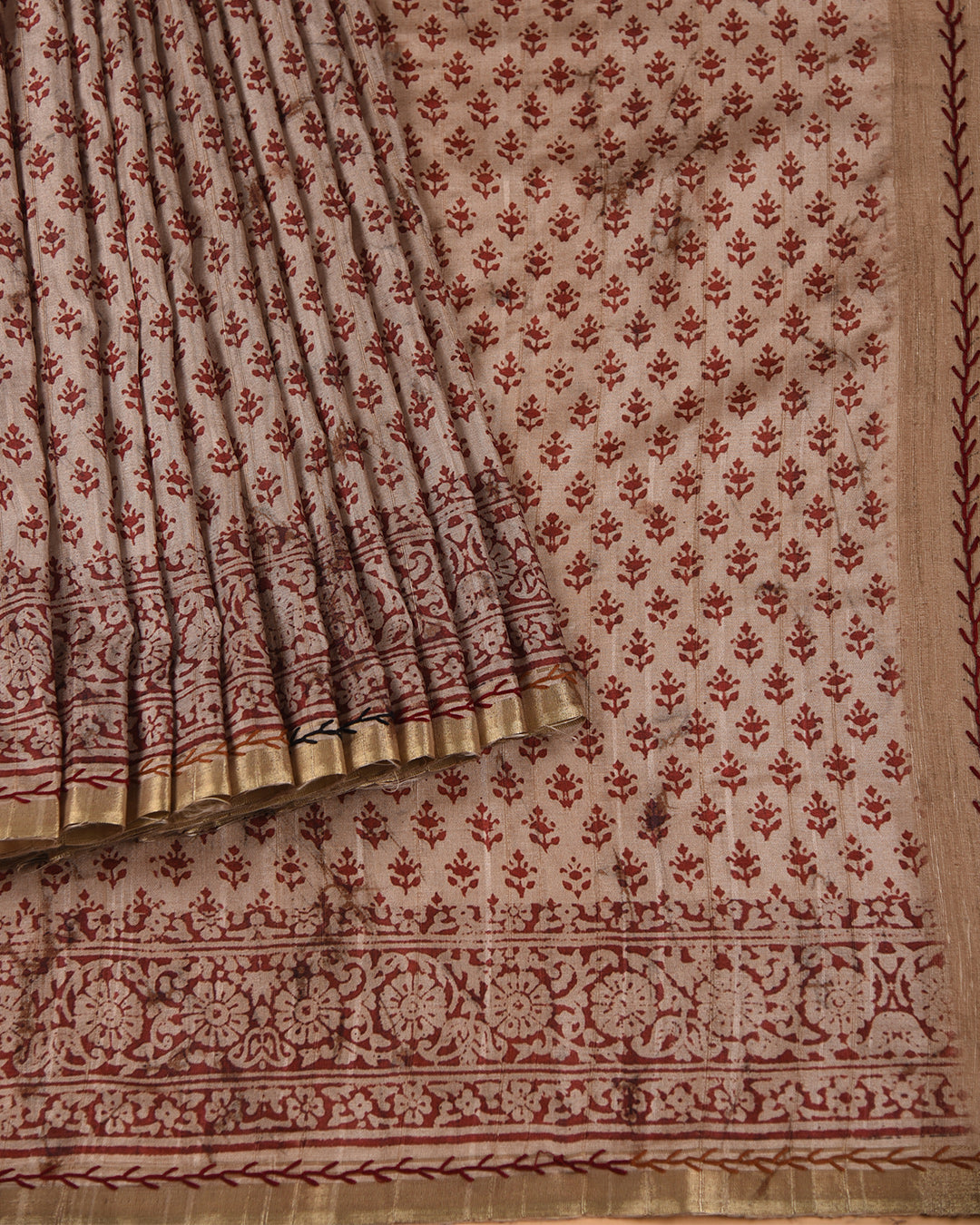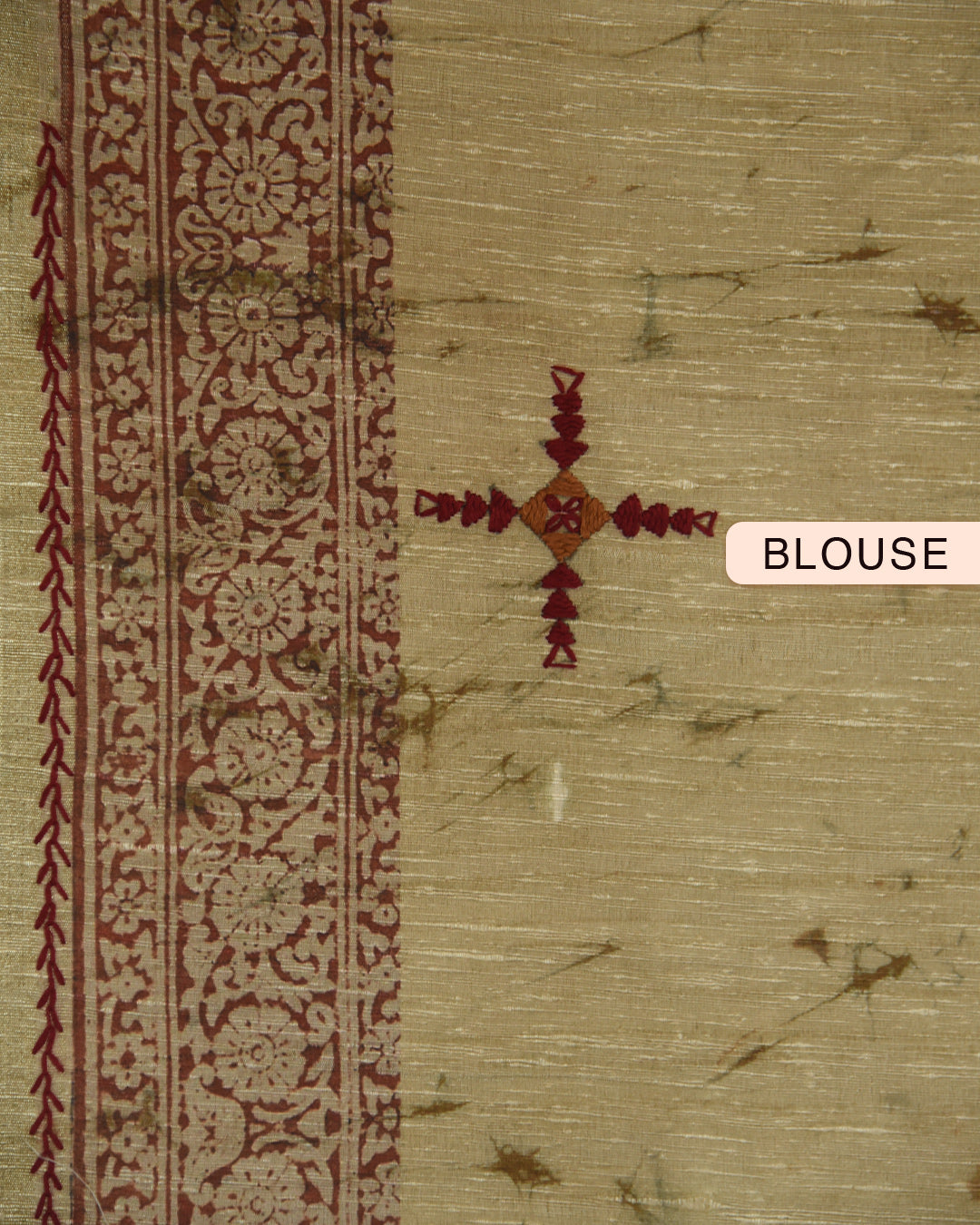Beige With Rust Chanderi Silk Blend Hand Block Printed With Embroidery Saree With Chanderi Silk Embroidered Blouse