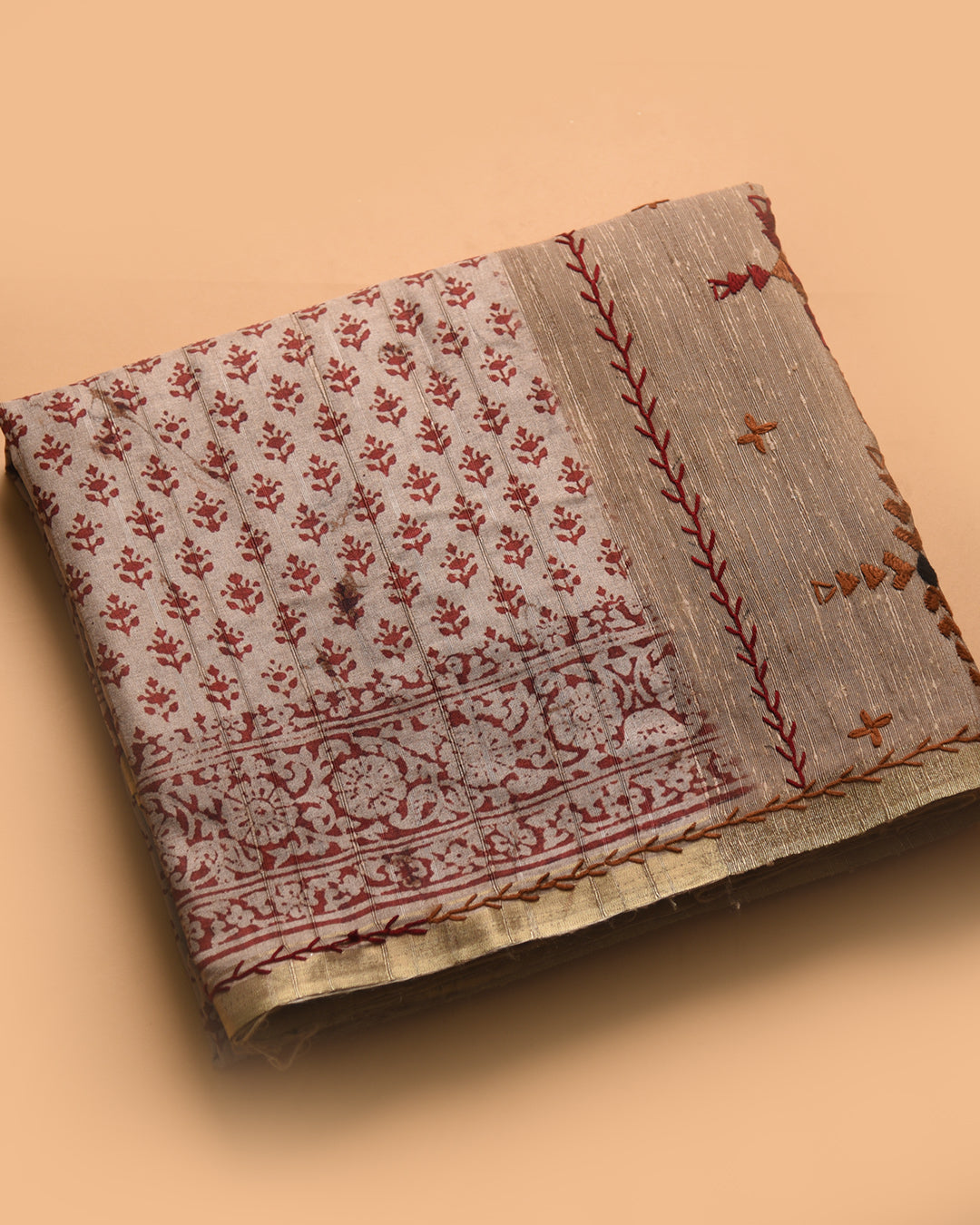 The geecha silk pallu is adorned with exquisite kantha embroidery, making it perfect for important meetings or award ceremonies.