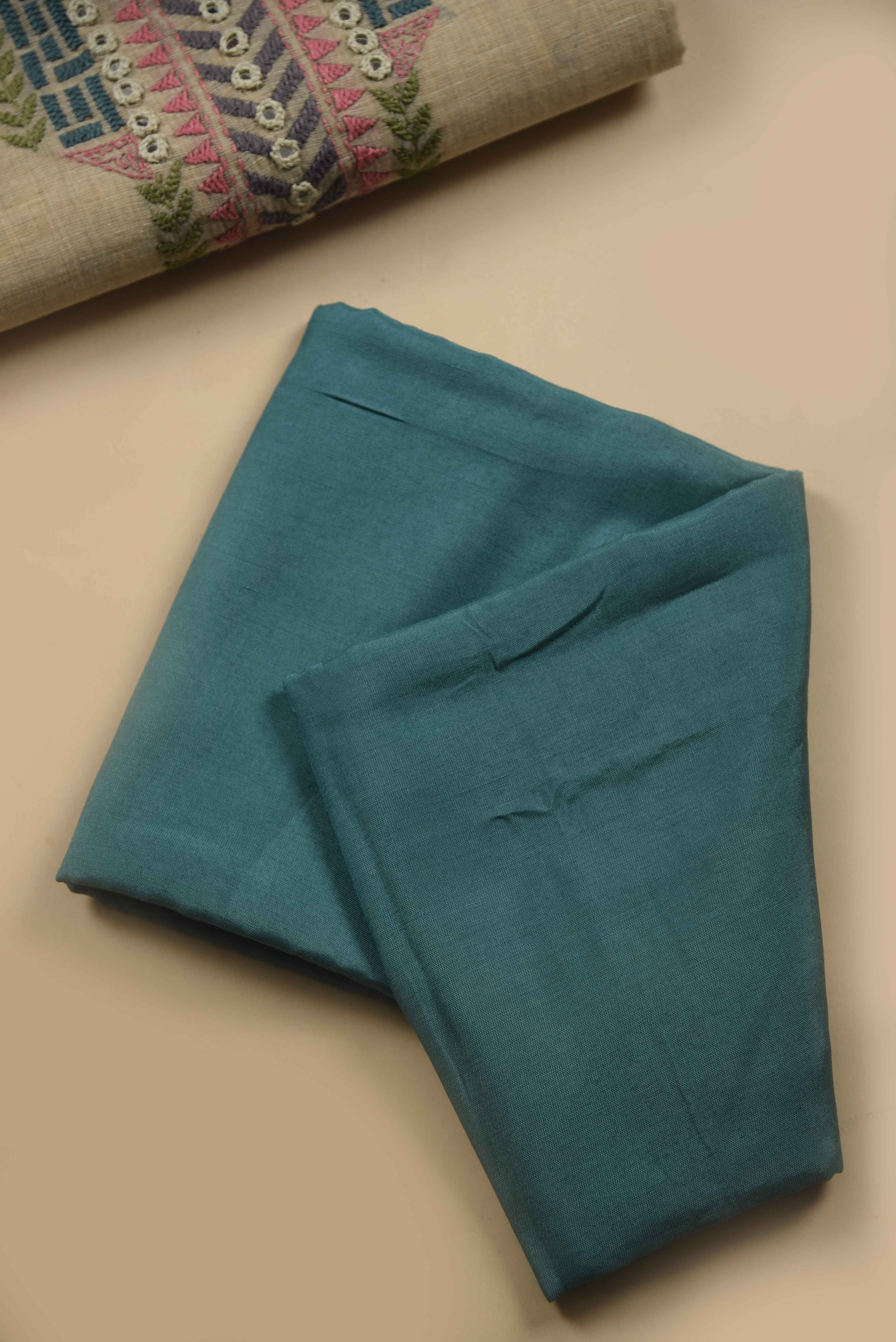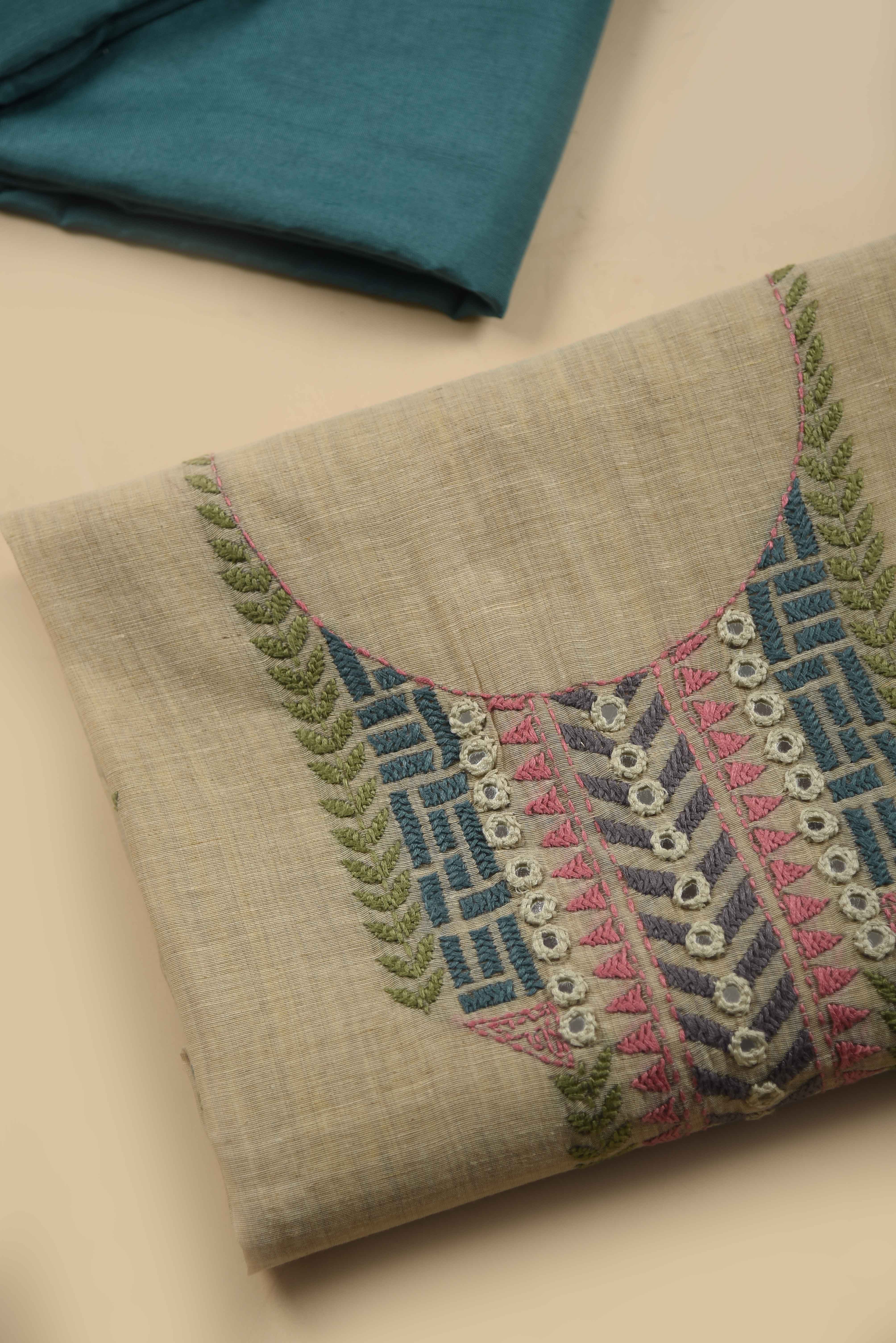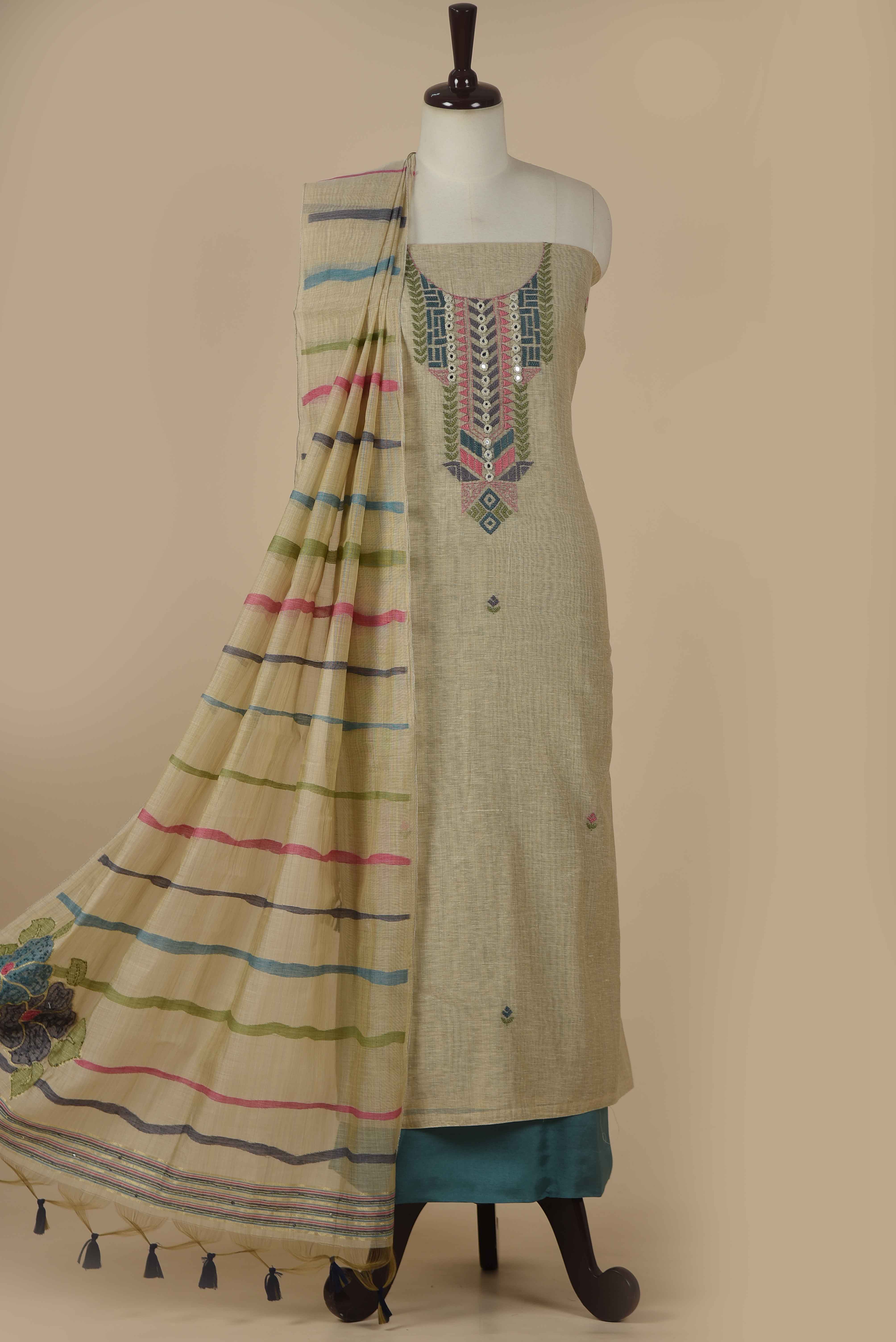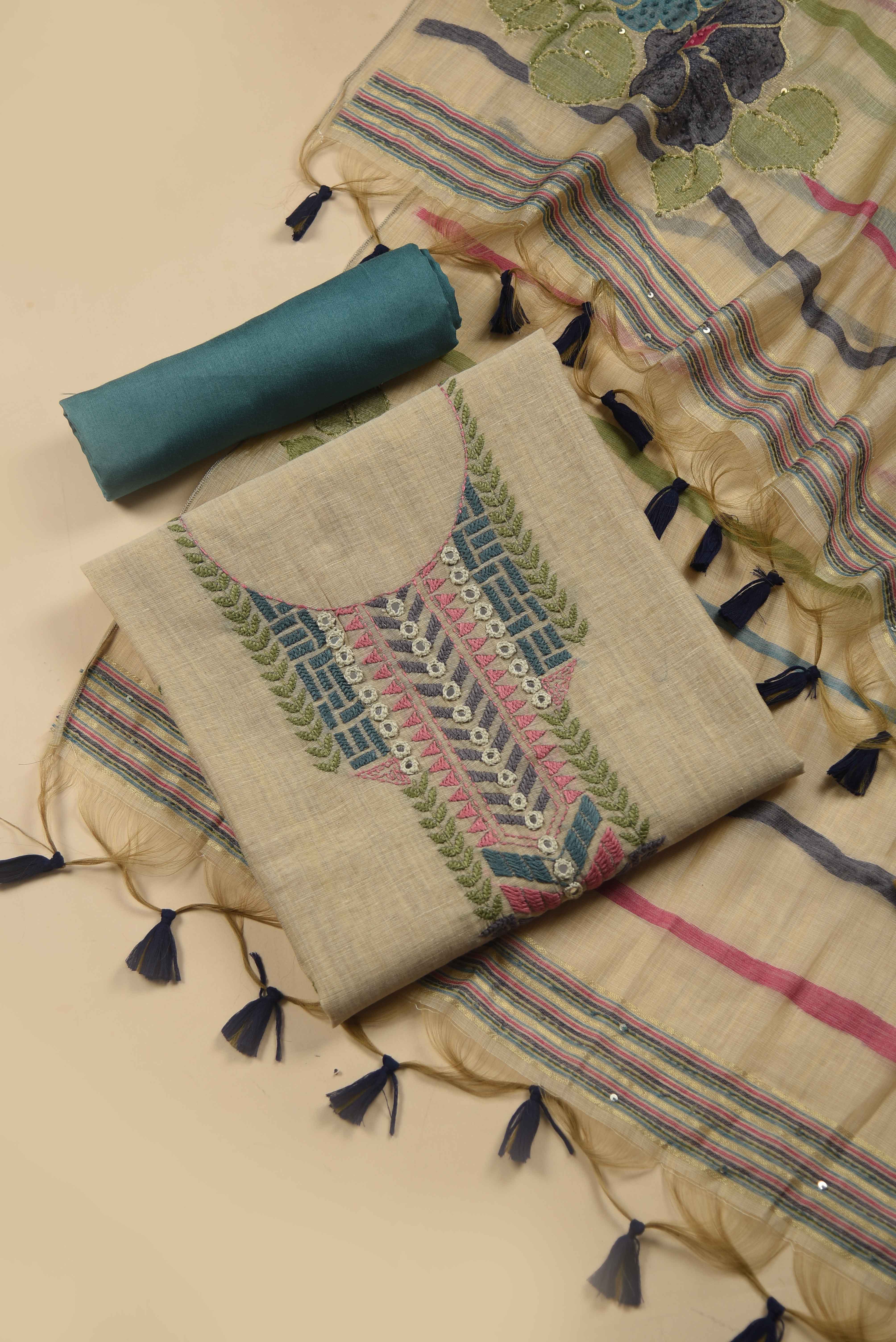 Beige With Turquoise Chanderi Embroidered Unstitched Suit Fabric Set With Chanderi Woven Dupatta