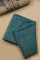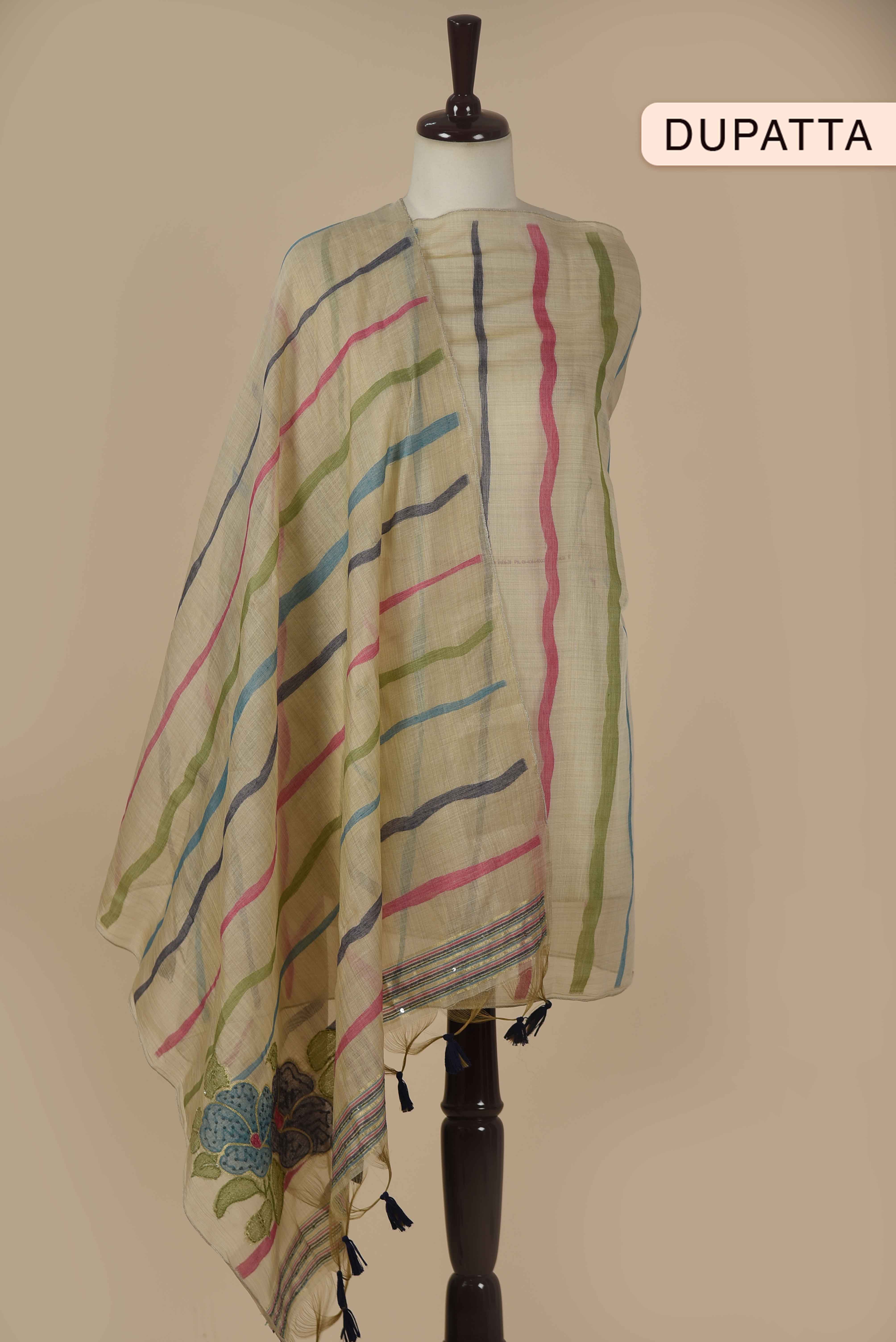 - Beige with Turquoise Chanderi Embroidered Unstitched Suit Fabric Set with Chanderi Woven Dupatta.