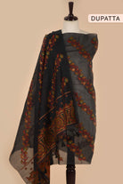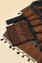 - This Black Chanderi Silk Blend Jamdani unstitched suit fabric set expertly blends traditional craftsmanship with modern style.