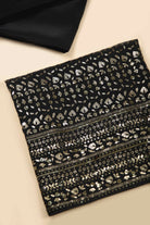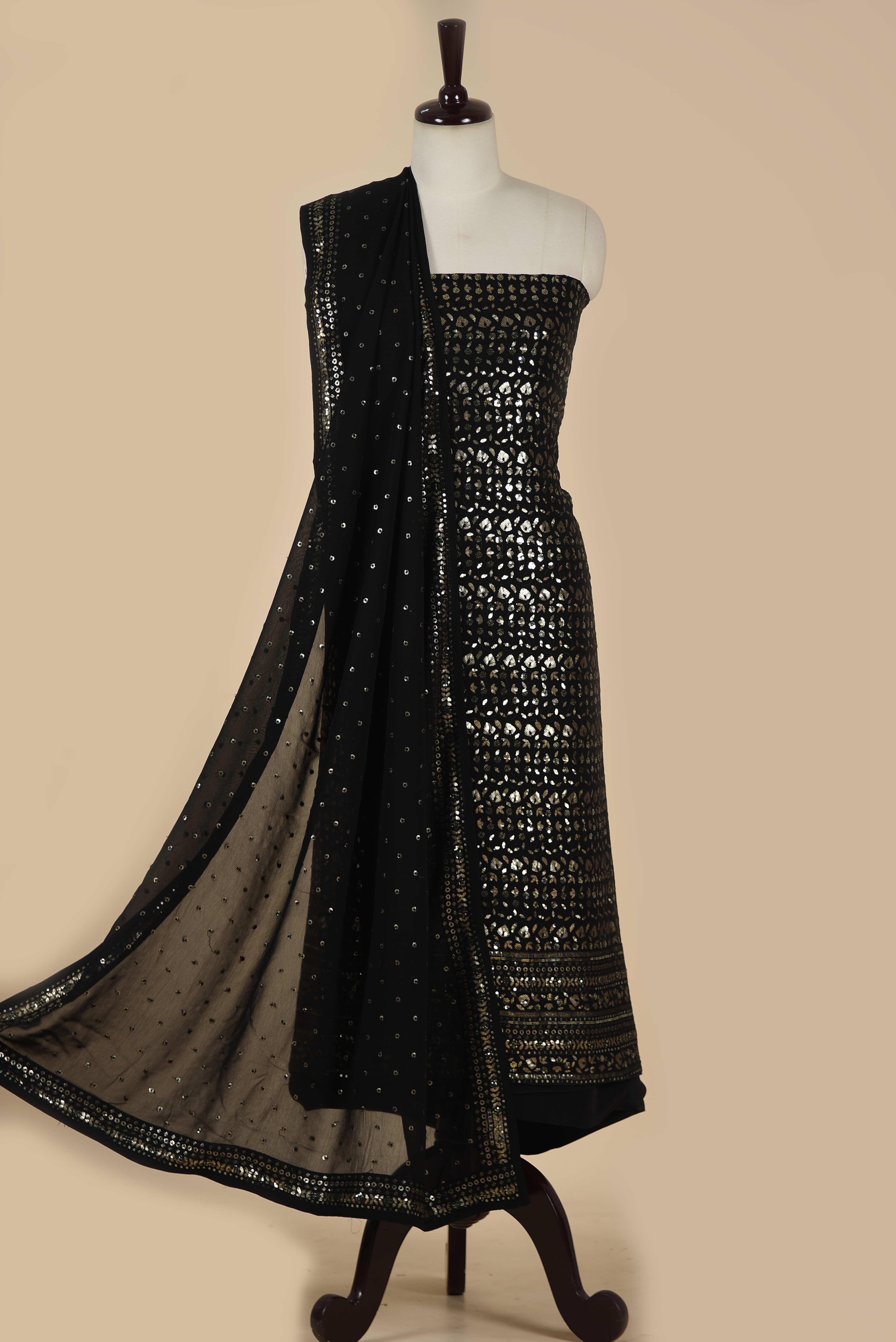 - This Black Georgette unstitched suit fabric set features exquisite sequins embellishments that add a festive sparkle to the ensemble.