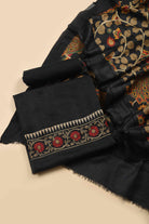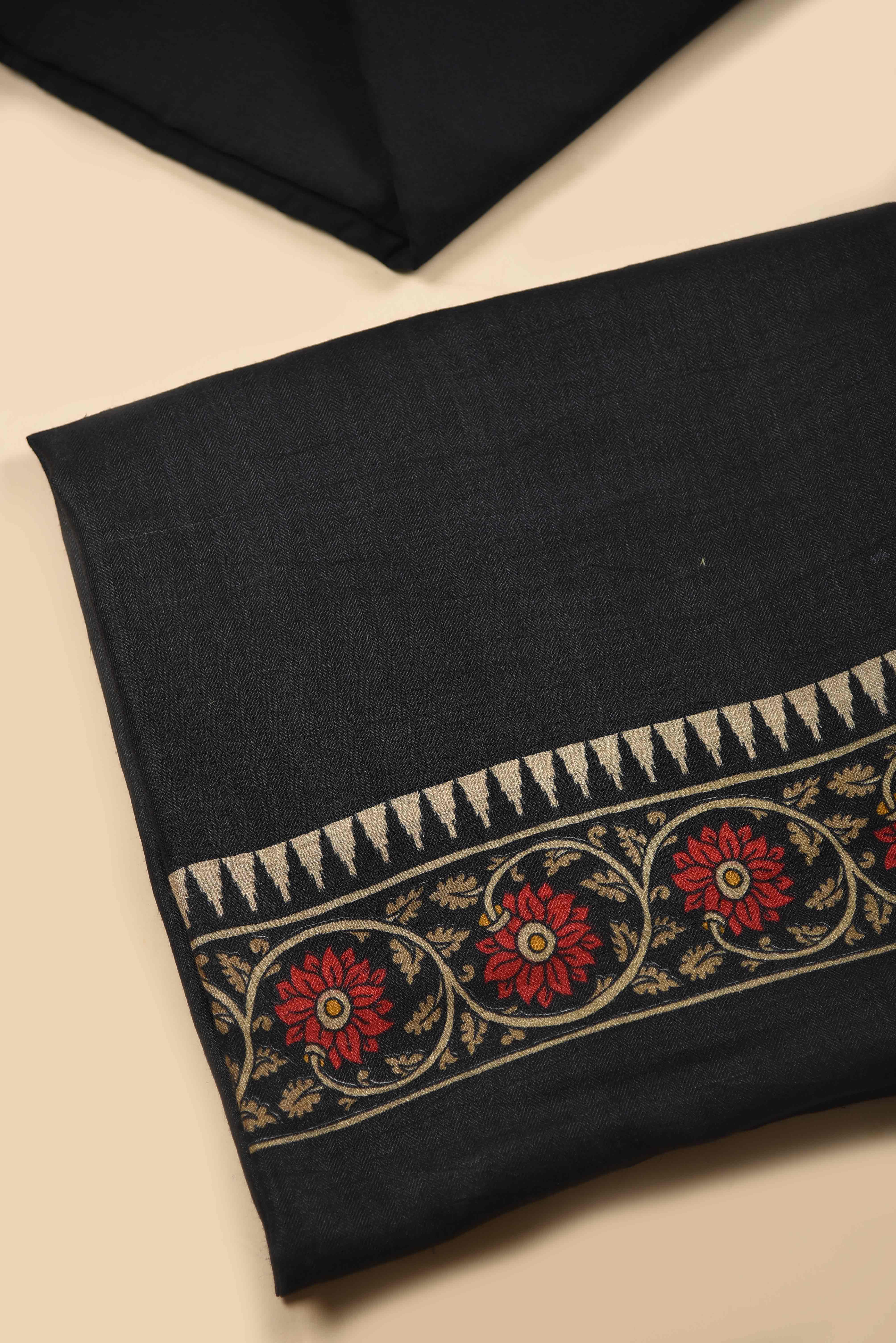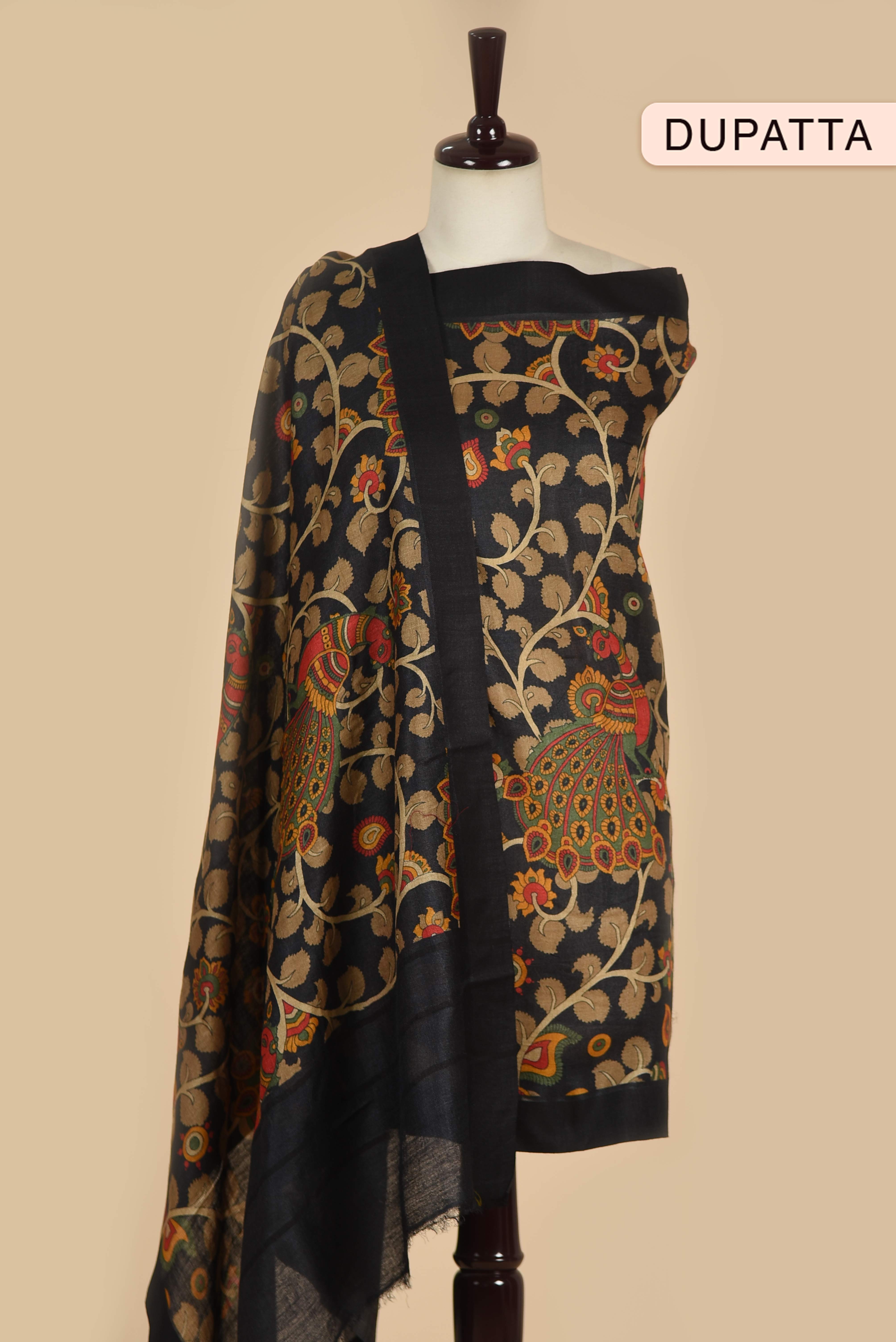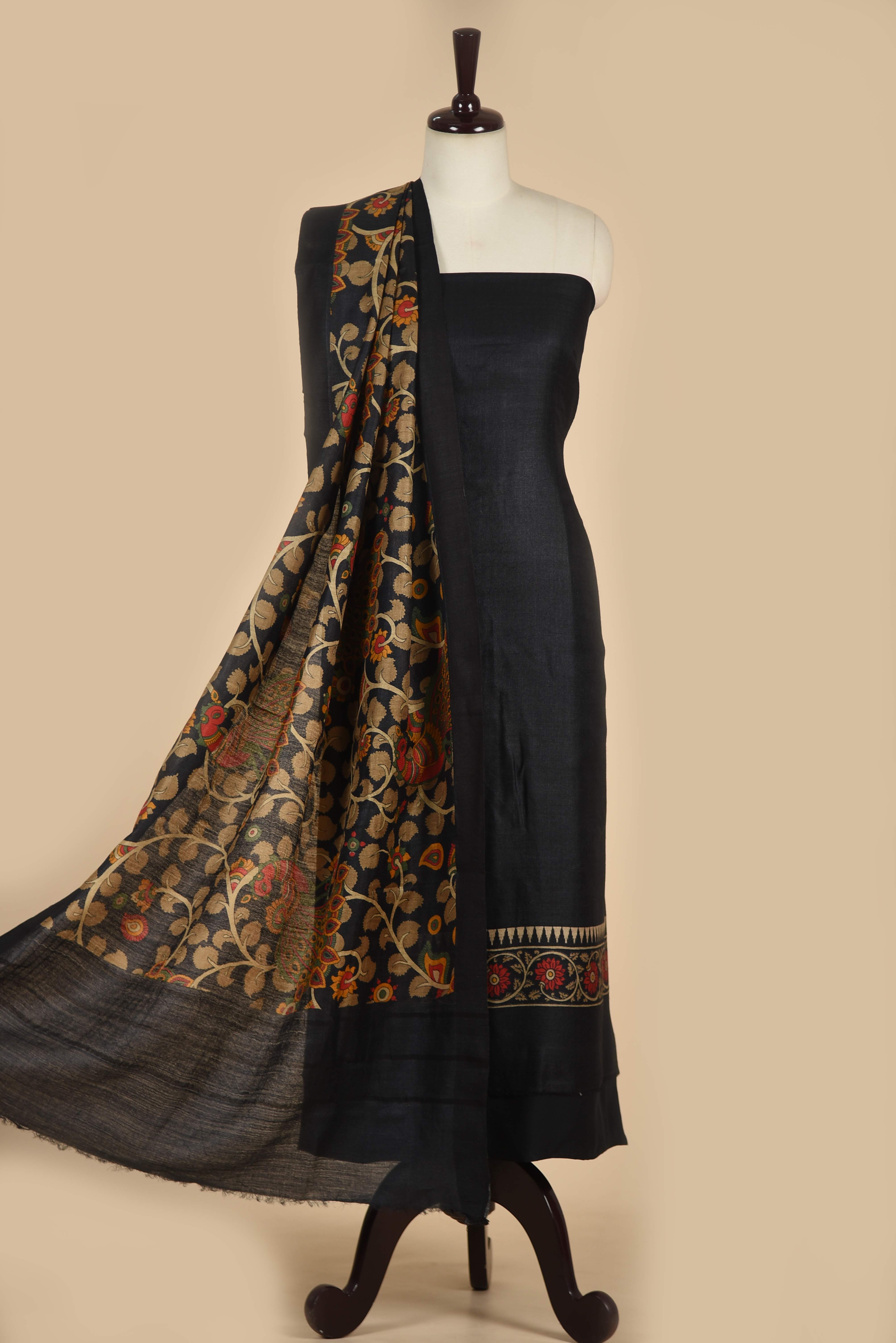 Black Handloom Silk Printed Unstitched Suit Fabric Set With Printed Dupatta