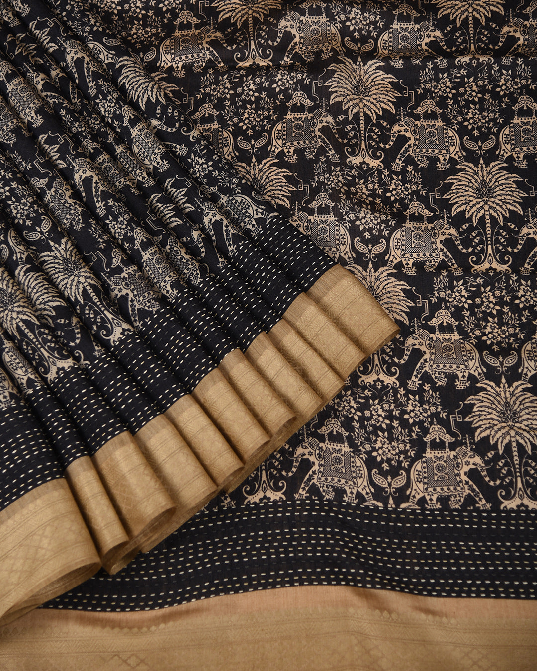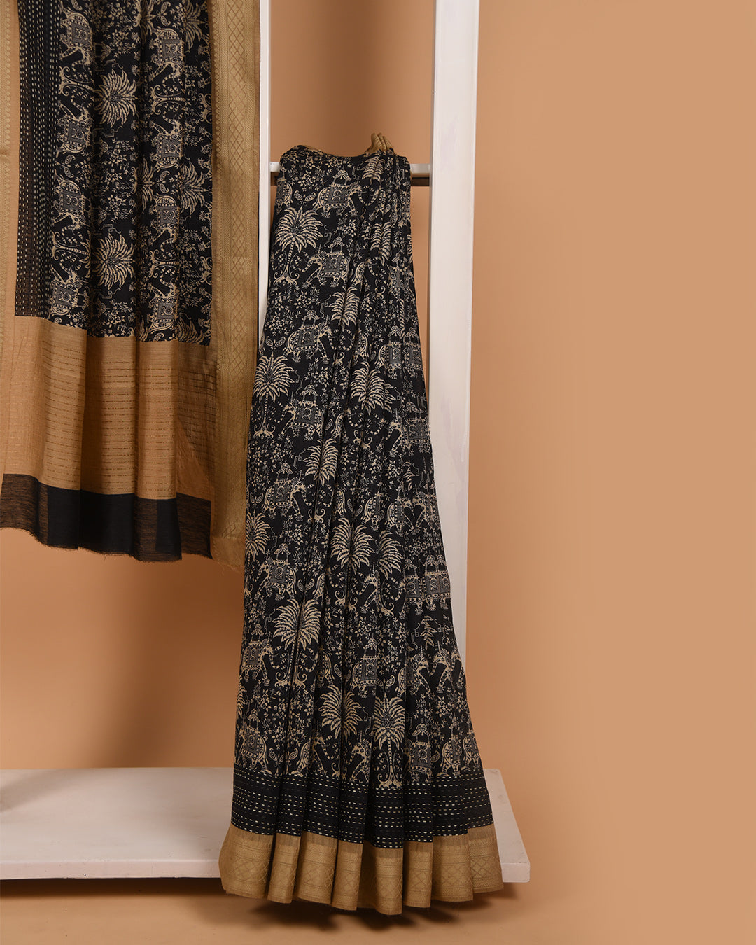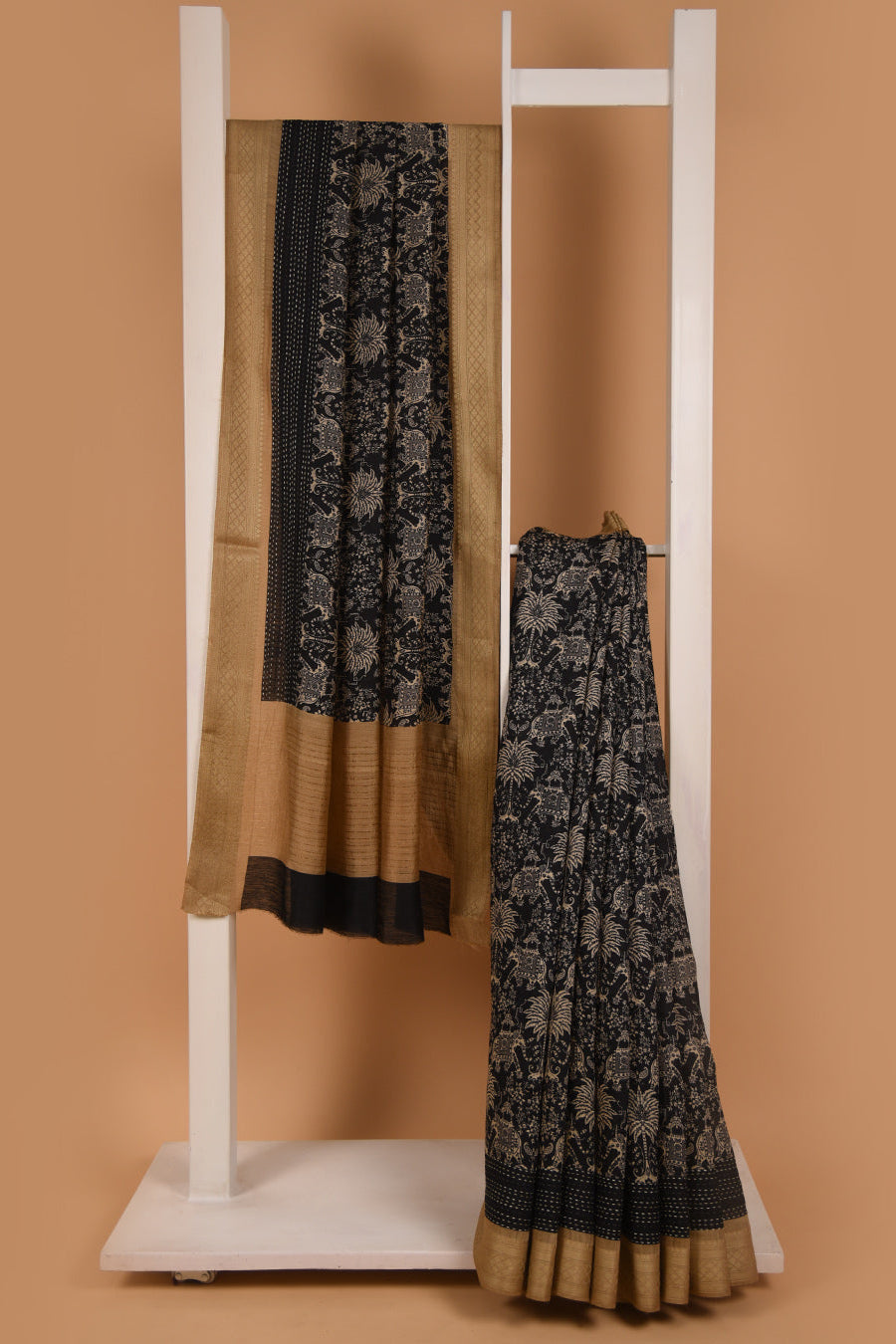 Black Pure Handloom Silk Embroidered Saree With Contrast Tussar Silk Blouse