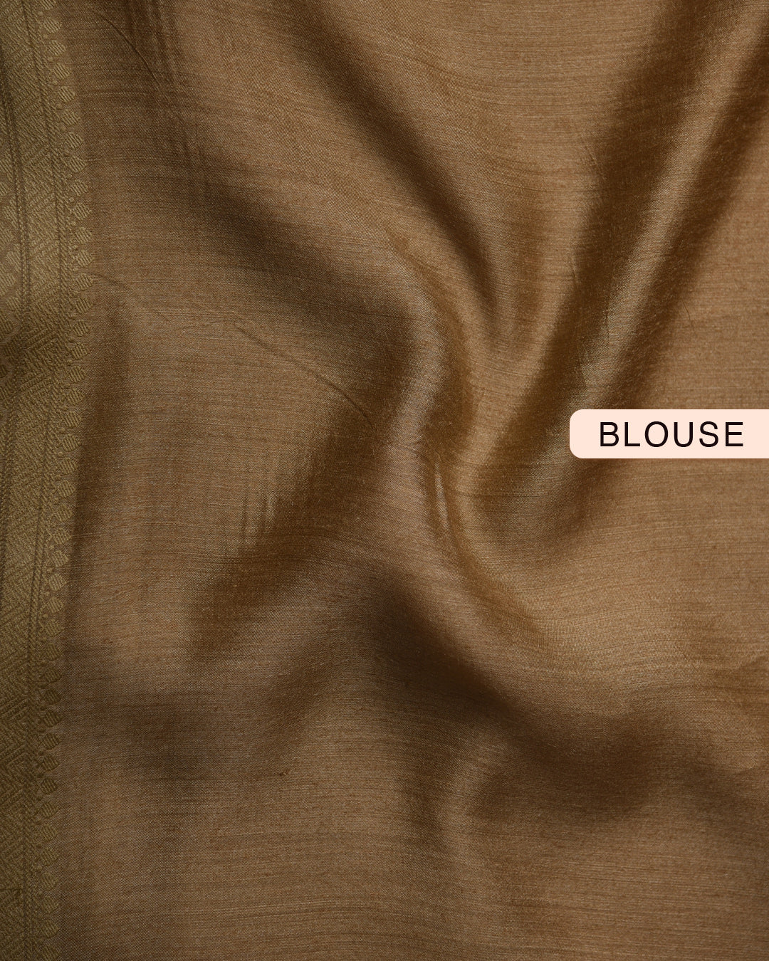 The contrasting tussar silk blouse in beige adds a contemporary touch to the traditional woven borders and pallu.