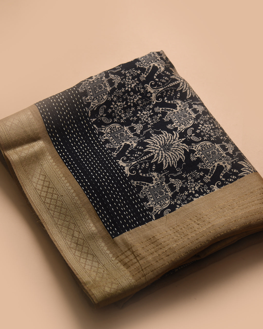 Expertly handcrafted in pure handloom silk fabric, this limited edition saree boasts artisanal prints with kantha thread embroidery.