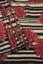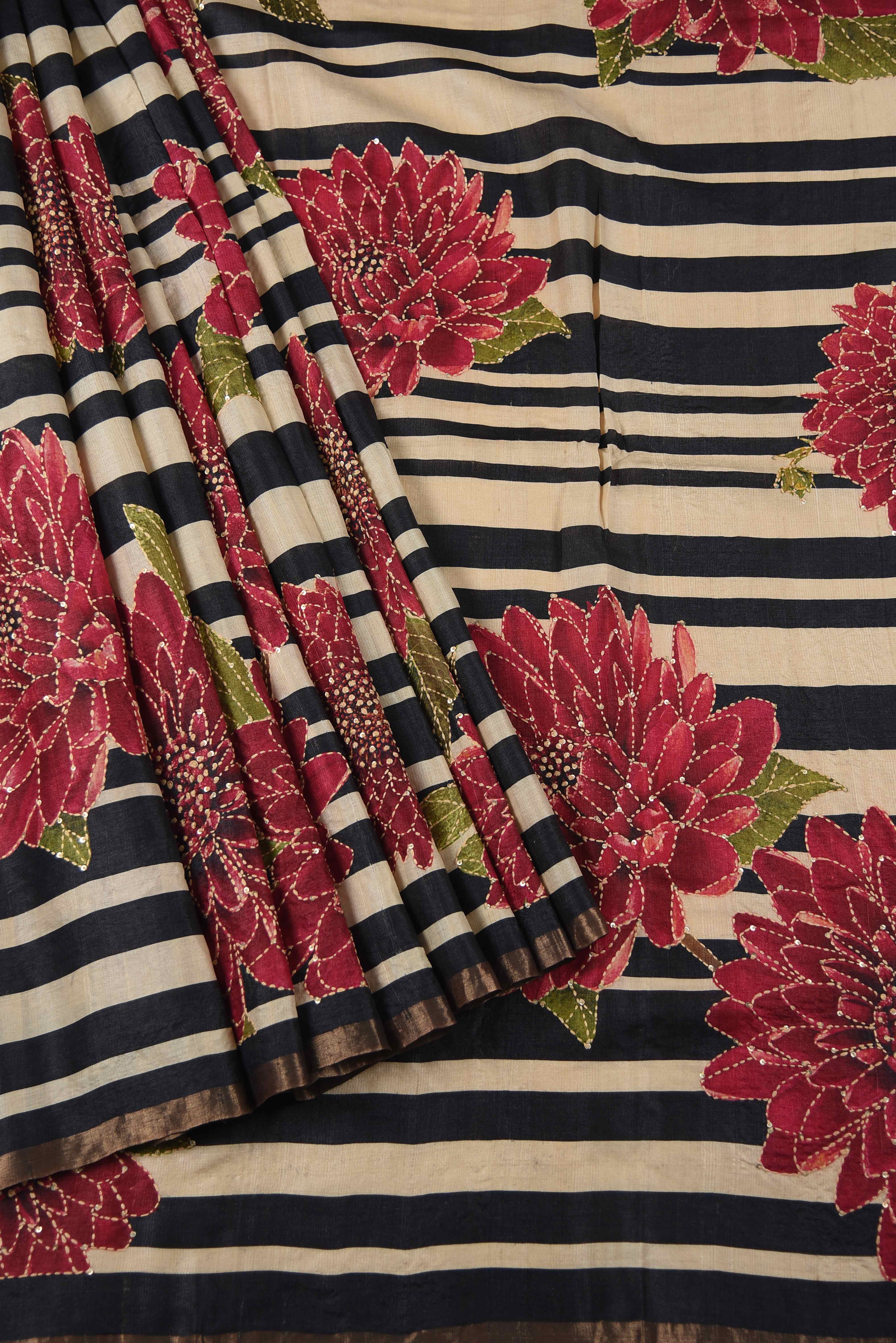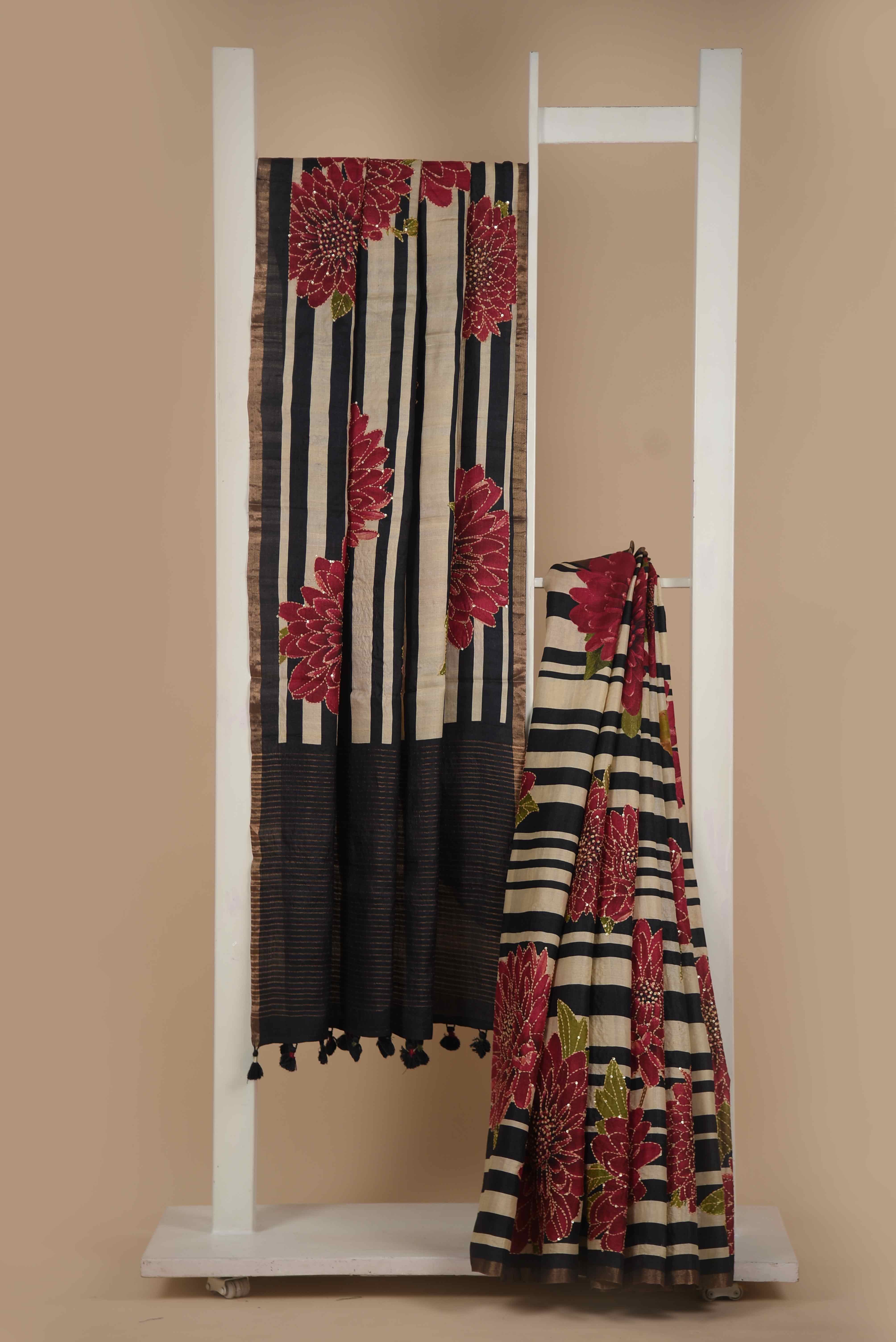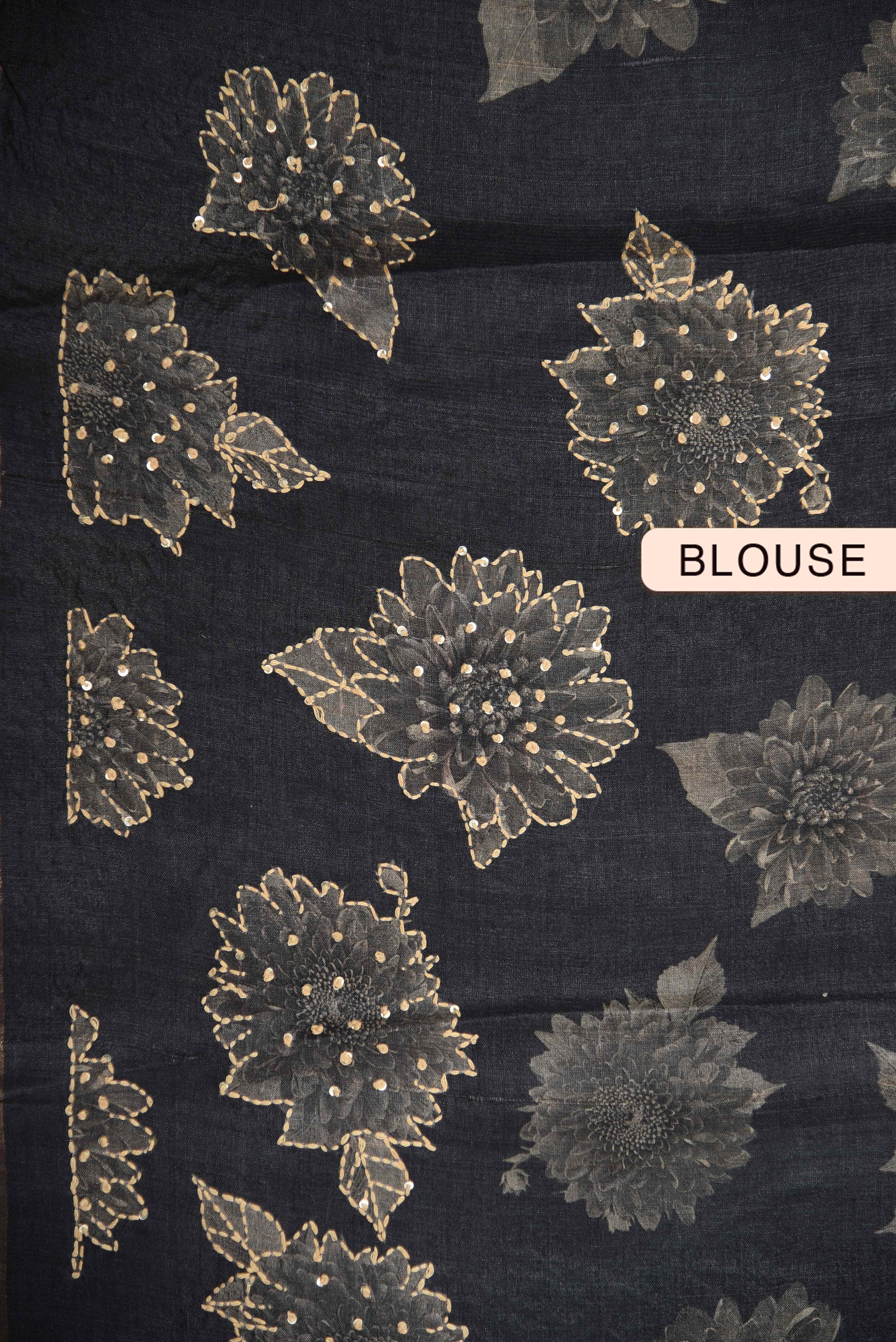 Black With Beige Tussar Silk Printed With Embroidered Saree with Embroidered Tussar Silk Blouse