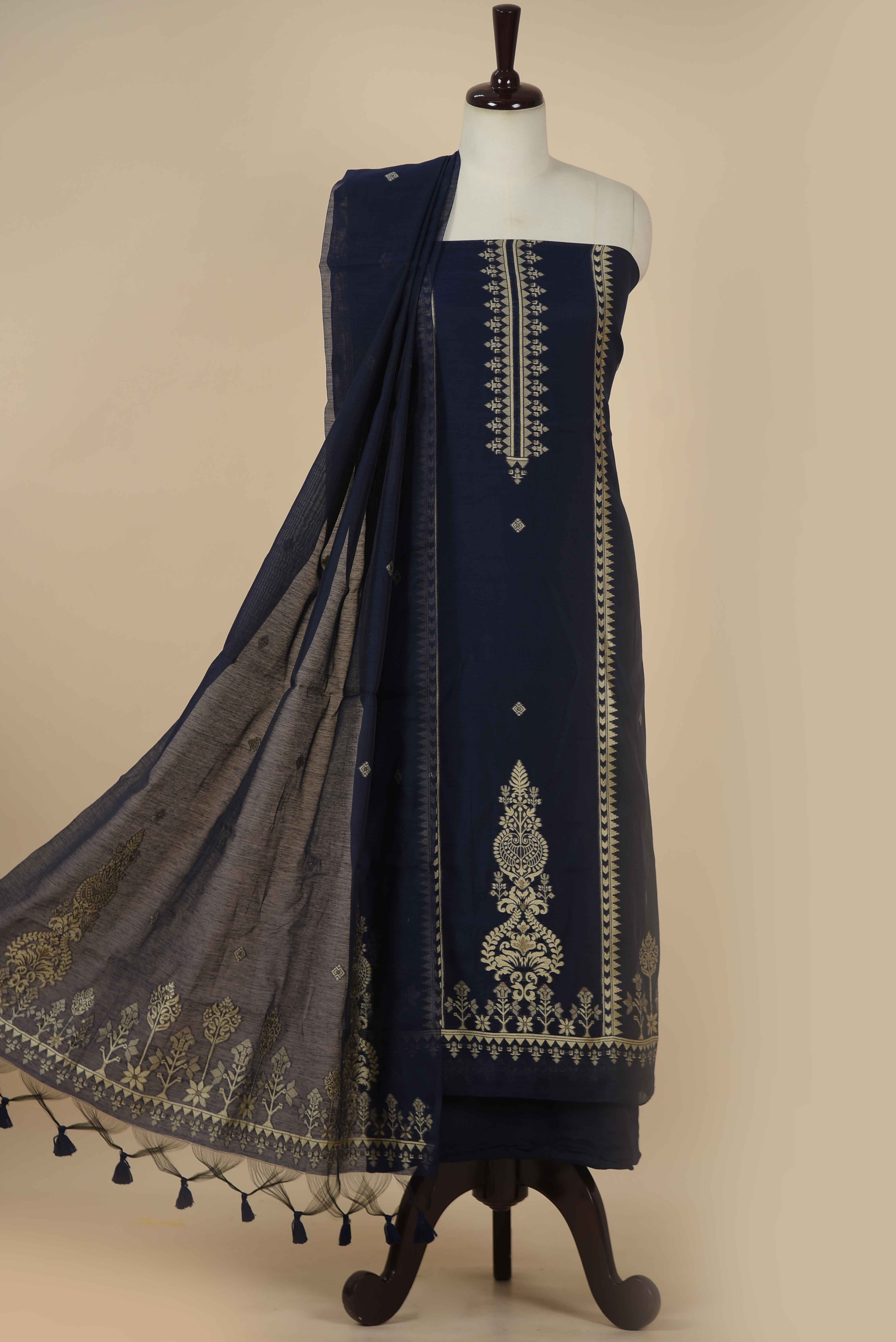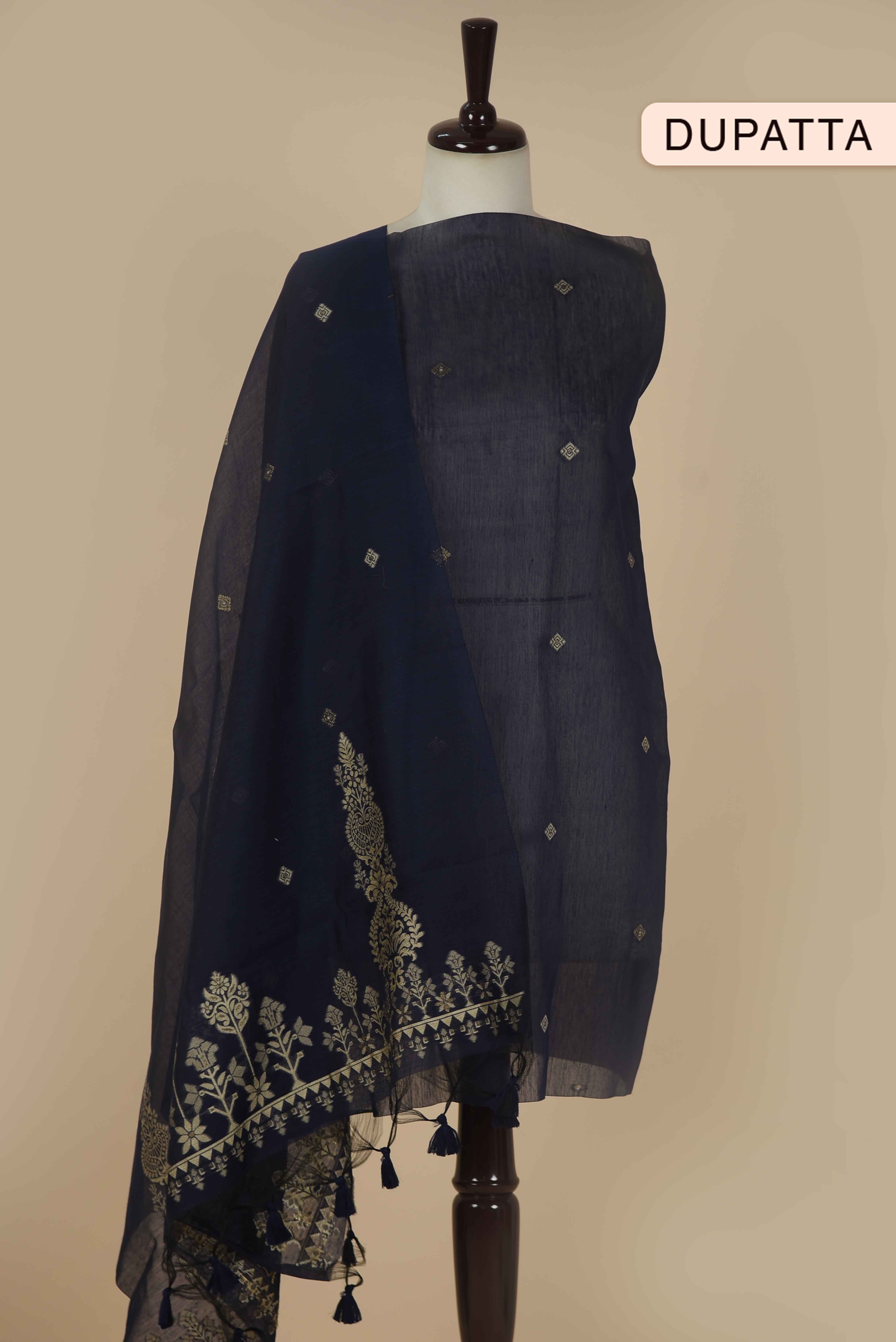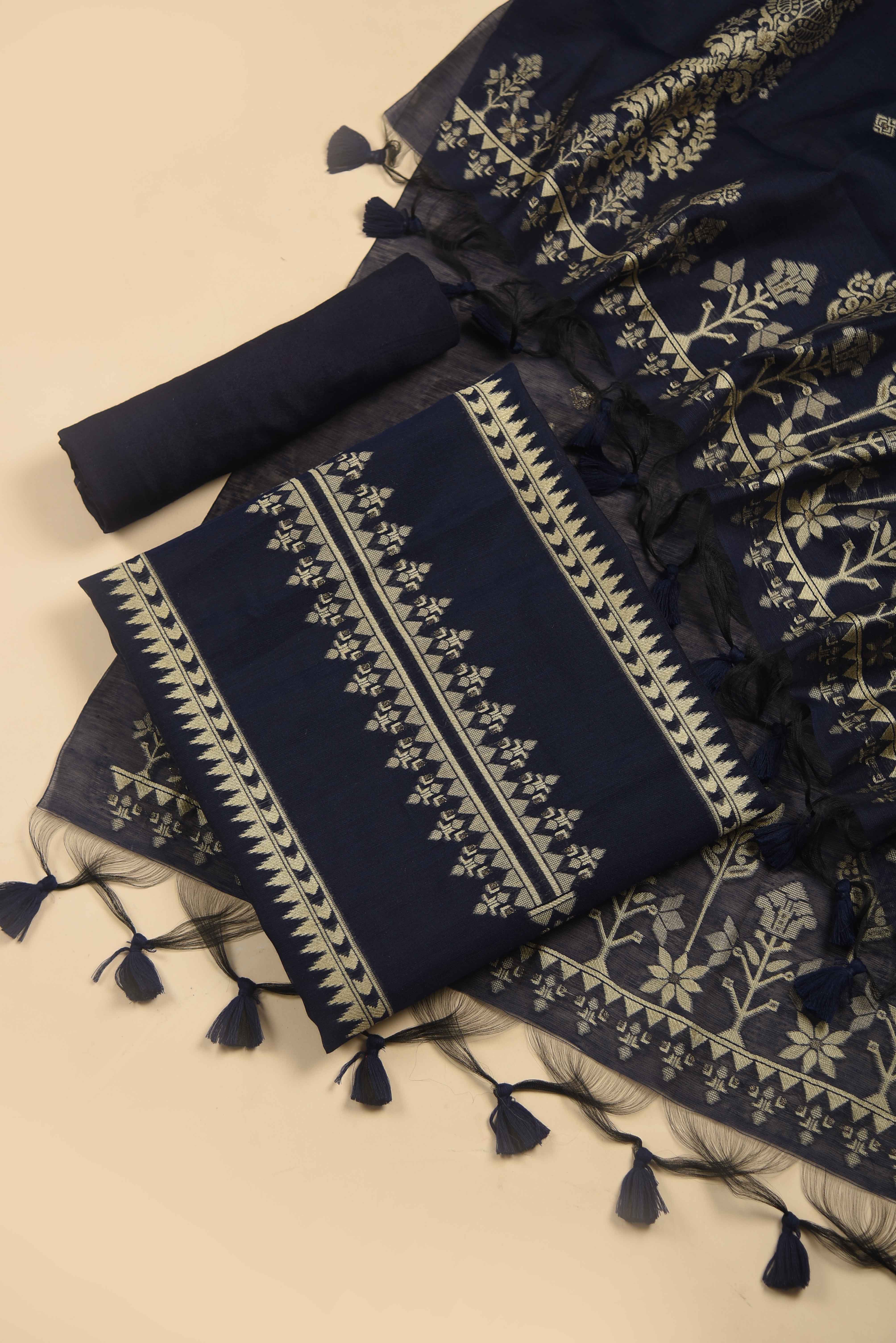 Blue Chanderi Silk Blend Jamdani Woven Unstitched Suit Fabric Set with Chanderi Woven Dupatta