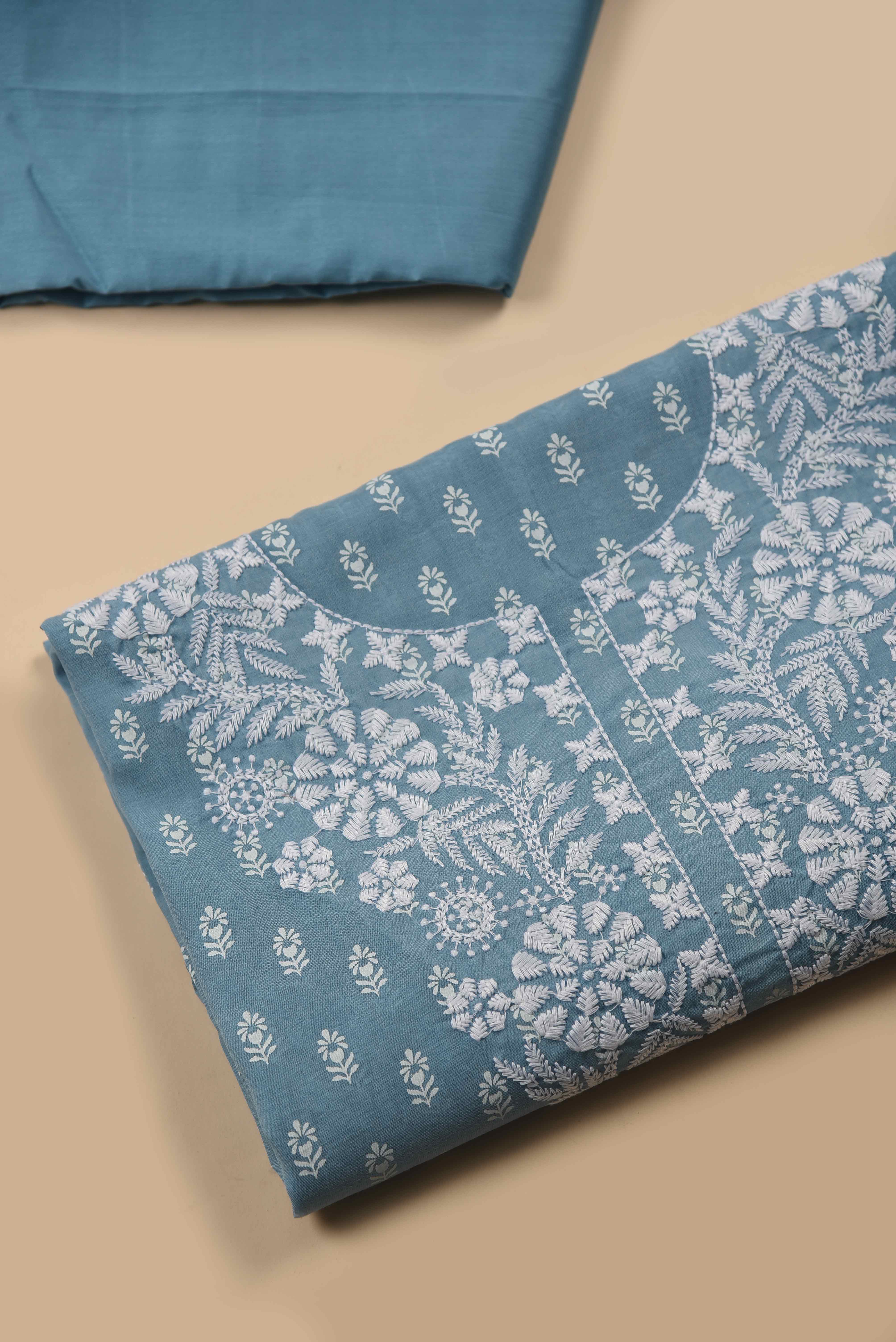 Blue Cotton Printed With Embroidered Unstitched Suit Fabric Set With Cotton Embroidered Dupatta