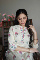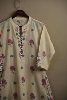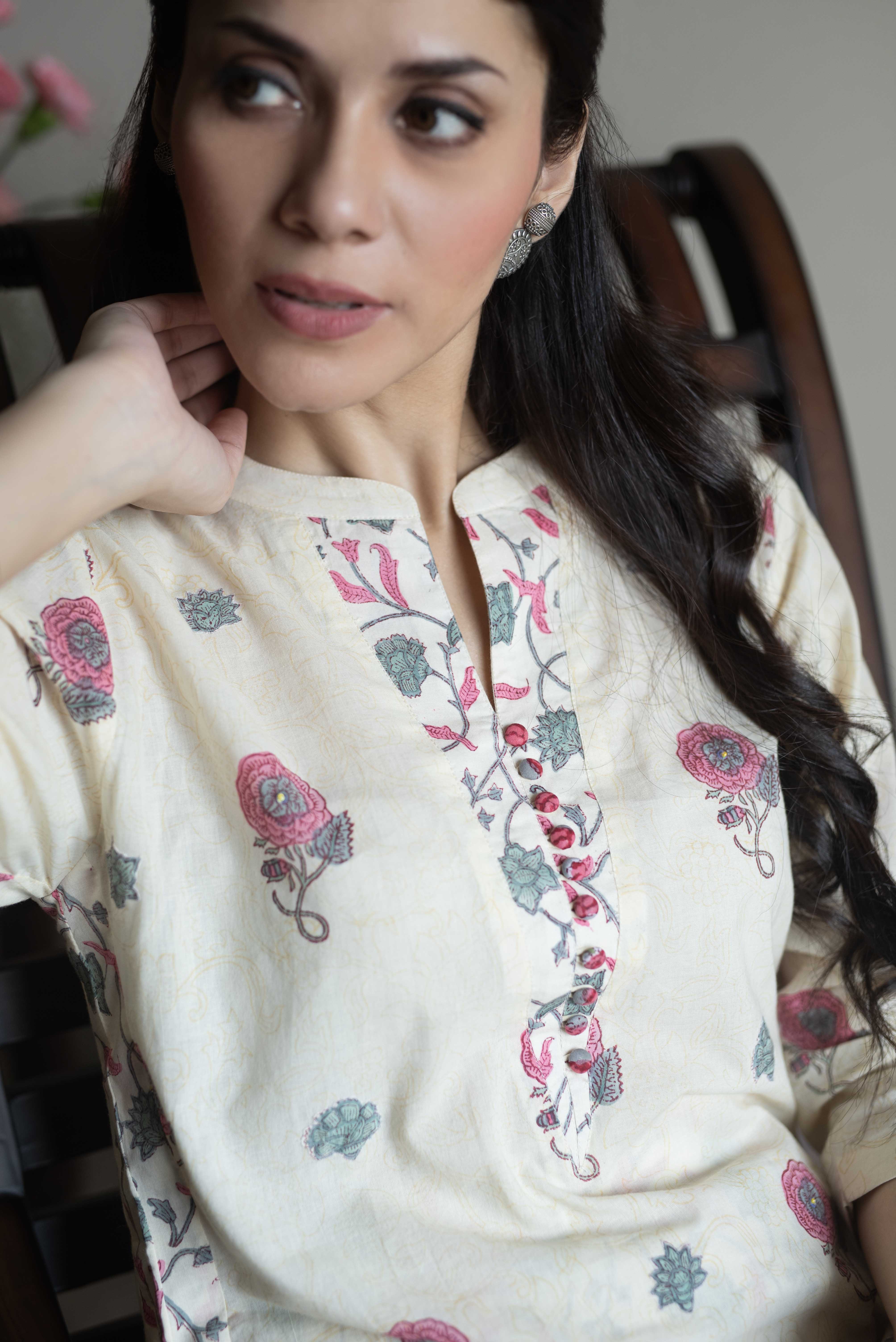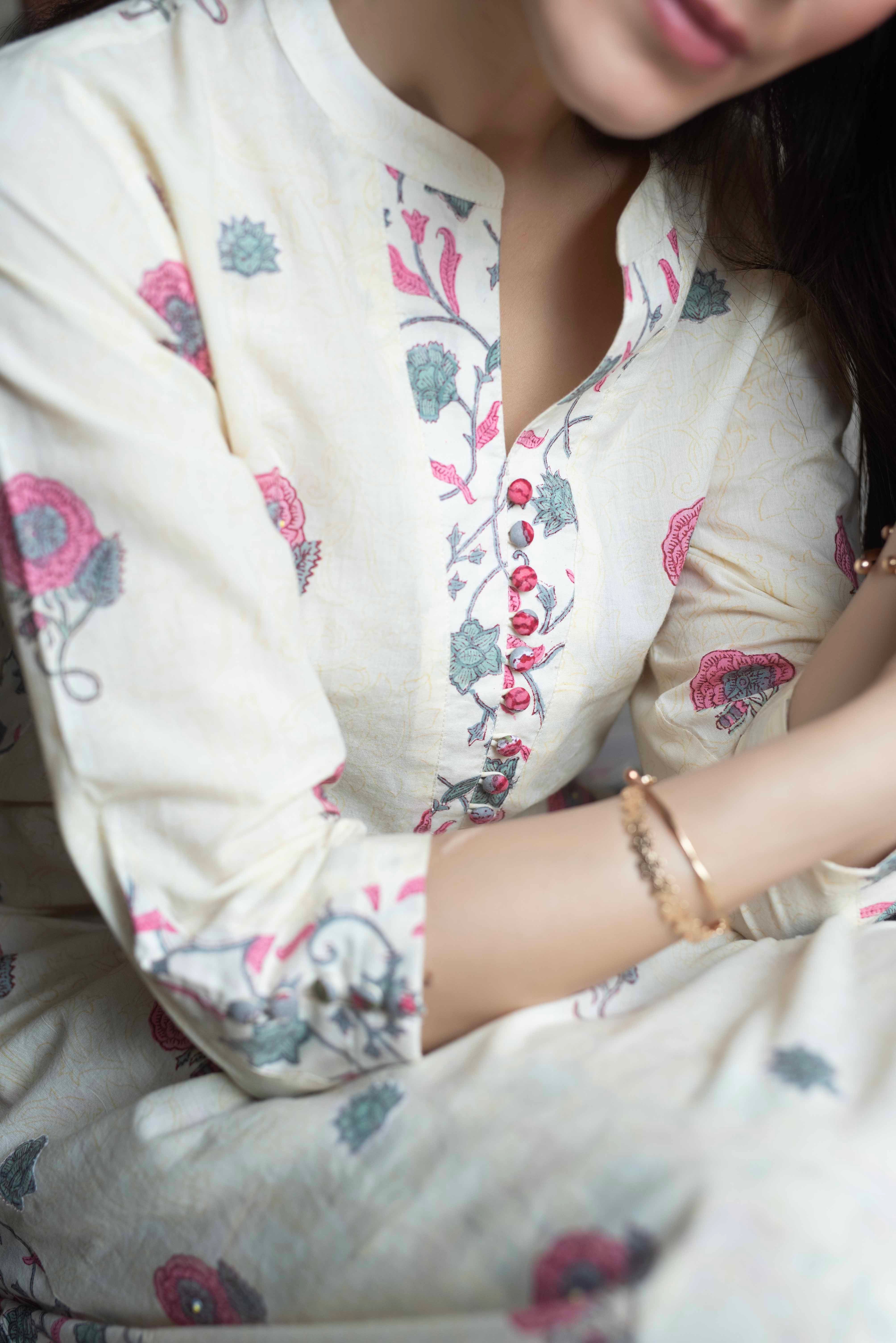 Cream Pure Cotton Hand Block Printed A-Line Kurta Set with Pant – Regular Fit Embrace effortless elegance with this Cream Pure Cotton A-Line Kurta Set, a perfect fusion of comfort and style.