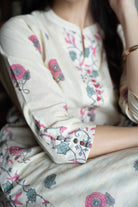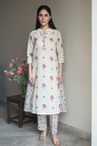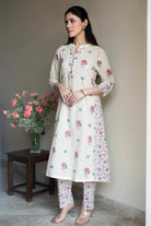 Cream Pure Cotton Hand Block Printed A-Line Kurta Set With Pant - Regular Fit