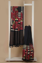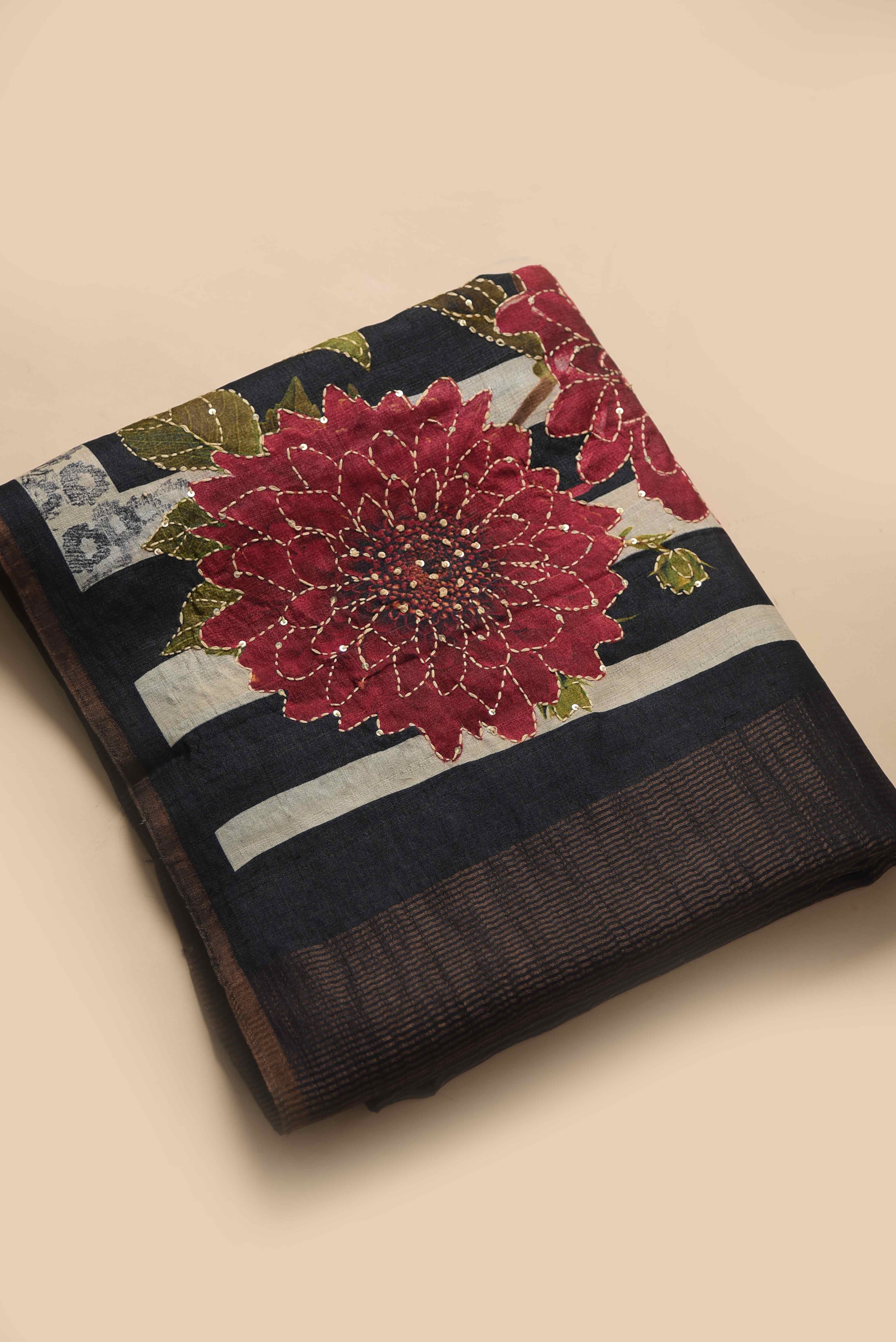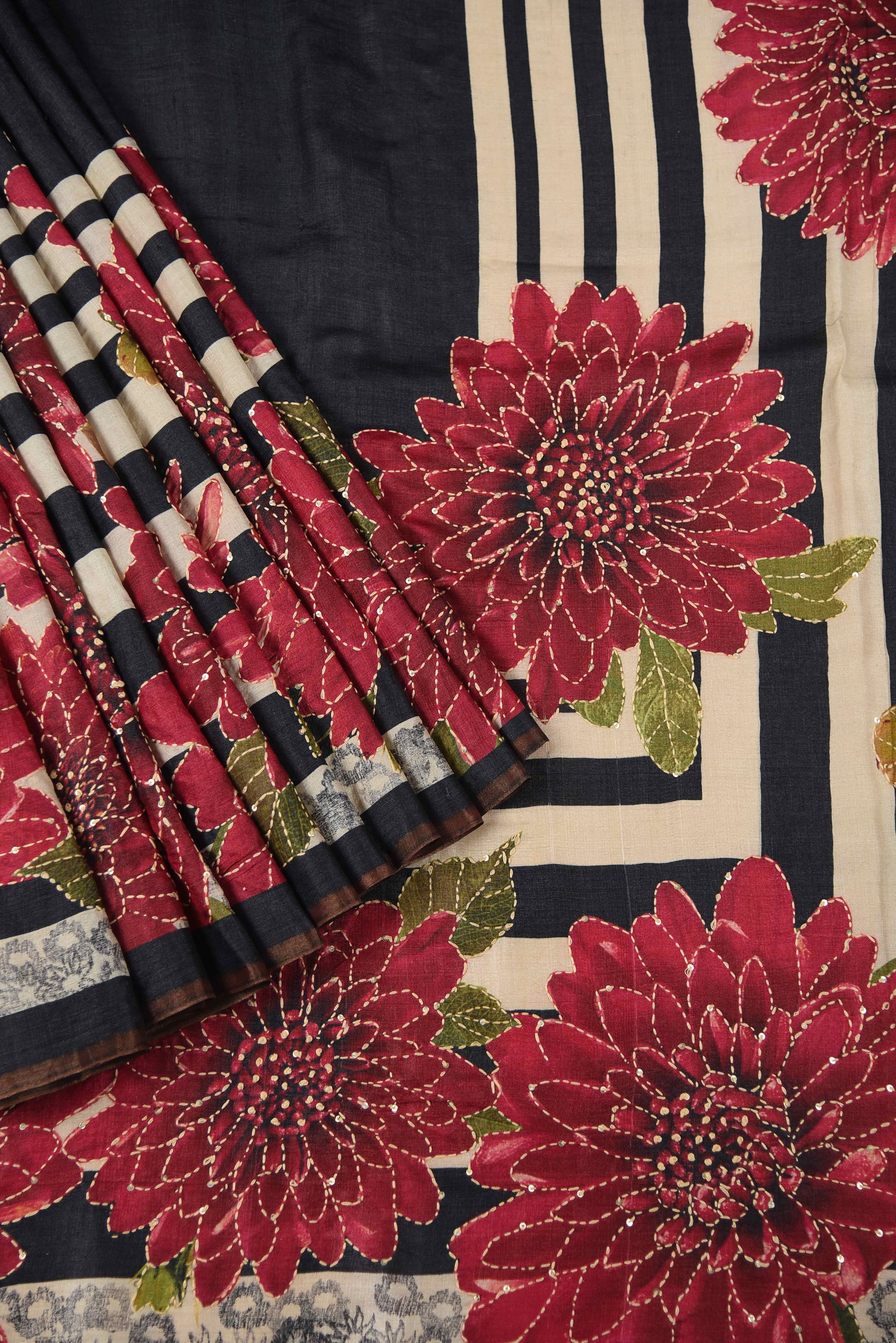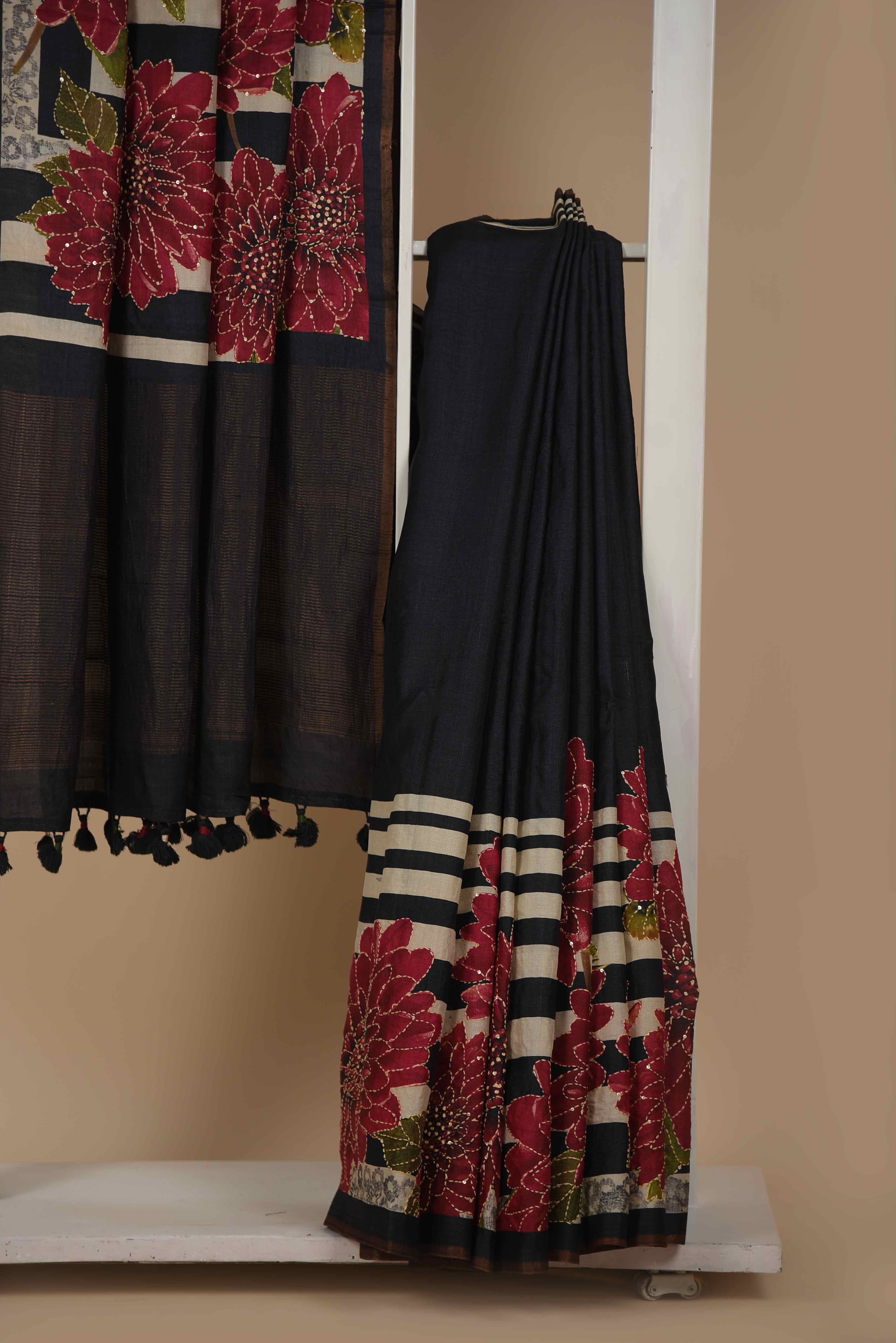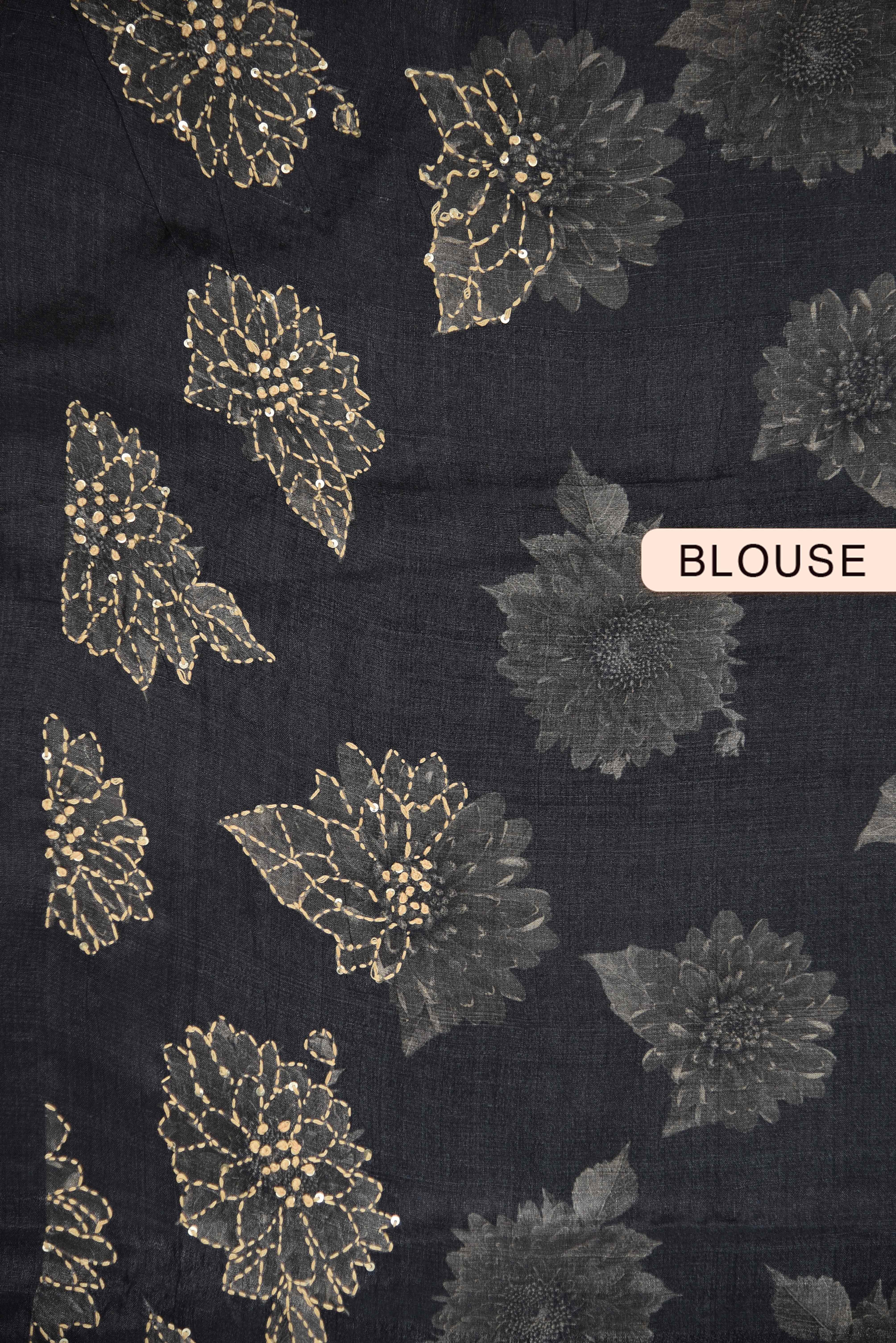 Black With Beige Blue Tussar Silk Printed With Embroidered Saree with Embroidered Tussar Silk Blouse
