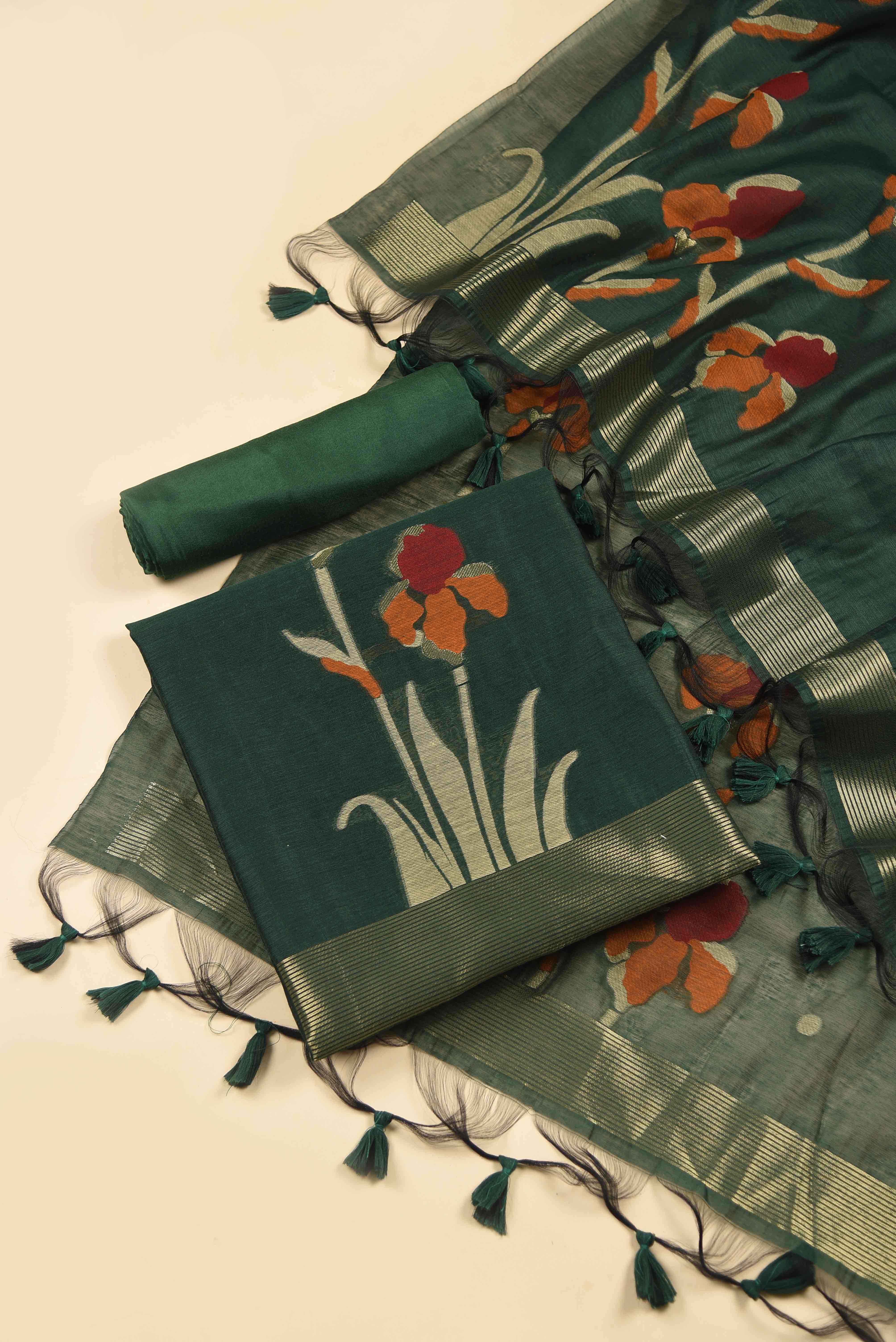 - This Green Chanderi Silk Blend Jamdani suit fabric set combines breathable, lightweight comfort with elegant design.