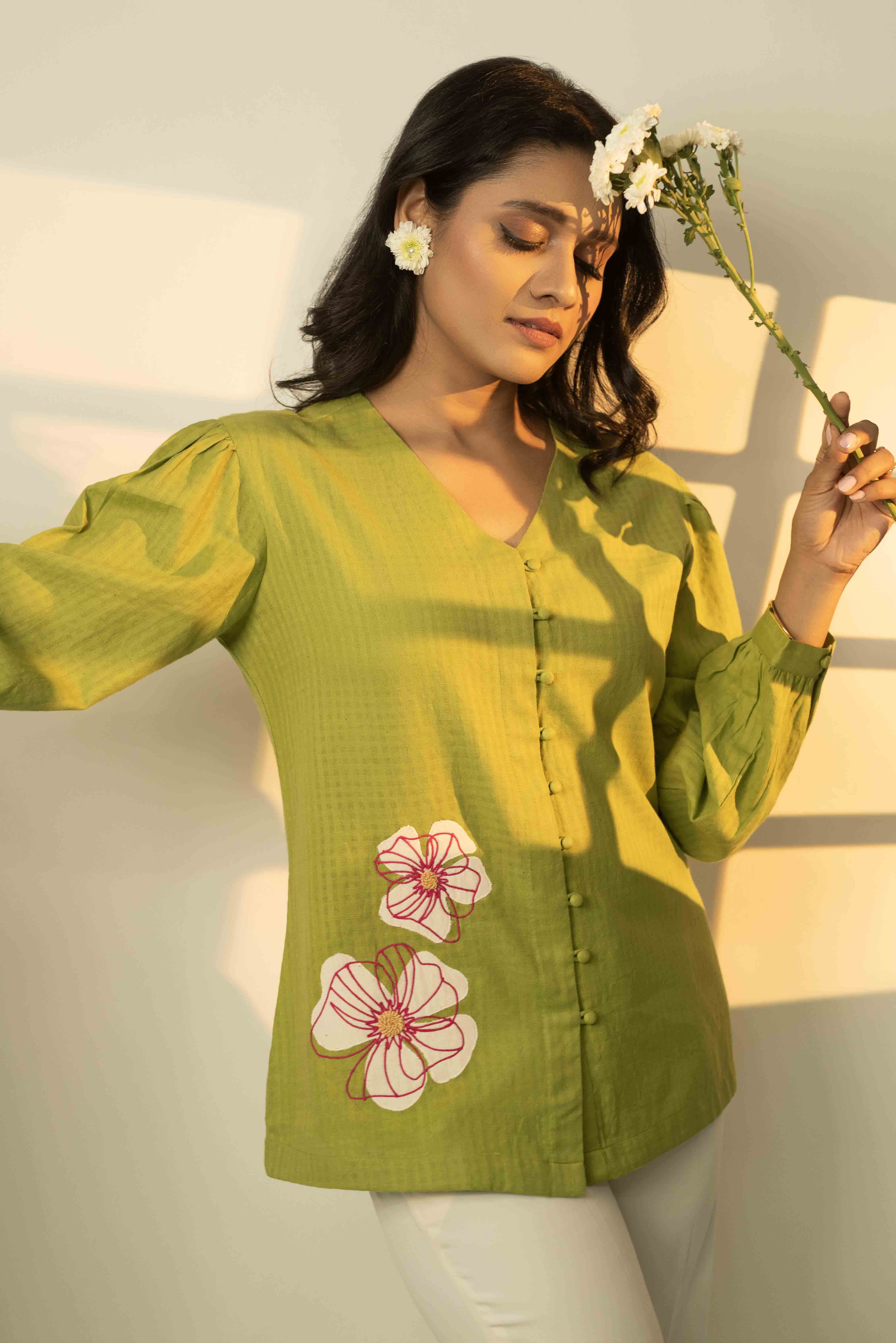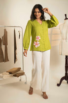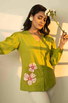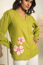 - Green Pure Handloom Cotton Self-Check Shirt with Patchwork & Dori – Relaxed Fit, Collection: ROCK PAPER SCISSORS, A unique blend of tradition and trend, this Green Self-Check Shirt is crafted from pure handloom cotton for breathable comfort and everyday ease.
