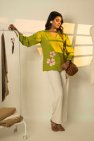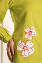 Green Pure Handloom Cotton Self-Check Shirt with Patchwork & Dori – Relaxed Fit