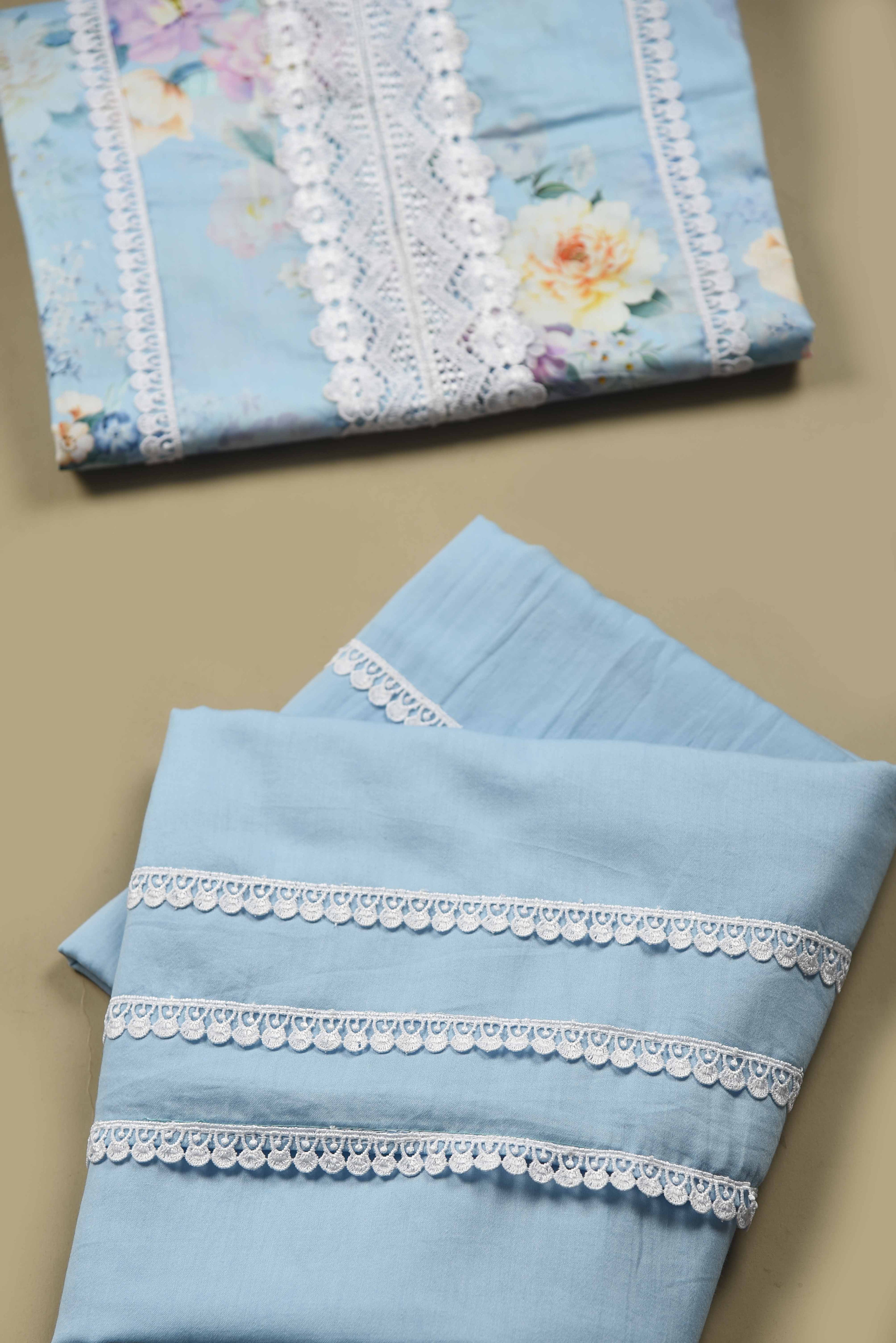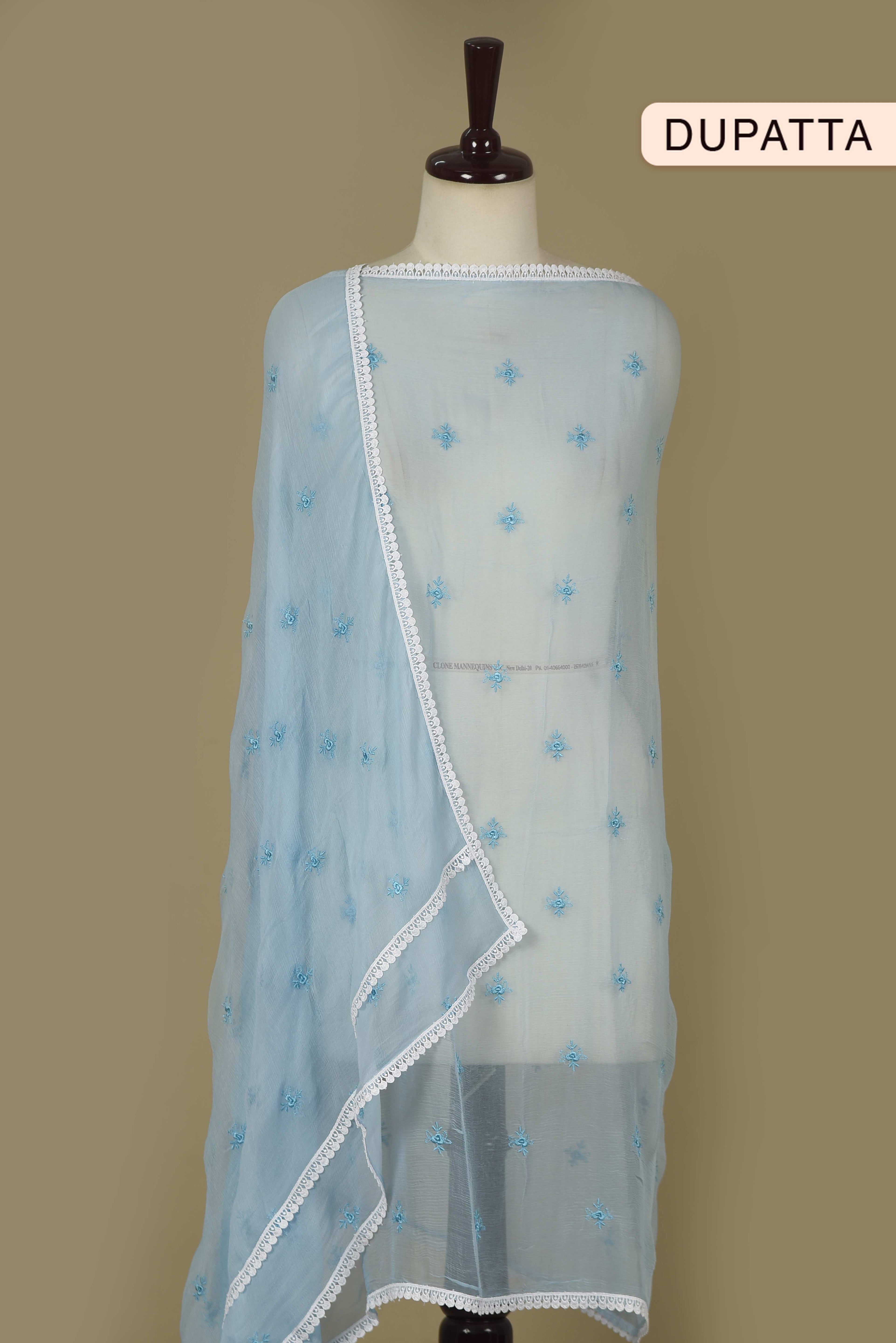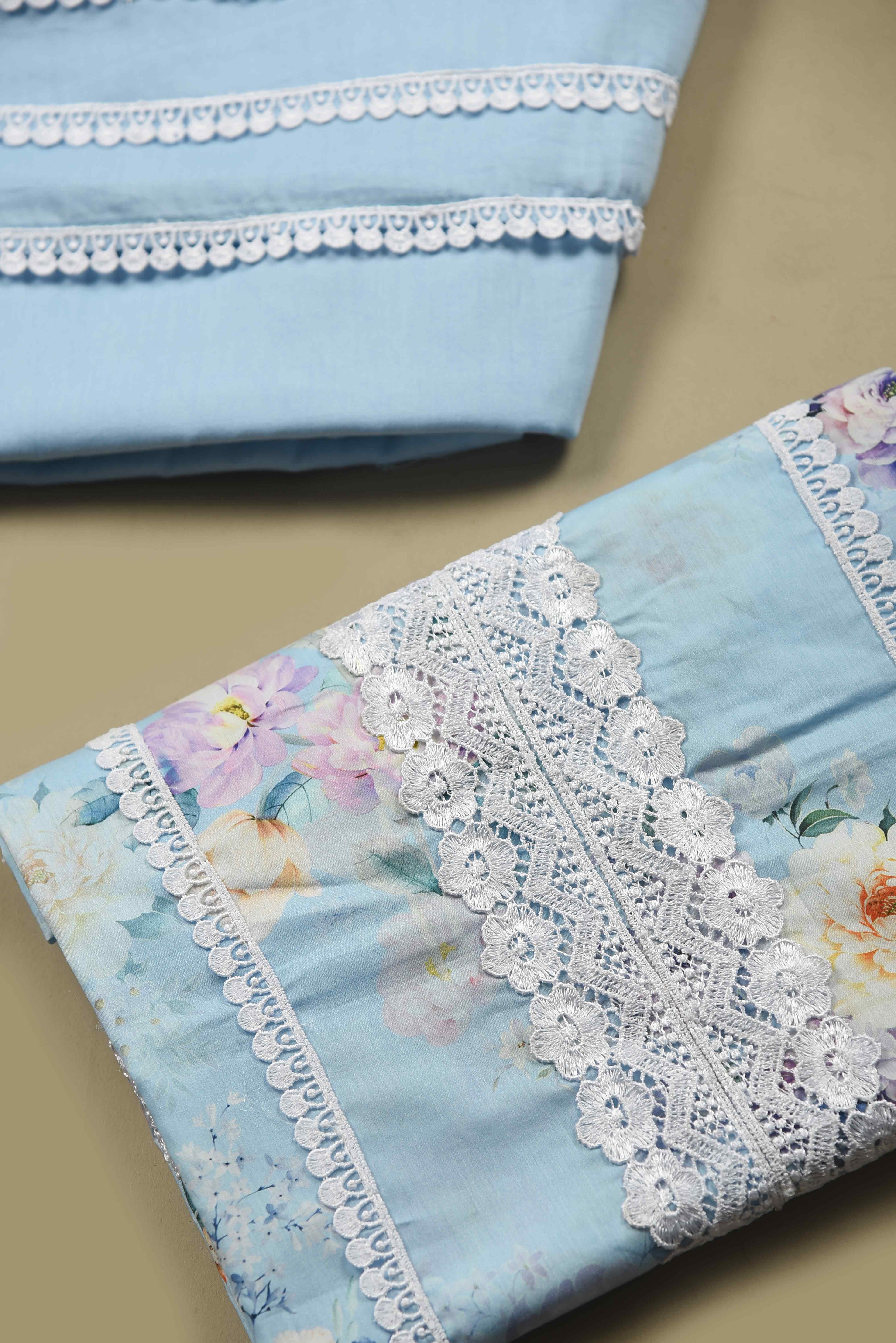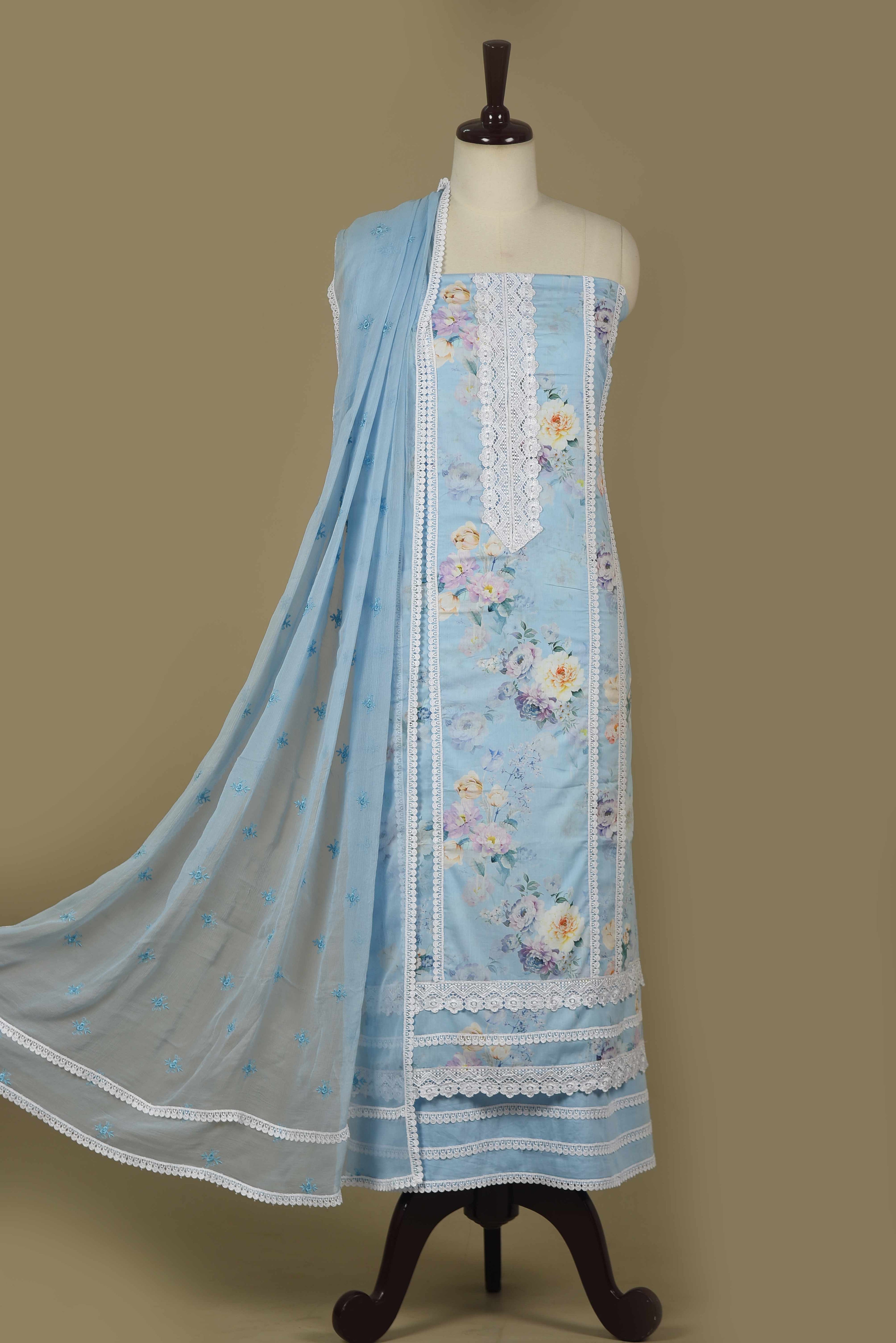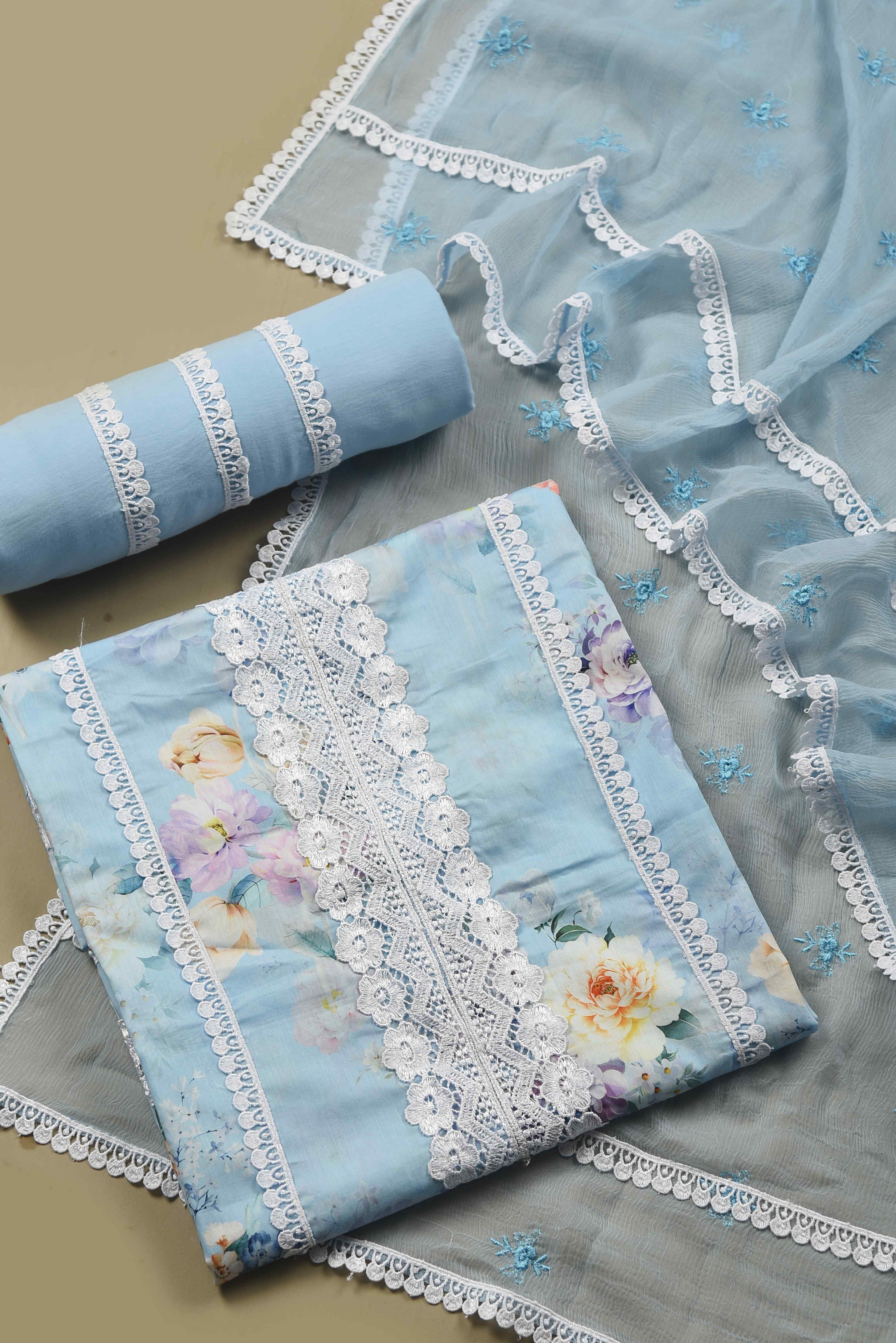 Light Blue Pure Cotton Printed & Embroidered Unstitched Suit Fabric Set with Chiffon Embroidered Dupatta.