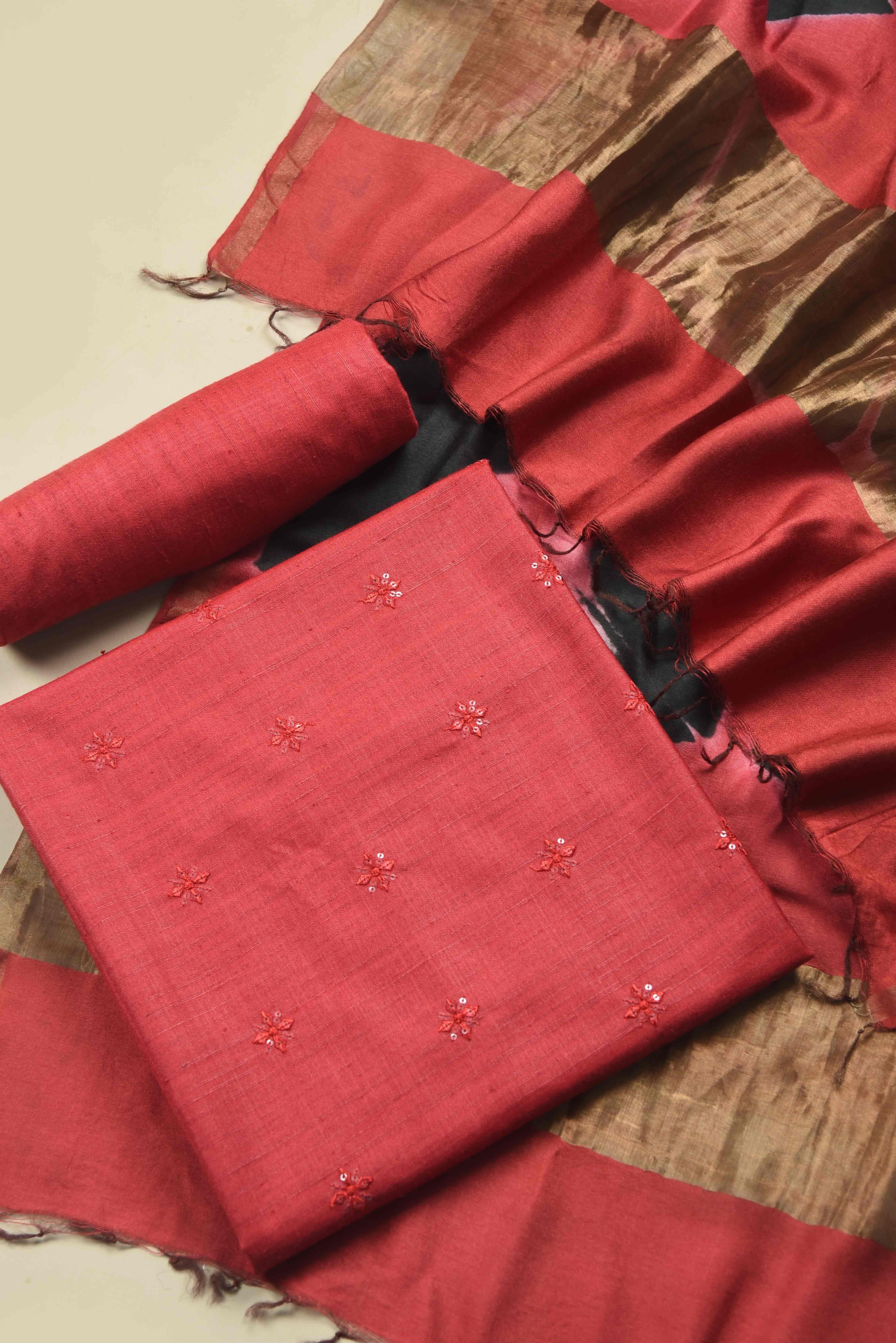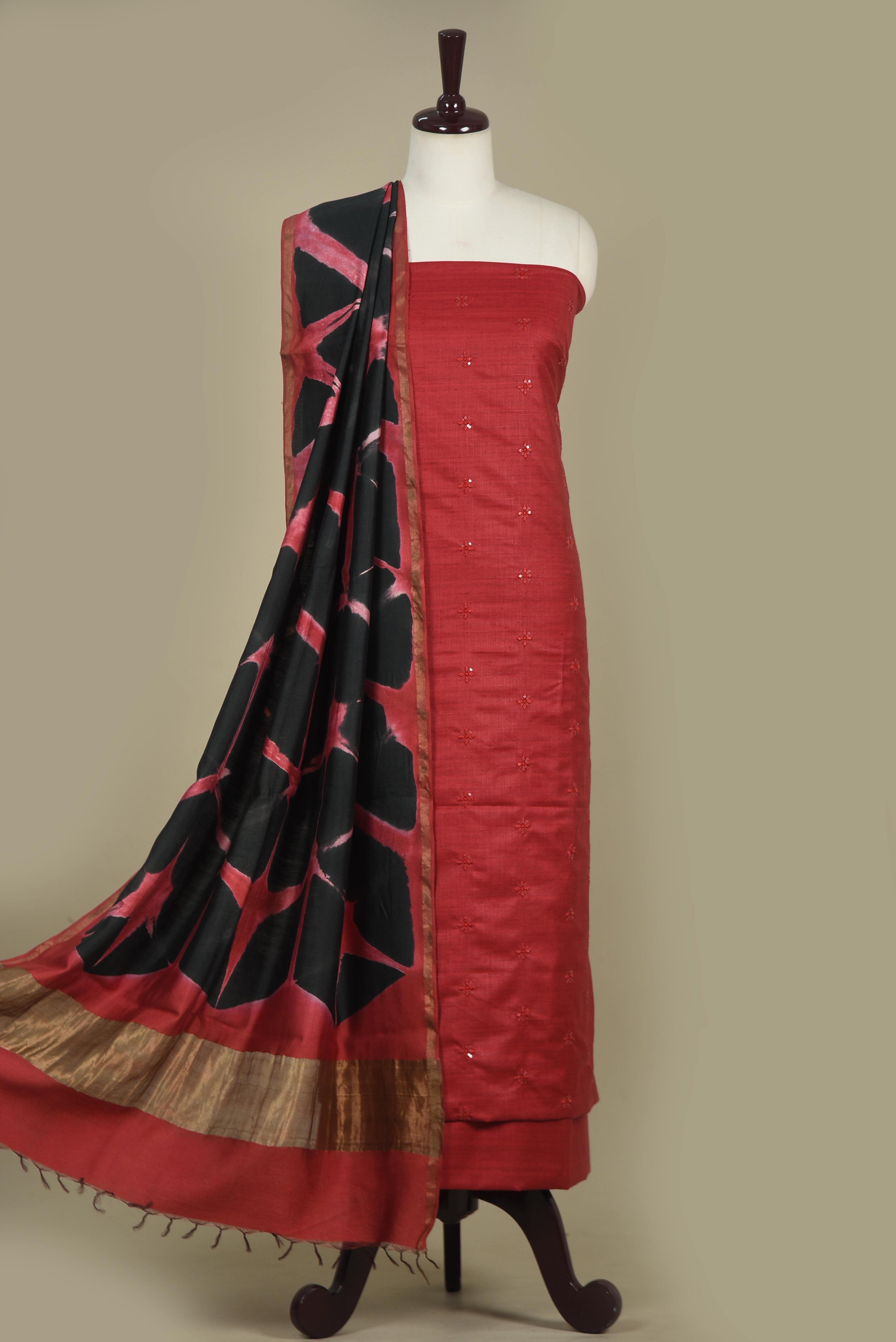 Maroon Cotton Raw Silk Blend Embroidered Unstitched Suit Fabric Set With Muslin Tie and Dyed Dupatta