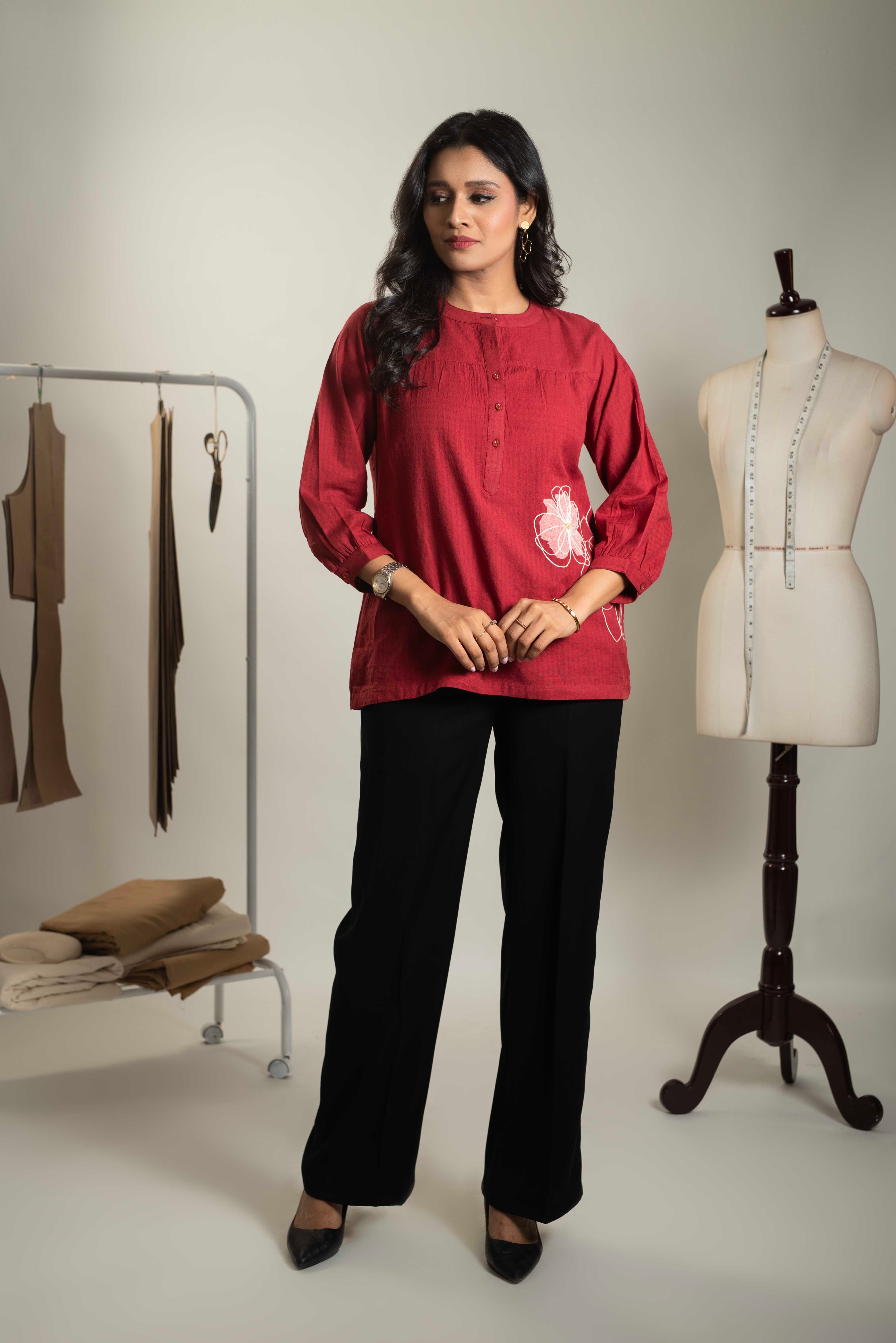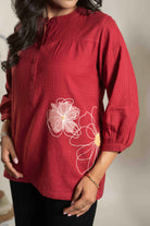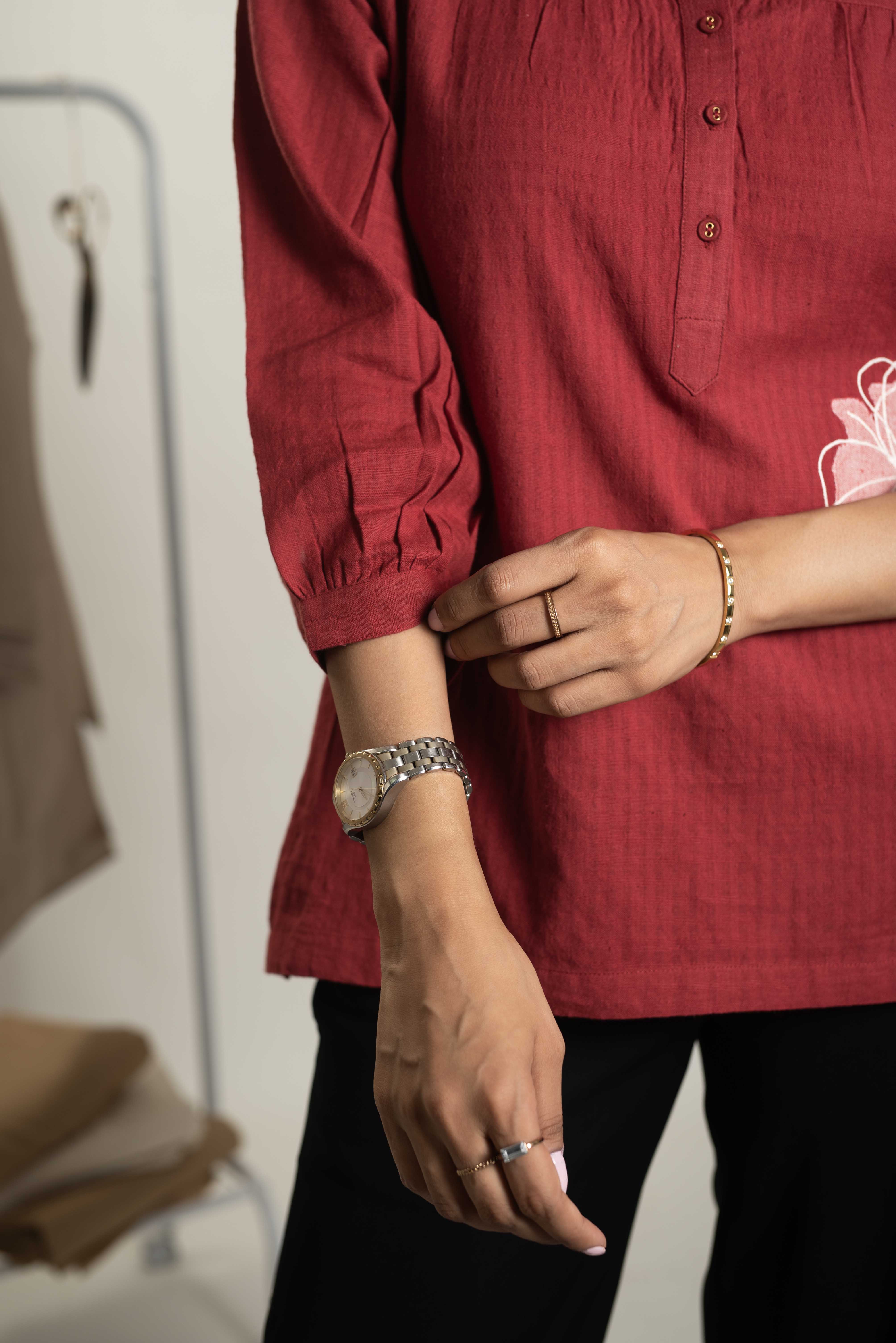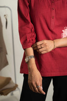 - Maroon Pure Handloom Cotton Short Kurti with Patchwork & Dori – Relaxed Fit, Collection: ROCK PAPER SCISSORS, Crafted from pure handloom cotton self-check fabric, this Maroon Short Kurti combines breathable comfort with artisanal charm.