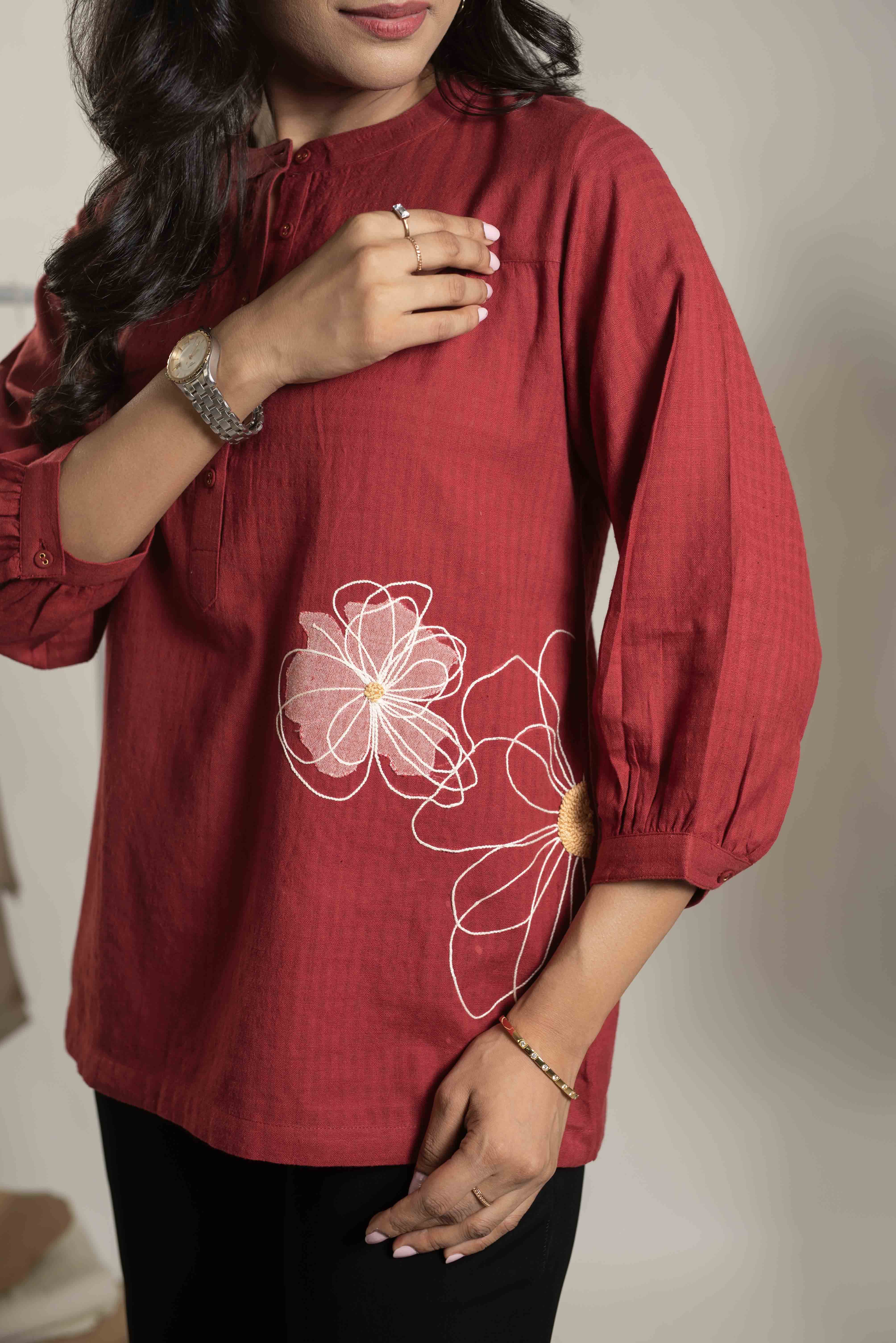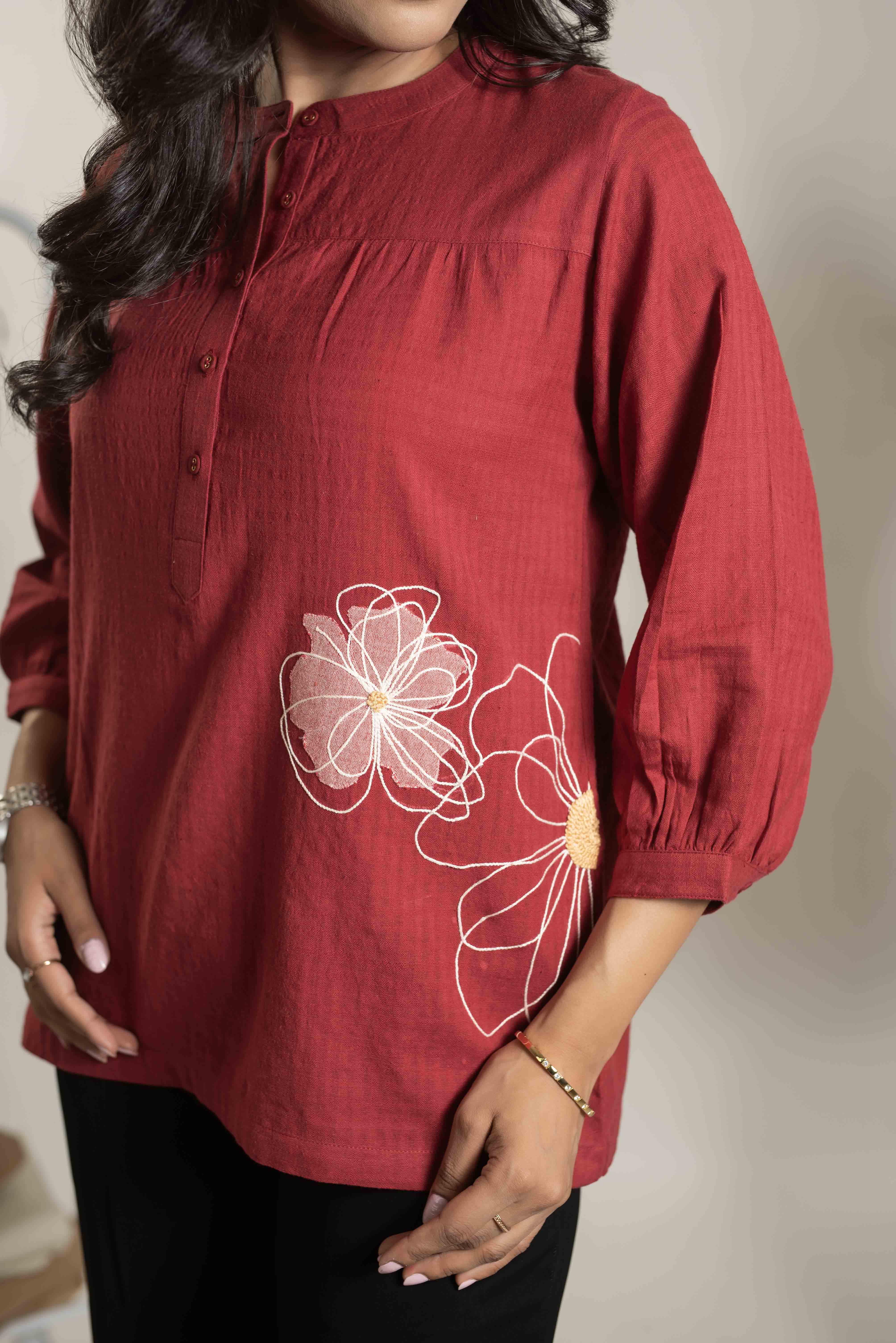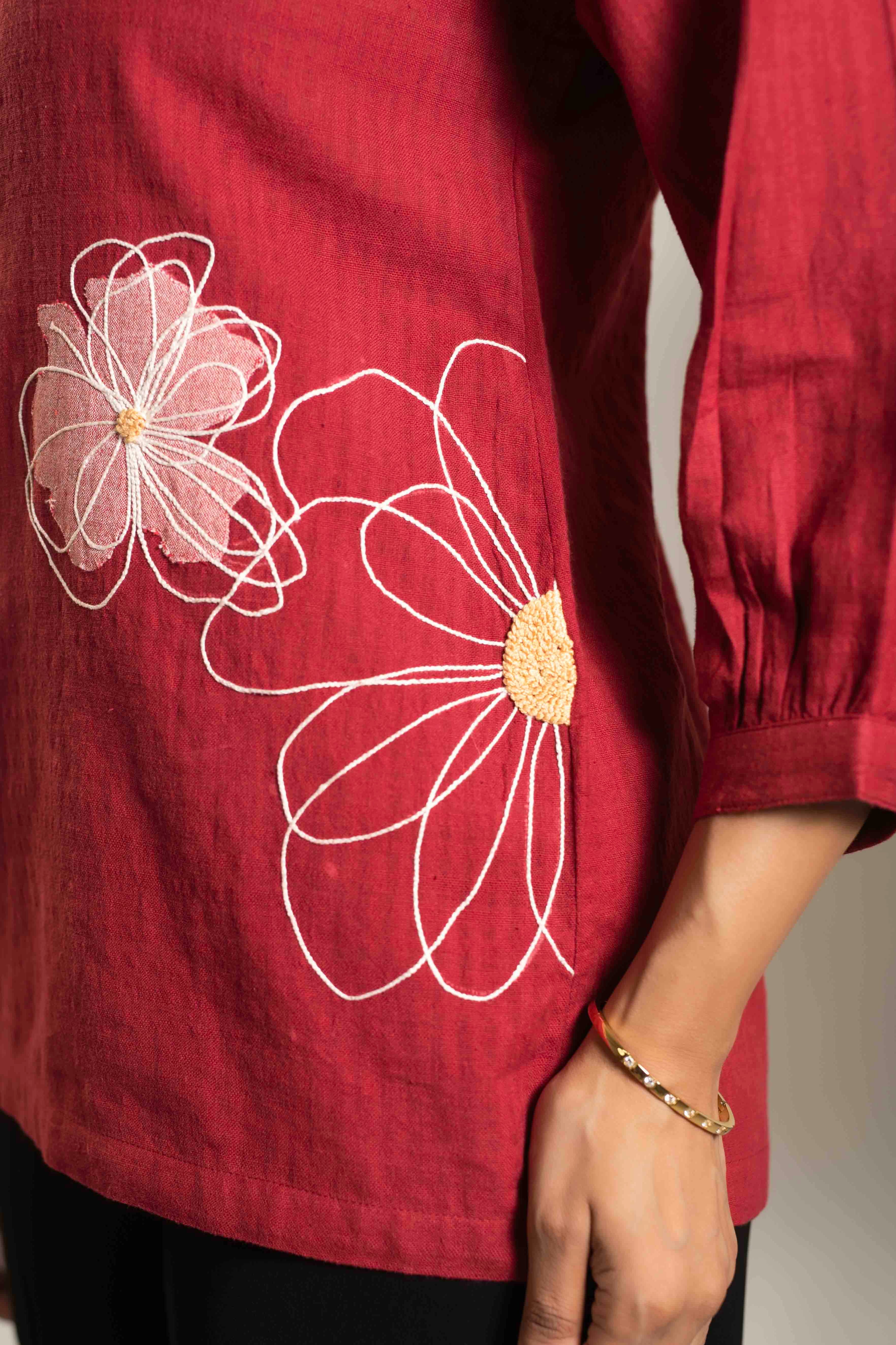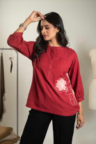 Maroon Pure Handloom Cotton Short Kurti with Patchwork & Dori – Relaxed Fit