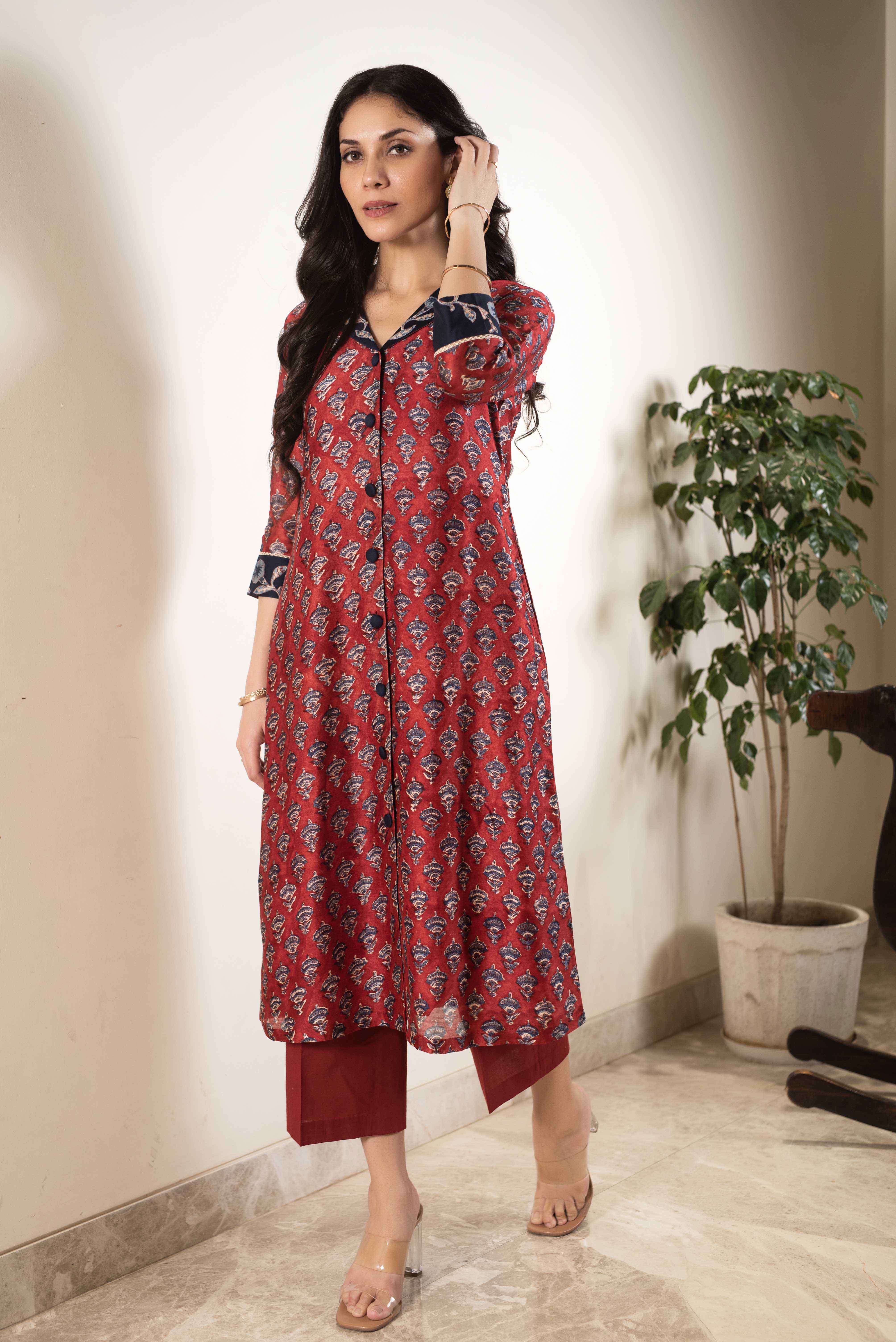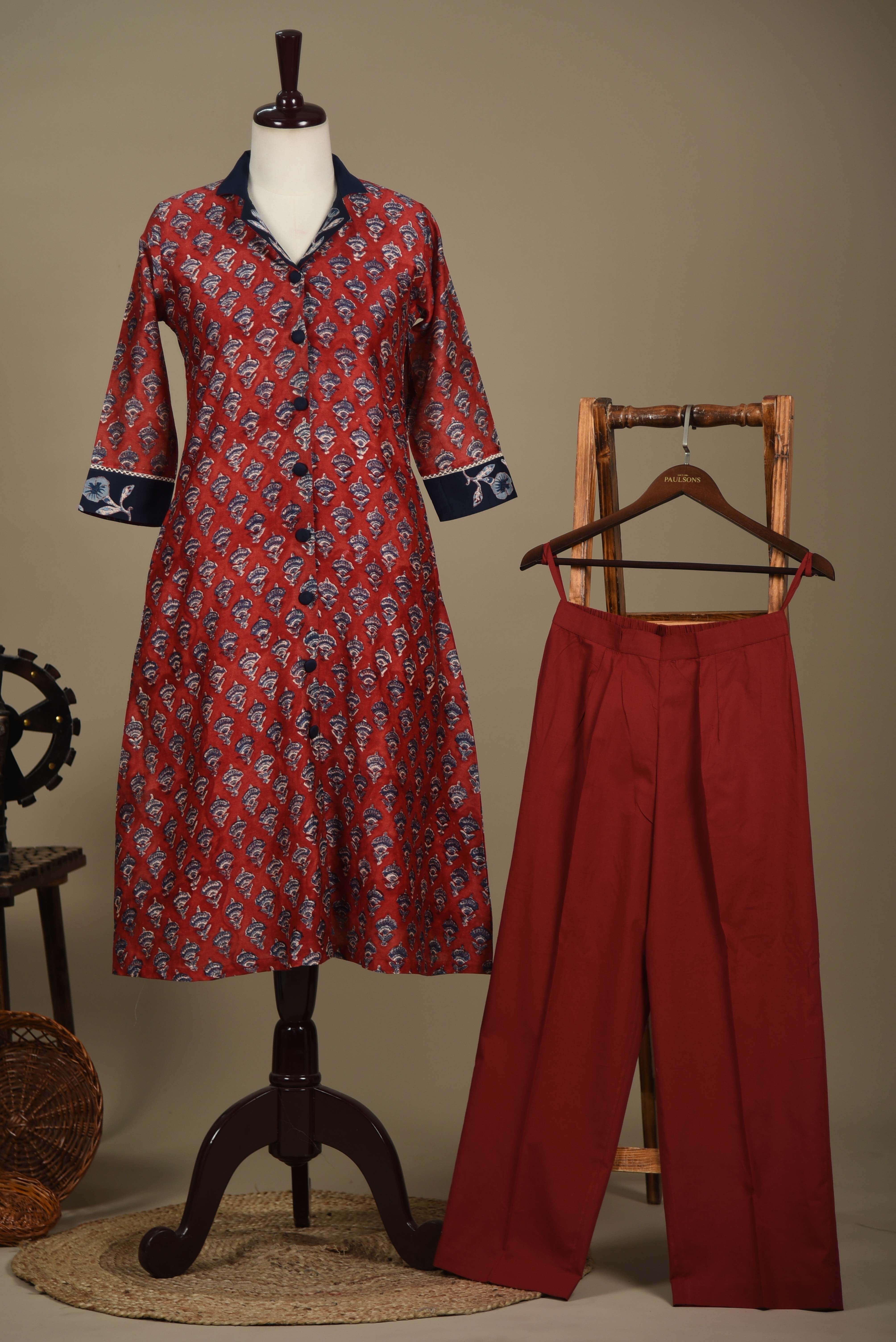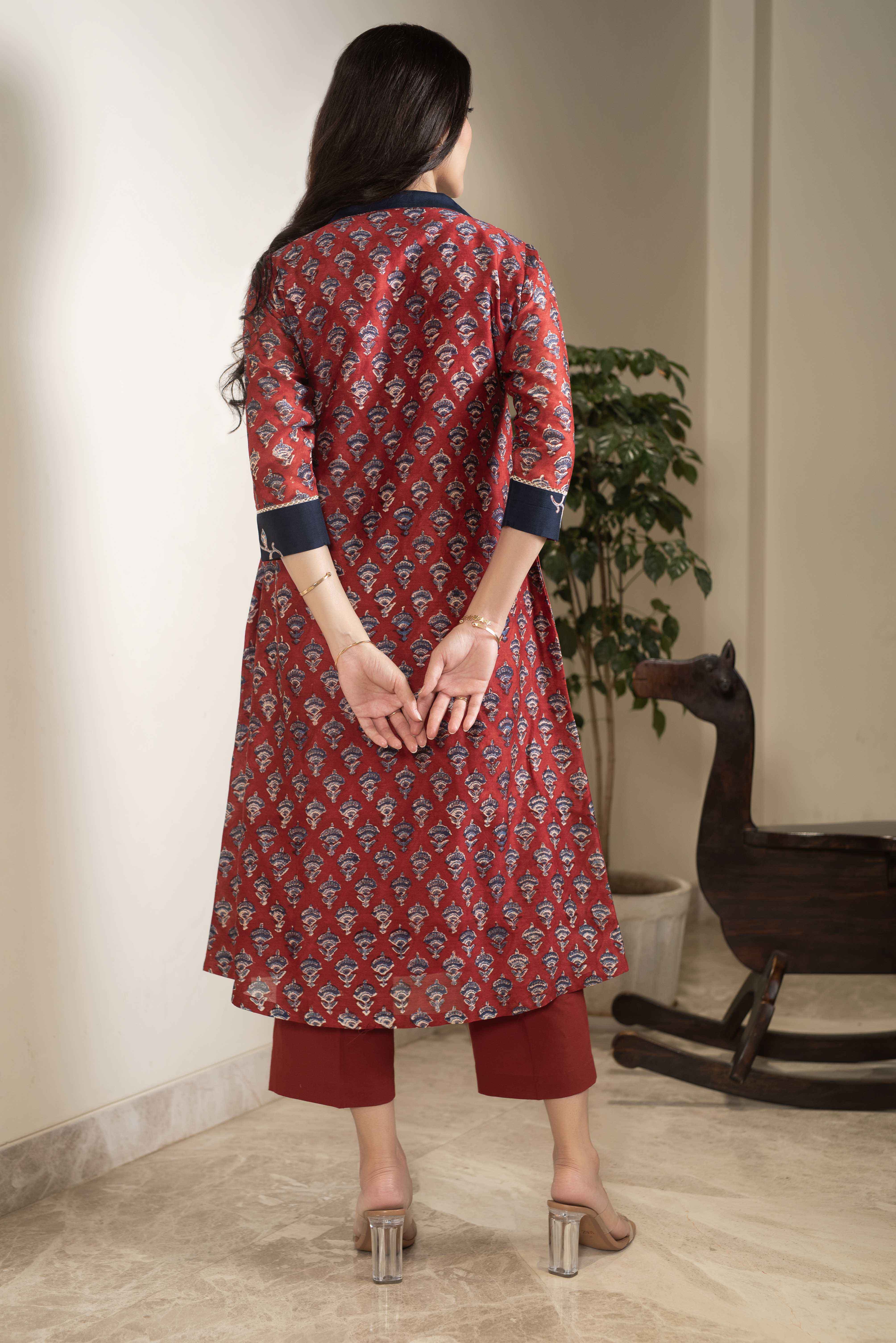 - Maroon with Blue Chanderi A-Line Hand Block Printed Kurta Set with Embroidery & Culottes – Regular Fit Step into timeless elegance with this Maroon with Blue Chanderi A-Line Kurta Set, beautifully adorned with hand block prints and intricate embroidery that bring tradition to life with a modern twist.