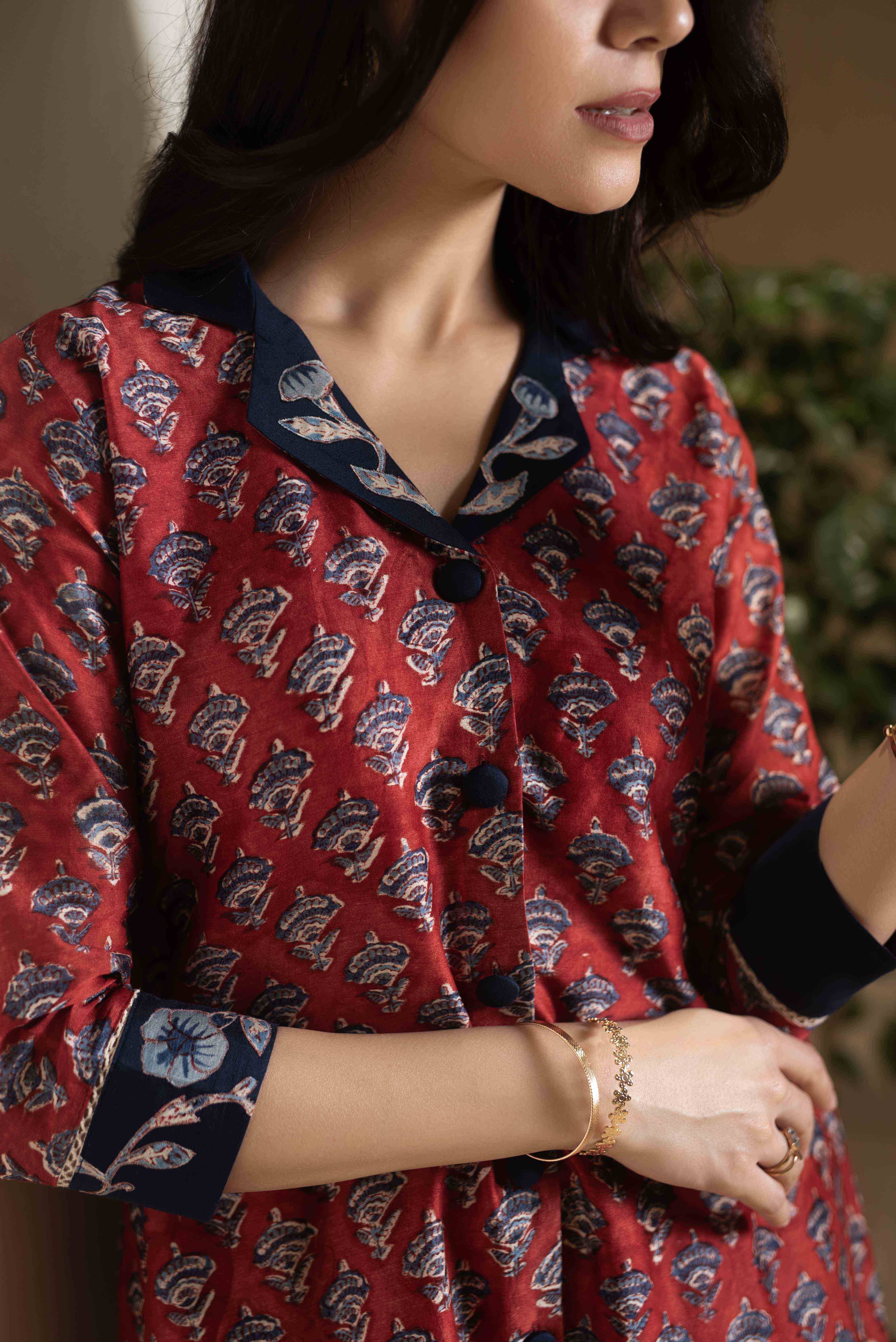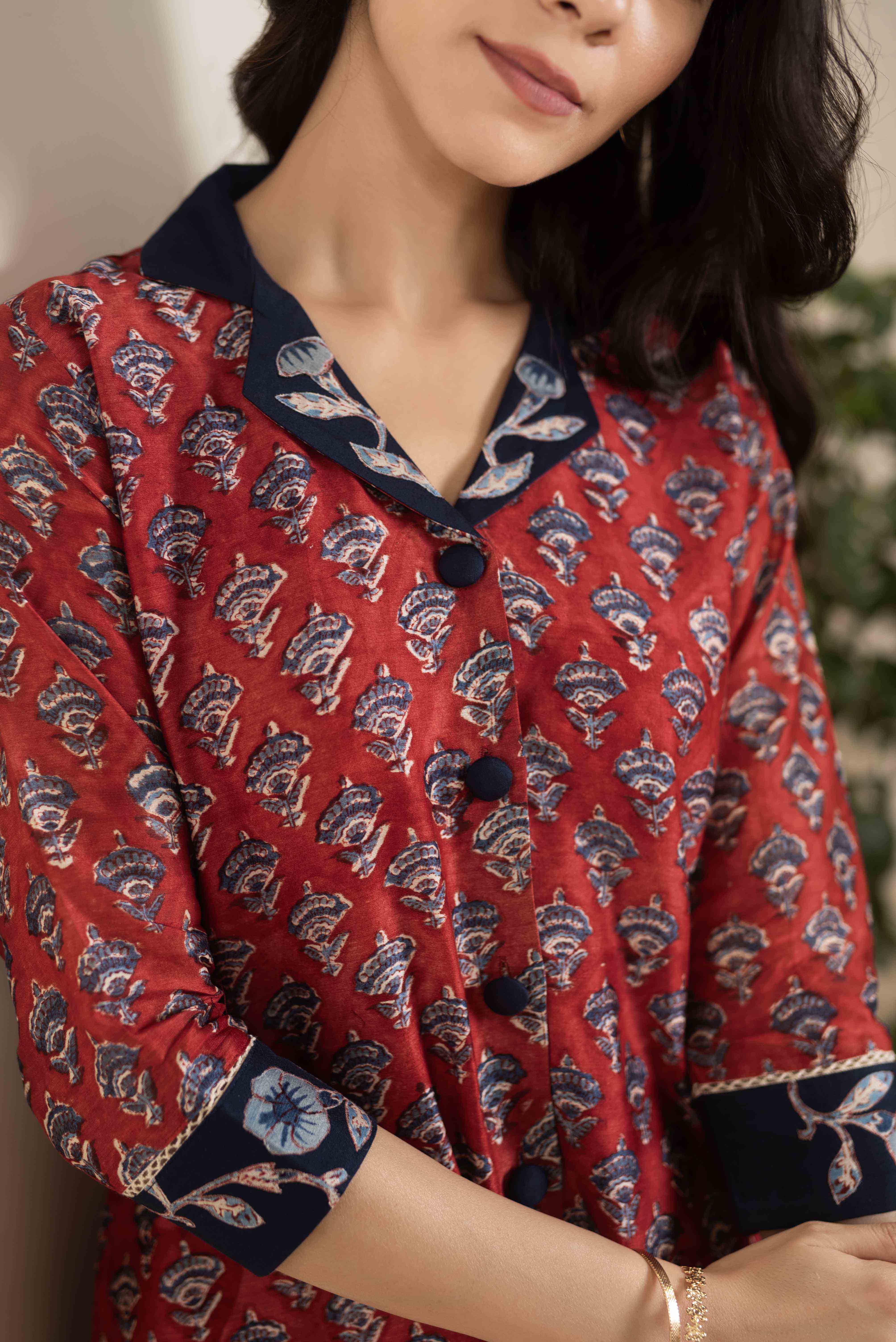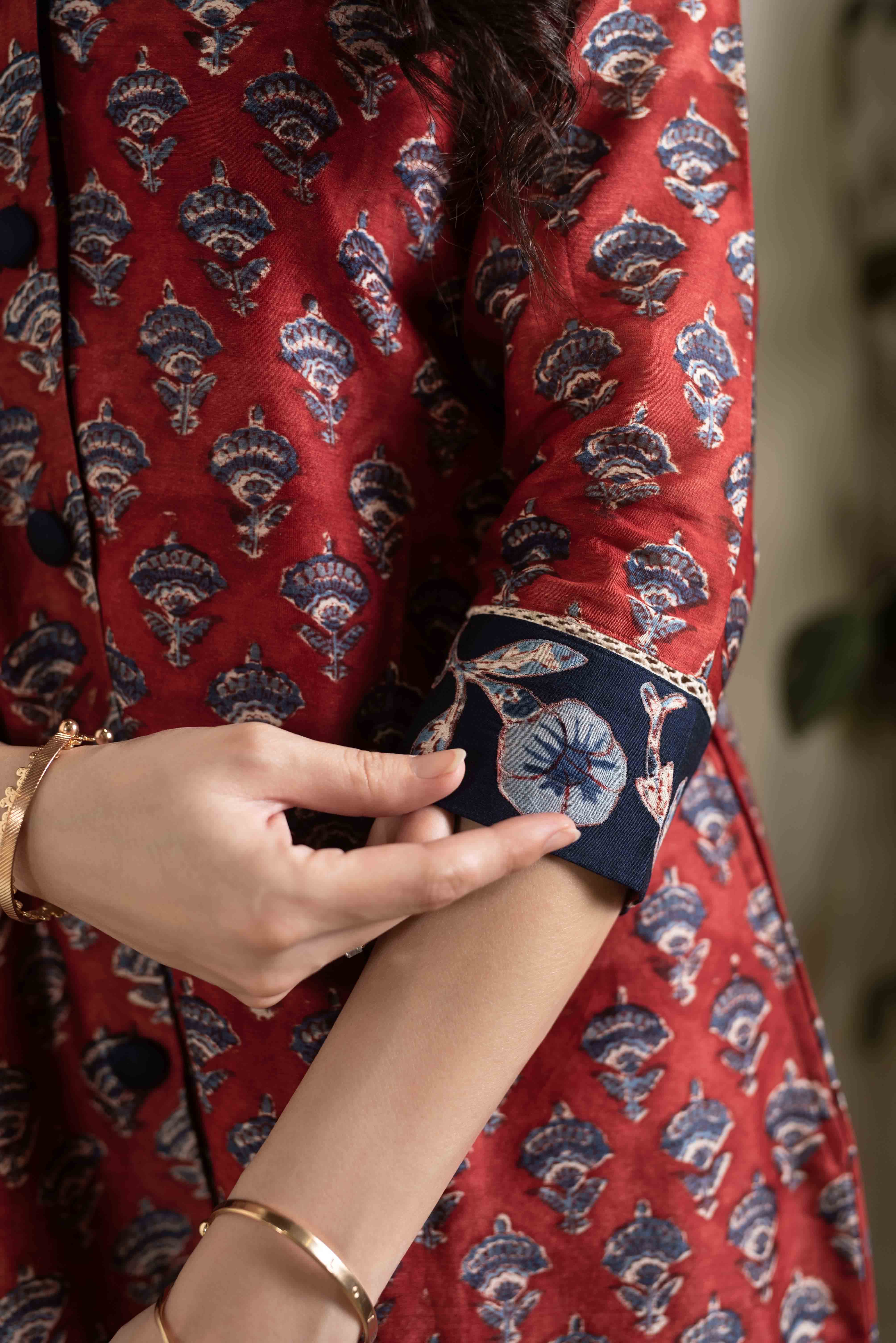 - Maroon with Blue Chanderi A-Line Hand Block Printed Kurta Set with Embroidery & Culottes – Regular Fit Step into timeless elegance with this Maroon with Blue Chanderi A-Line Kurta Set, beautifully adorned with hand block prints and intricate embroidery that bring tradition to life with a modern twist.