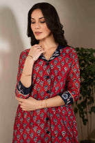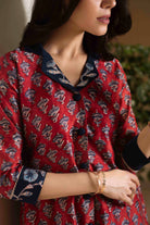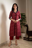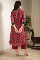 Maroon With Blue Chanderi A-Line Hand Block Printed With Embroidery Kurta Set With Cullottes- Regular Fit