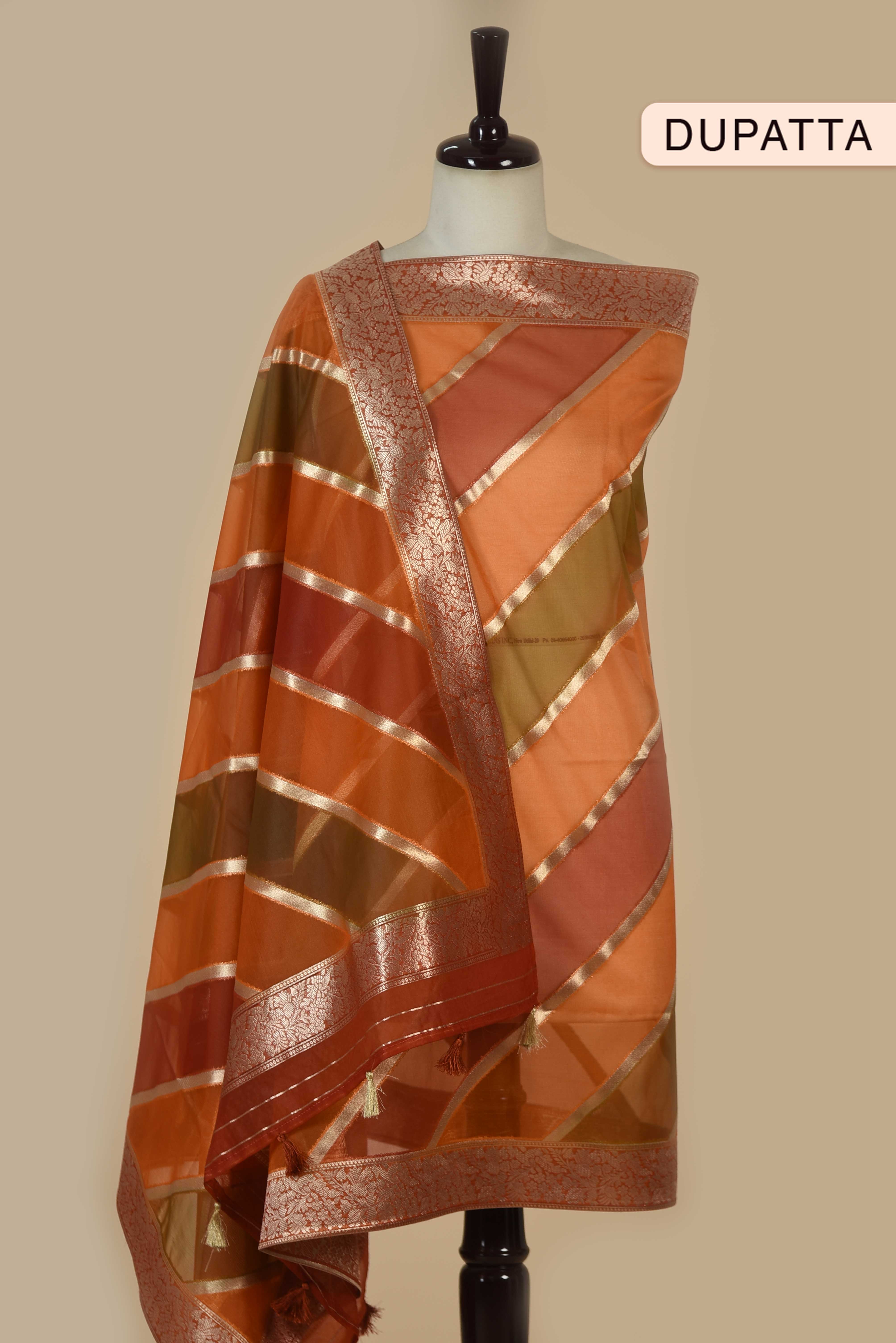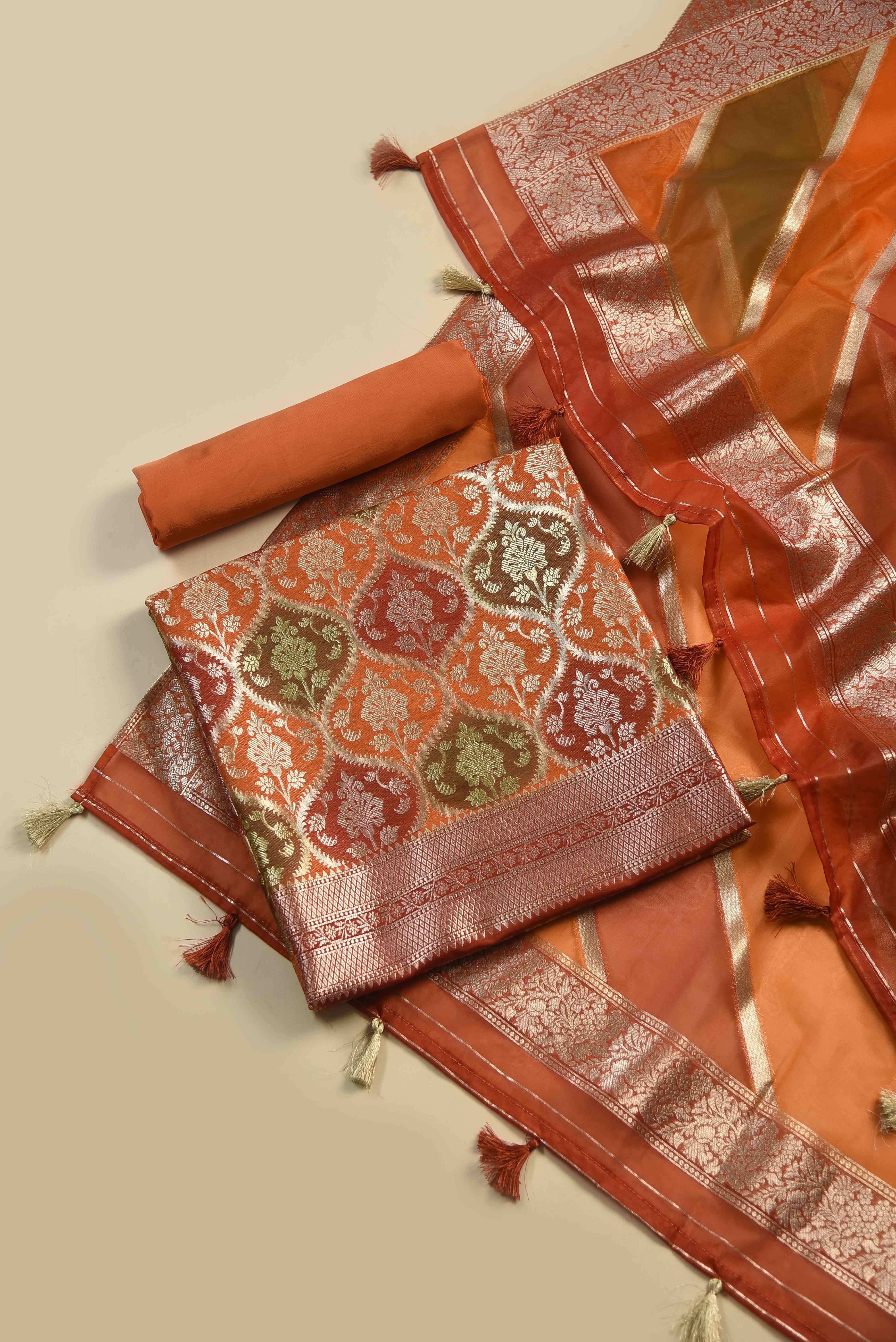 Orange Silk Multicolor Banarasi Woven Unstitched Suit Fabric Set With Organza Woven Dupatta