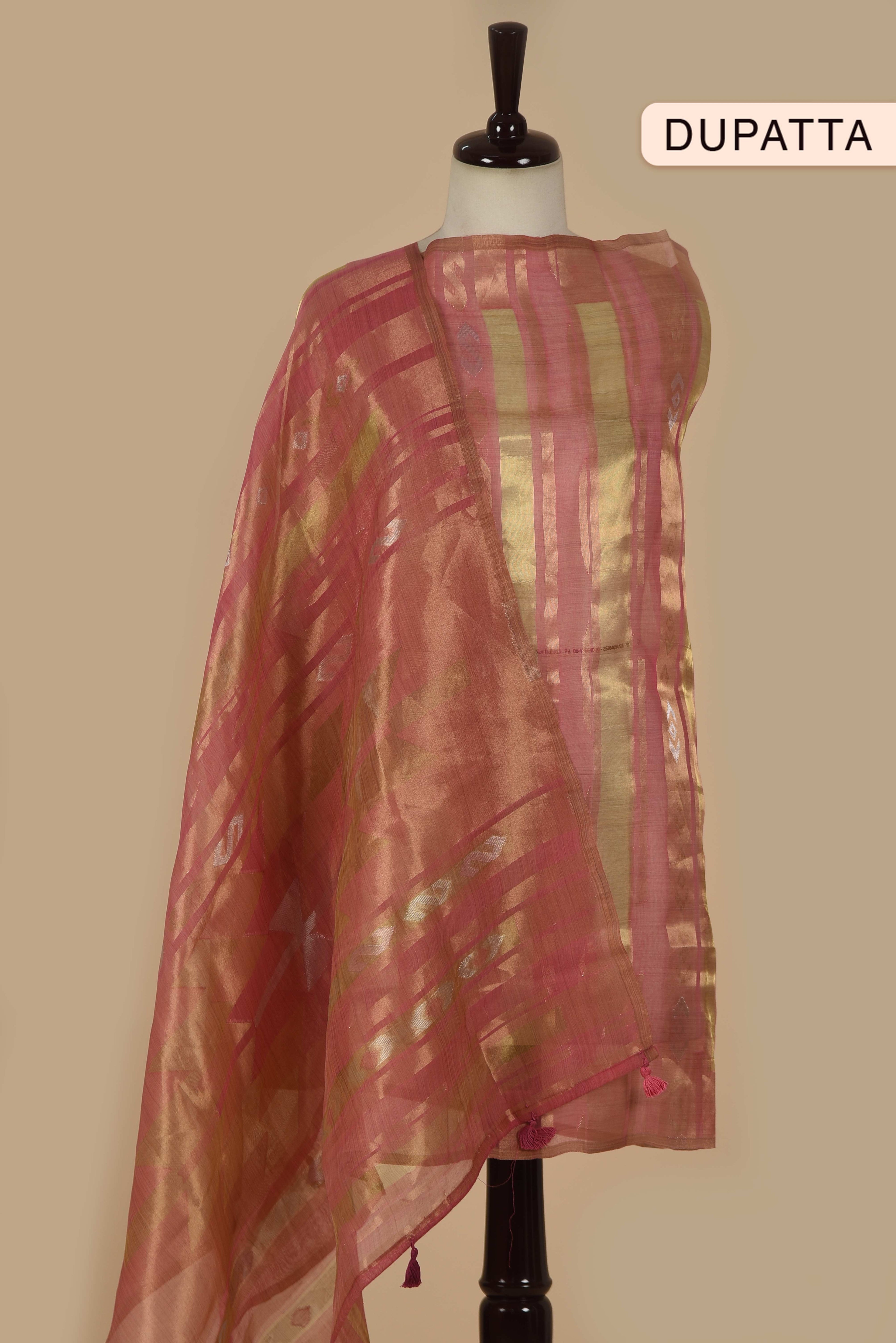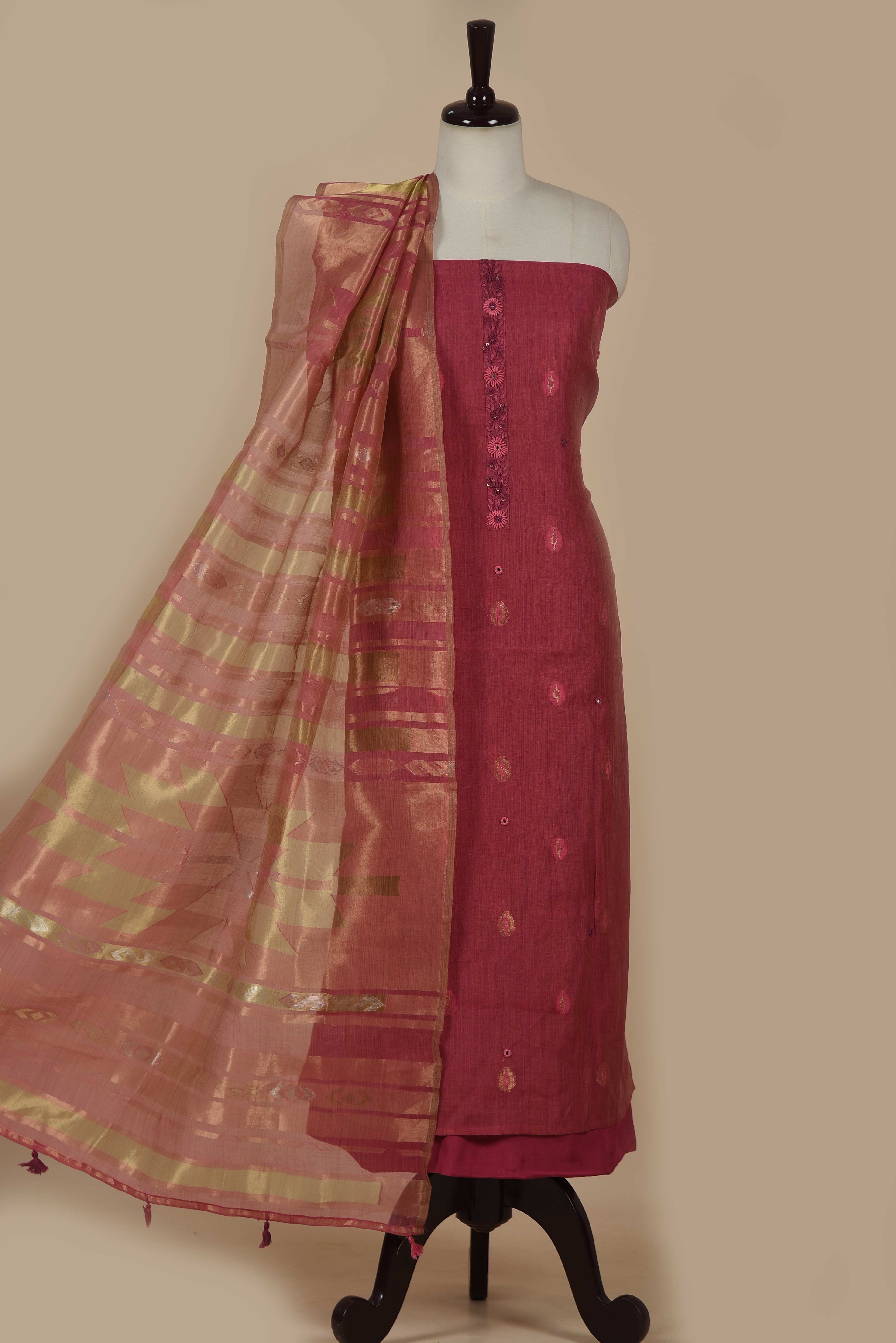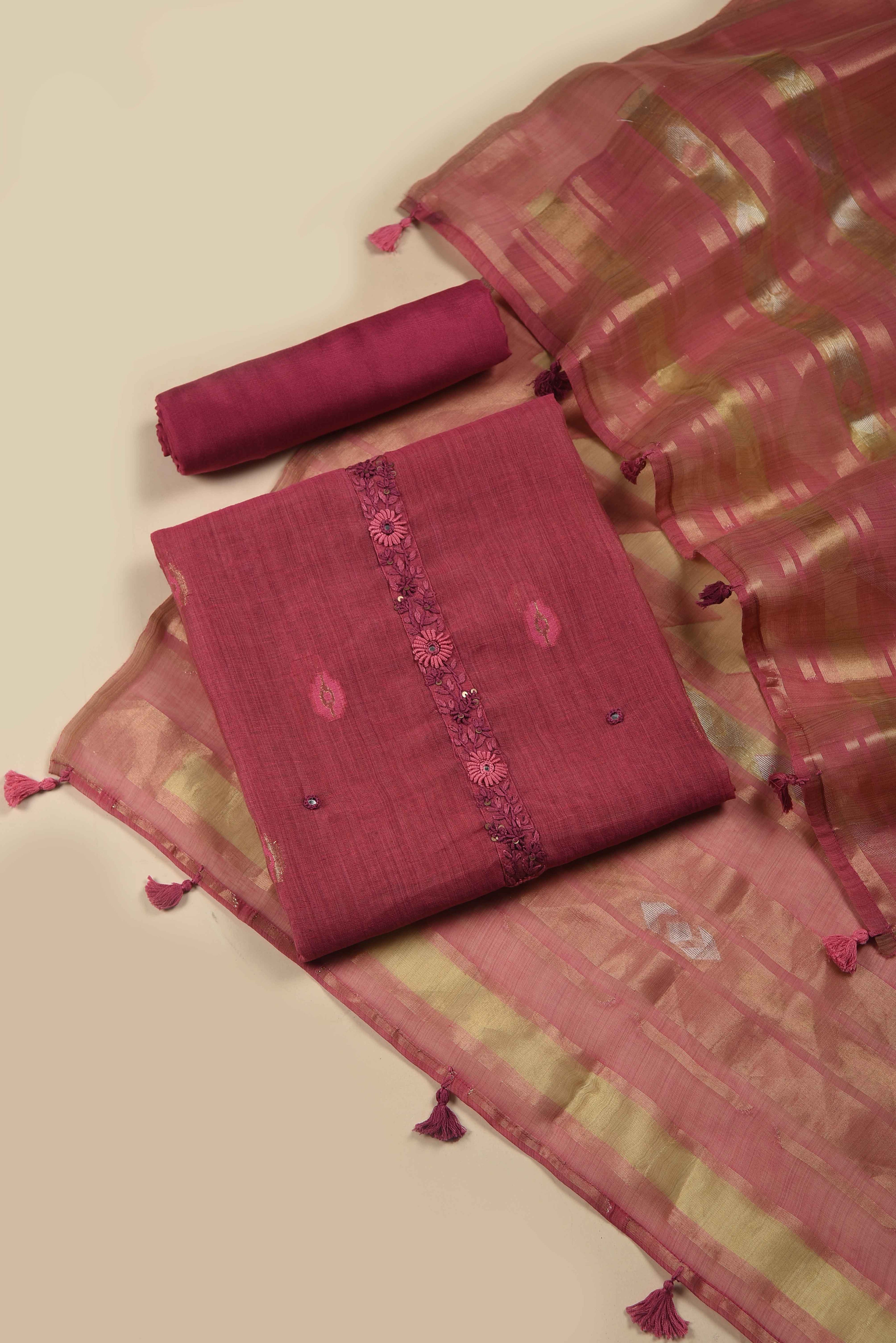 - This Pink Chanderi unstitched suit fabric set combines elegant woven craftsmanship with intricate Kantha embroidery, complemented by a matching Chanderi woven dupatta.