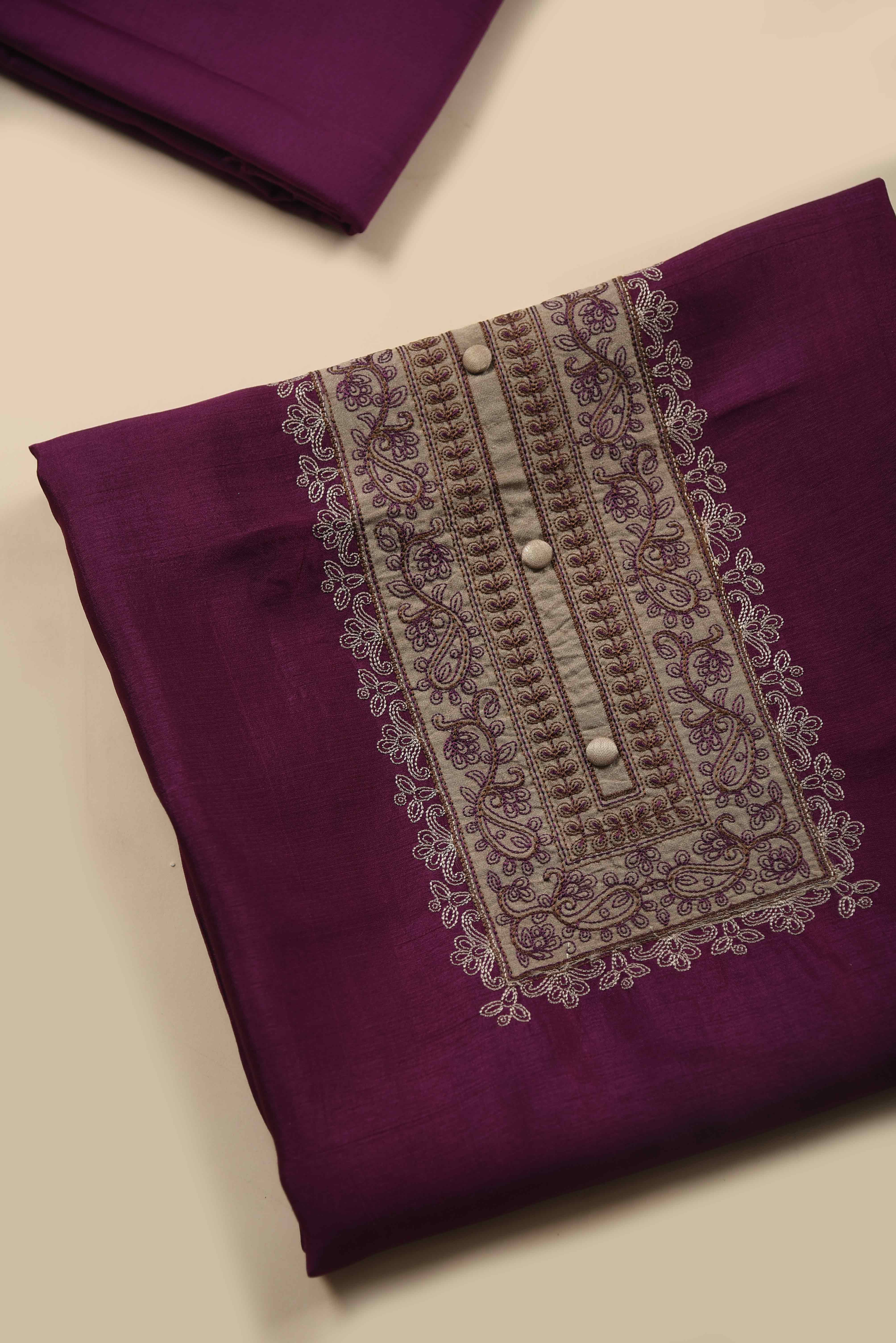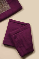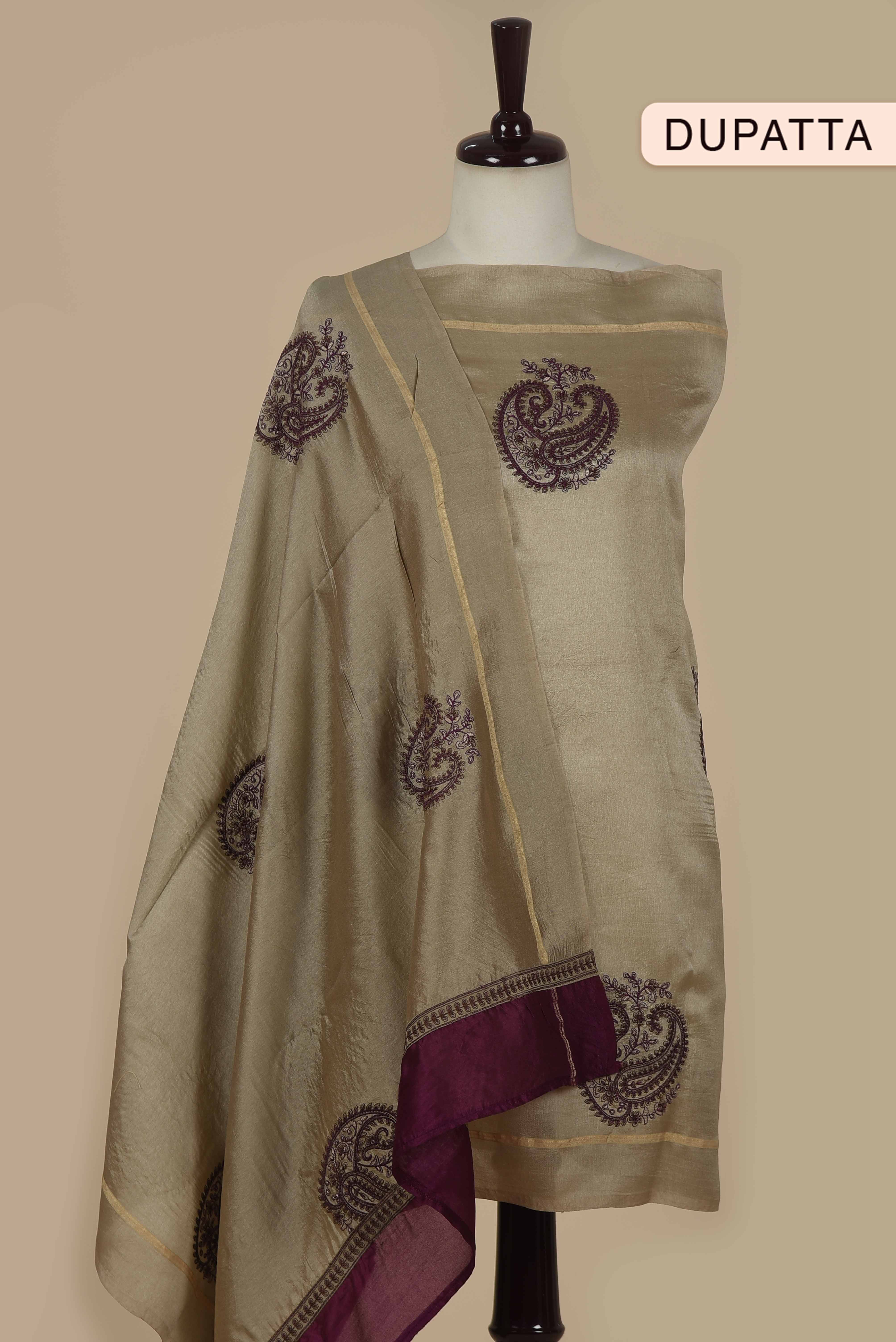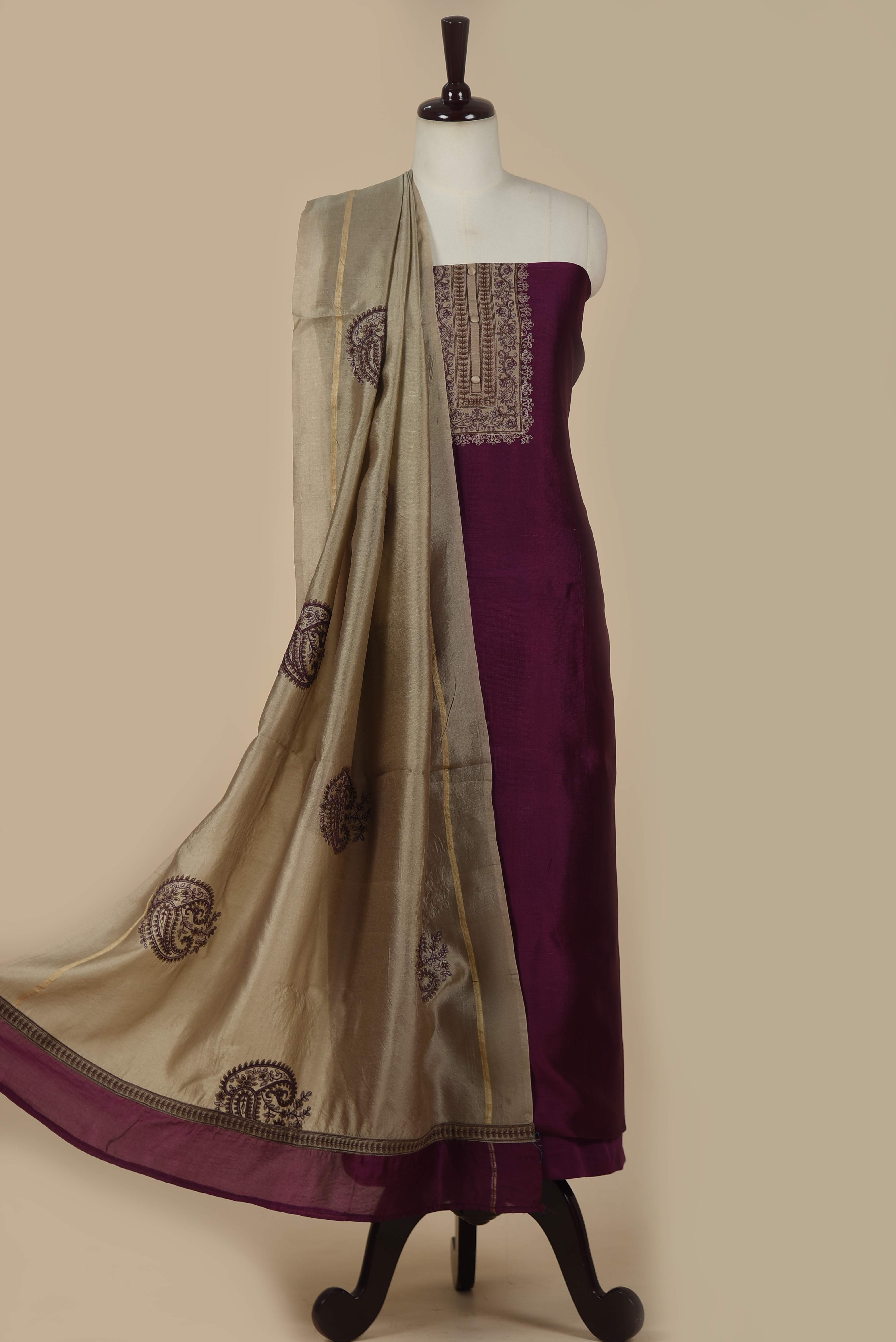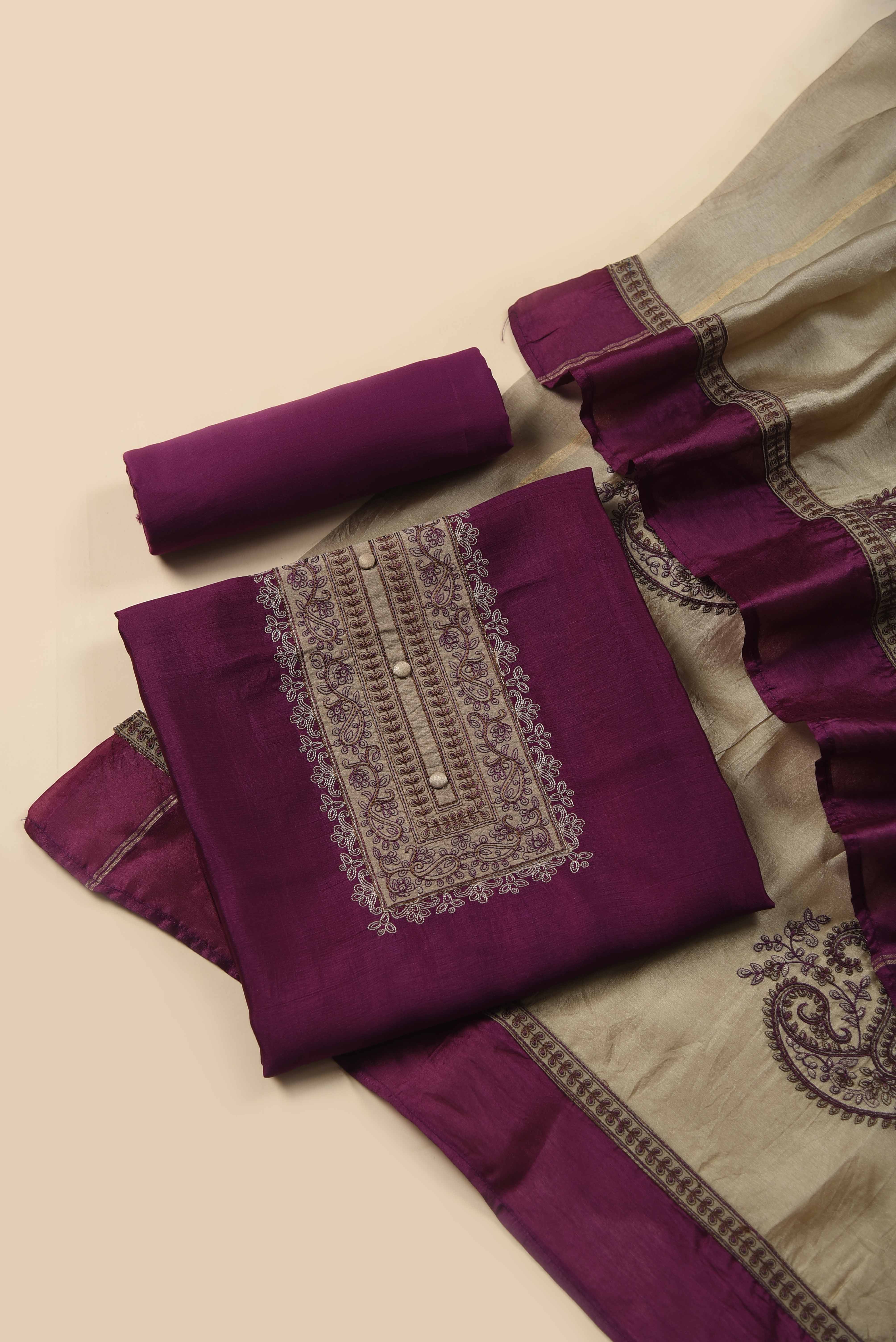 Purple Tussar Silk Thread Embroidered Unstitched Suit Fabric Set with Tussar Silk Embroidered Dupatta