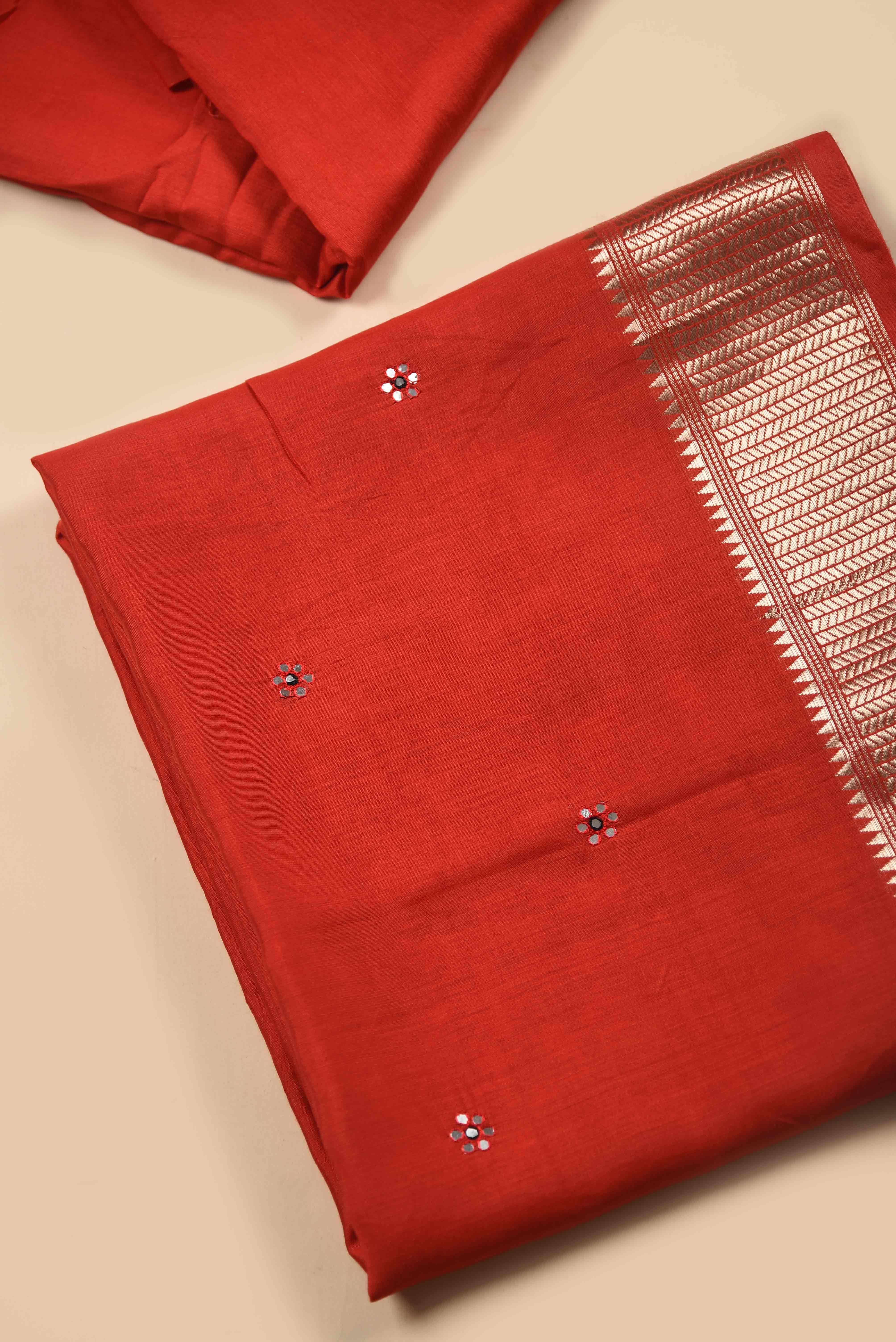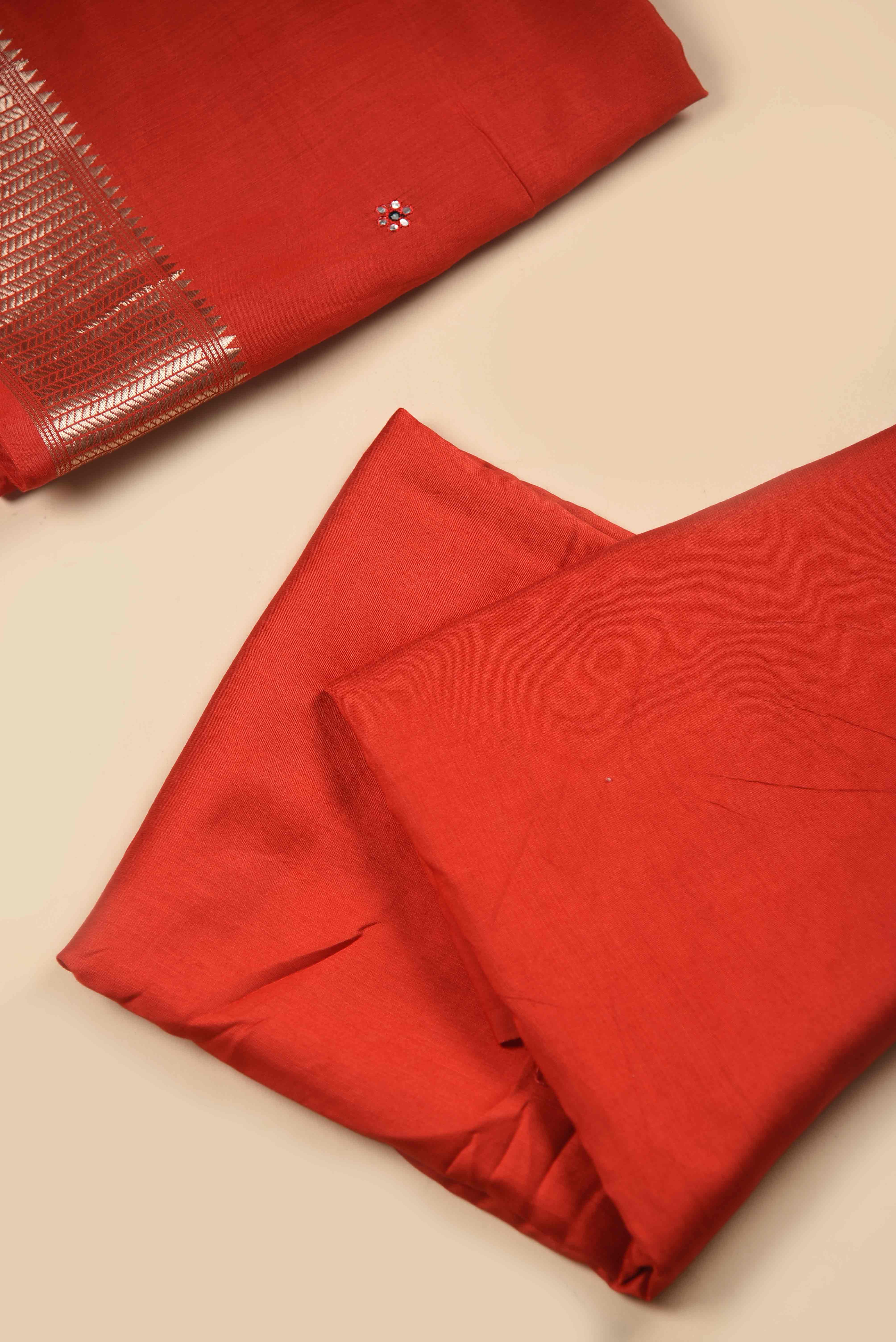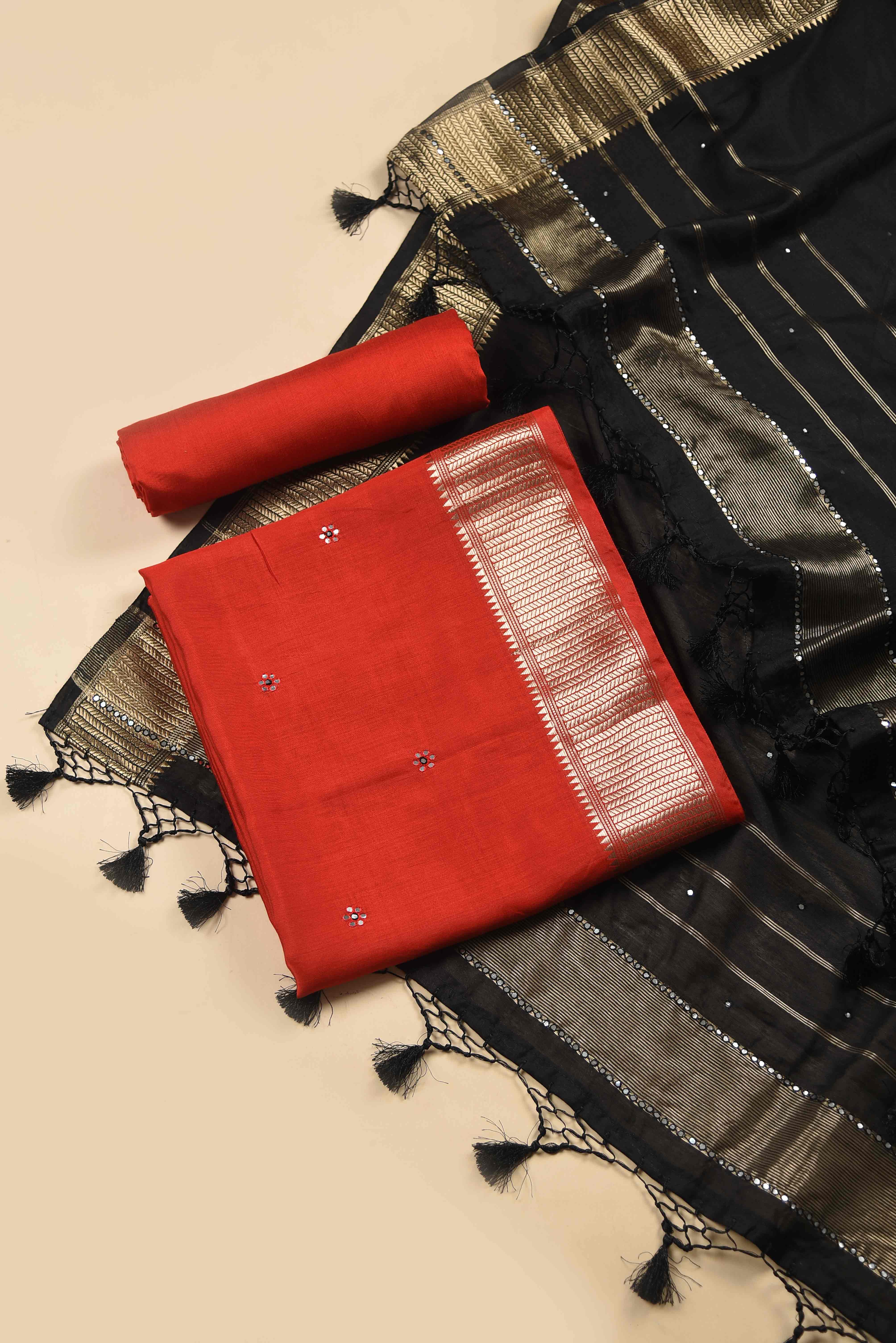 - Embrace festive glamour with this stunning Red Silk Blend Woven unstitched suit fabric set, adorned with intricate mirror work on the kurta that catches light beautifully.