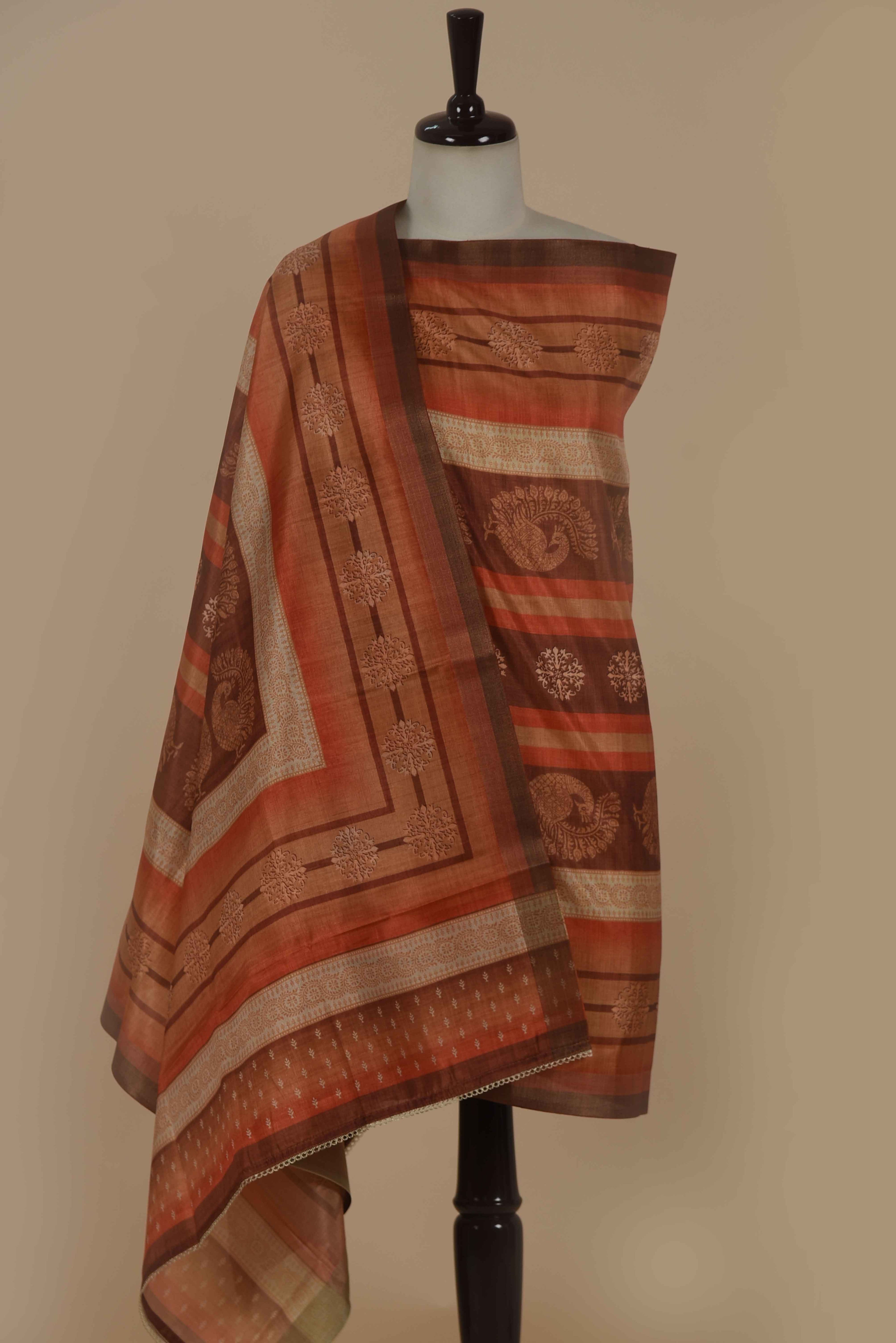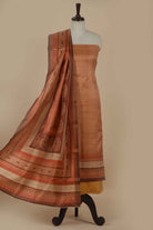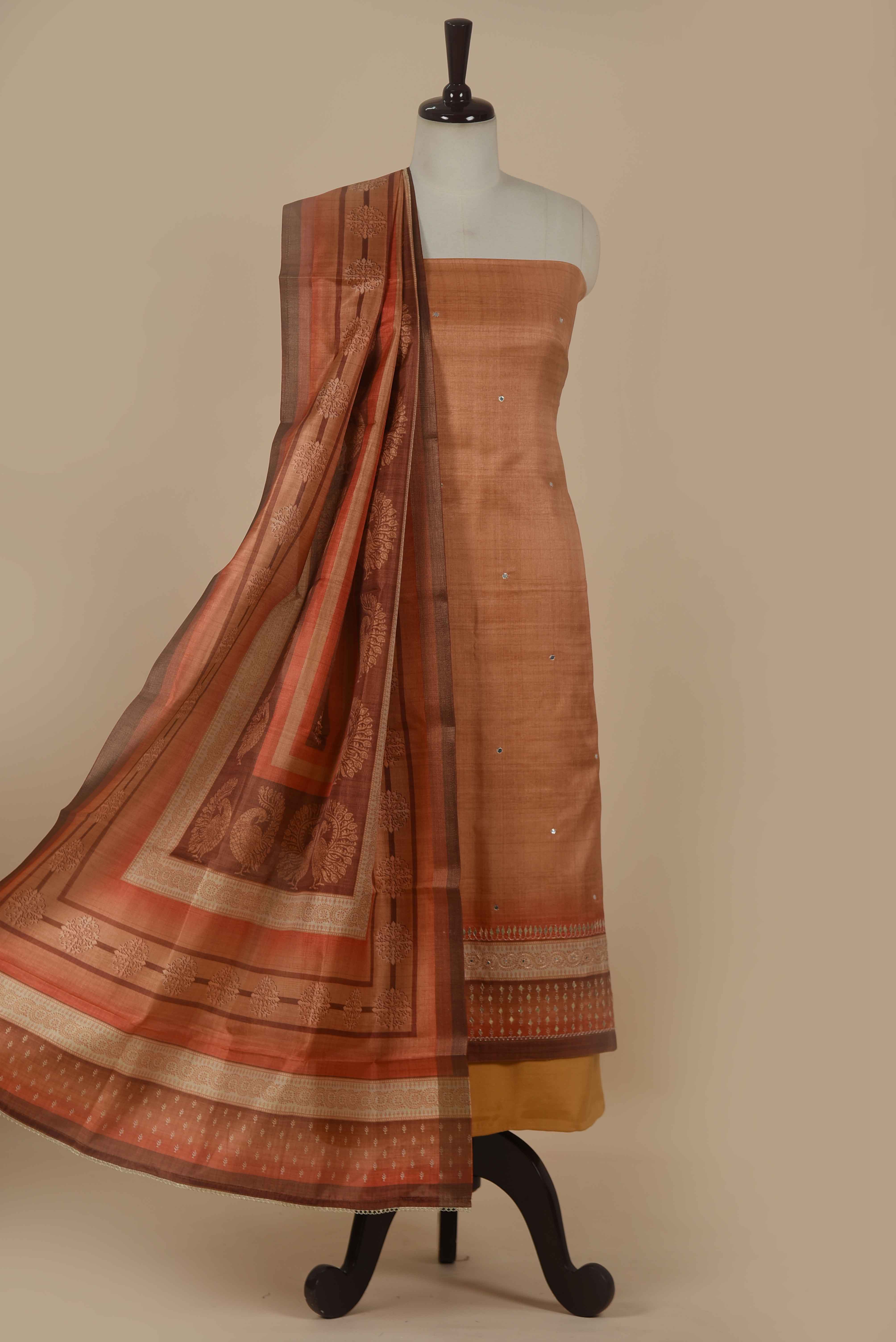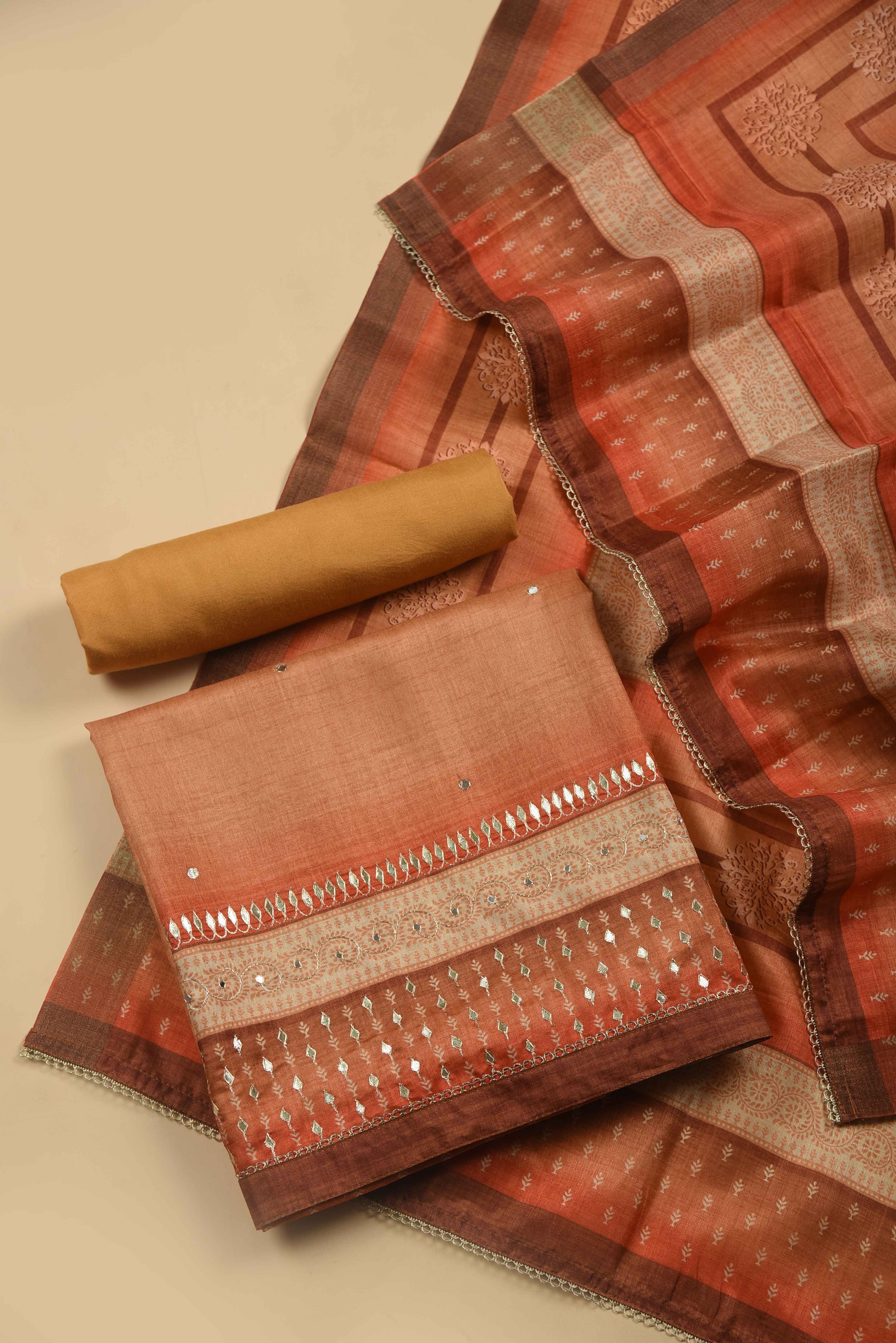 - Rust Silk Blend Printed & Embellished Unstitched Suit Set with Silk Blend Dupatta Elevate your ethnic wardrobe with this sophisticated Rust Silk Blend Unstitched Suit Set, a graceful blend of tradition and style.