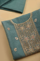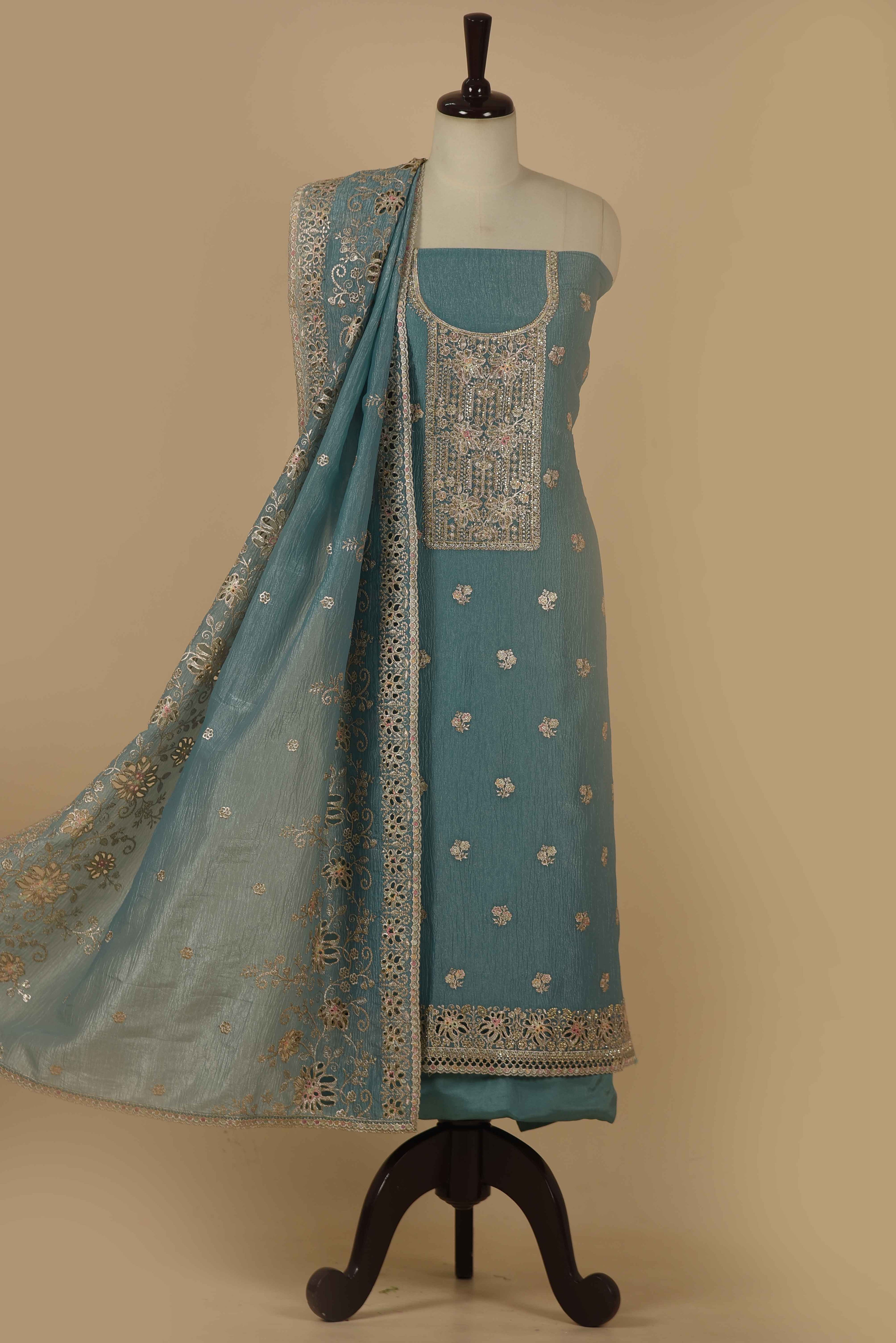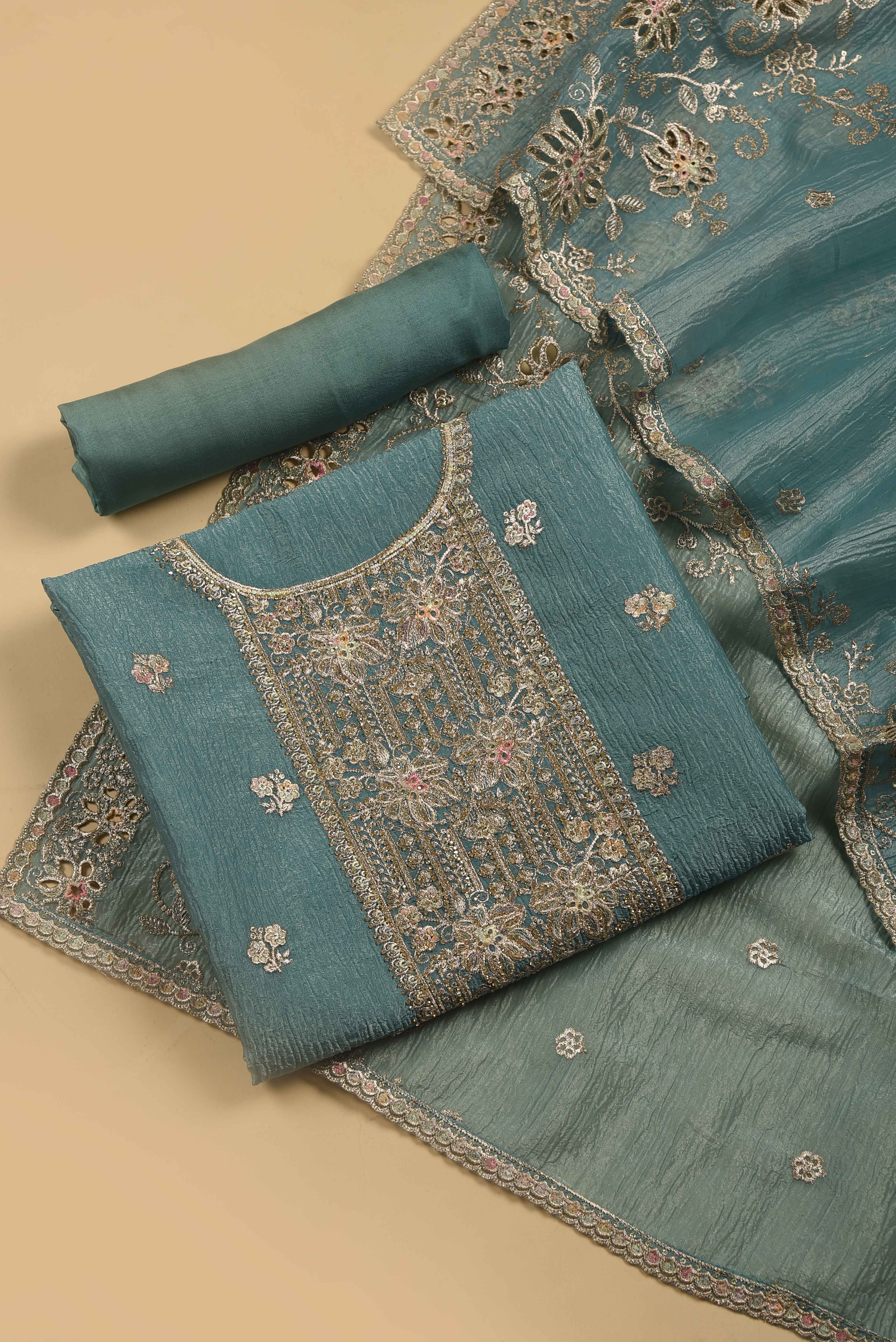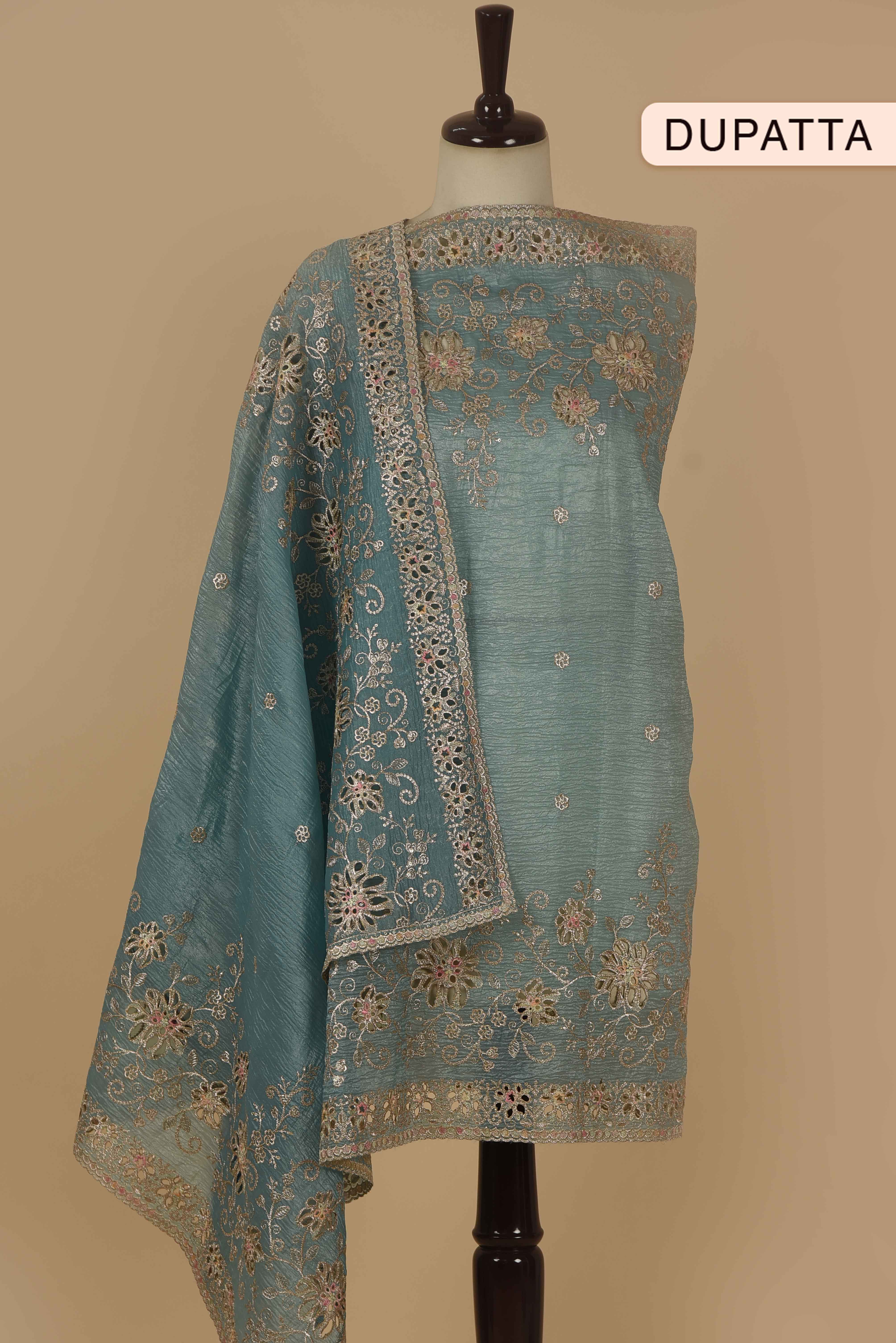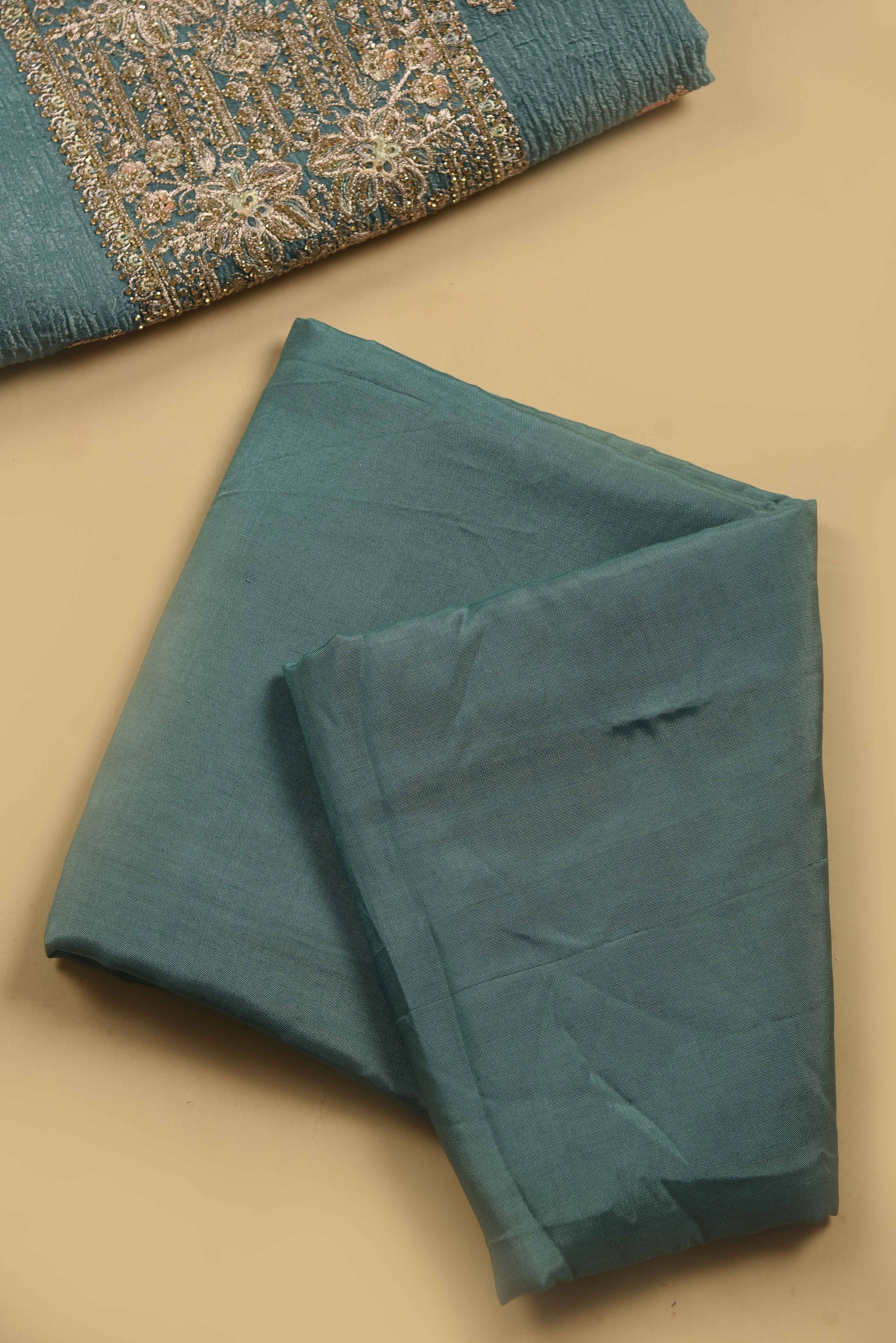 Turquoise Crushed Silk Embroidered Unstitched Suit Fabric Set with Silk Embroidered Dupatta