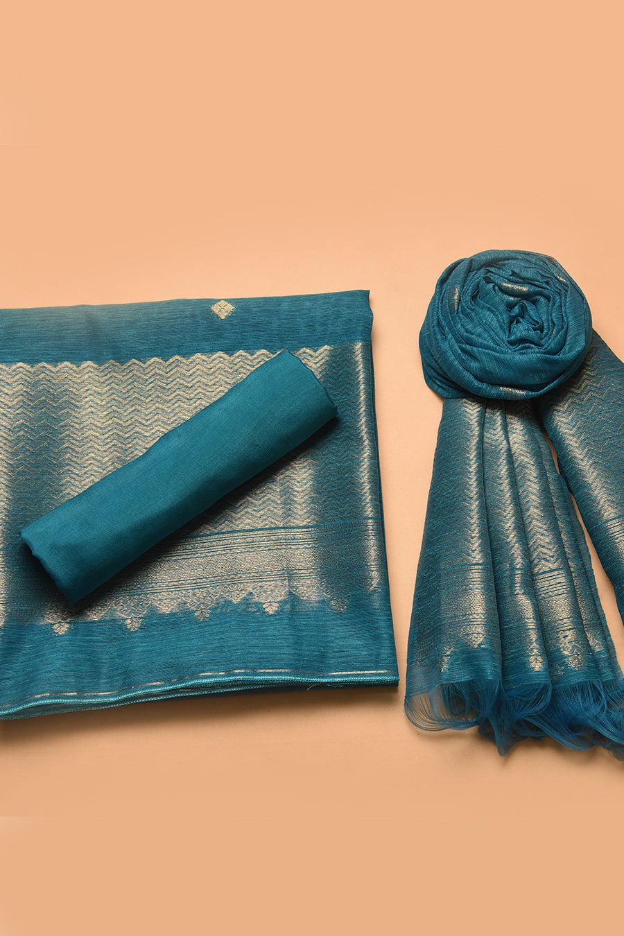 Turquoise Linen Silk Blend Woven Unstitched Suit Fabric Set With Linen Silk Blend Woven Dupatta